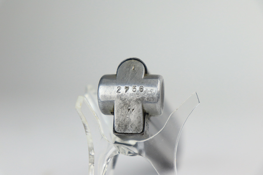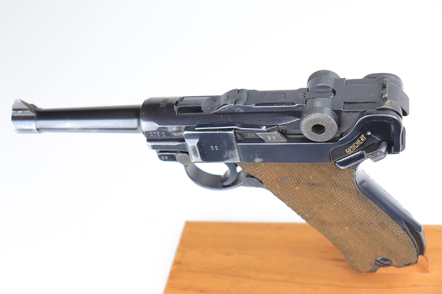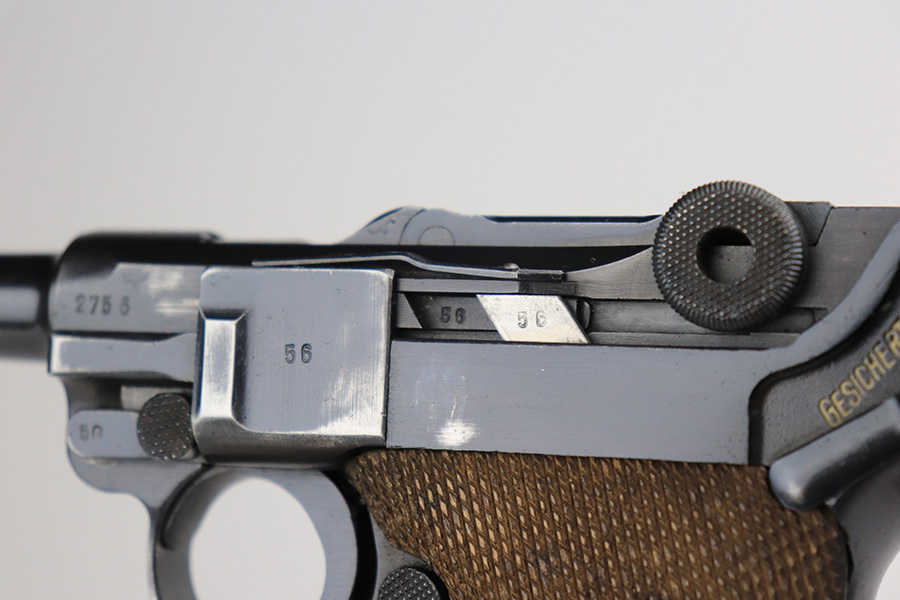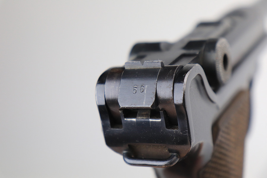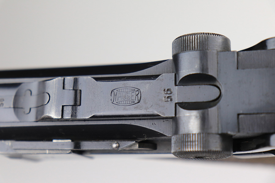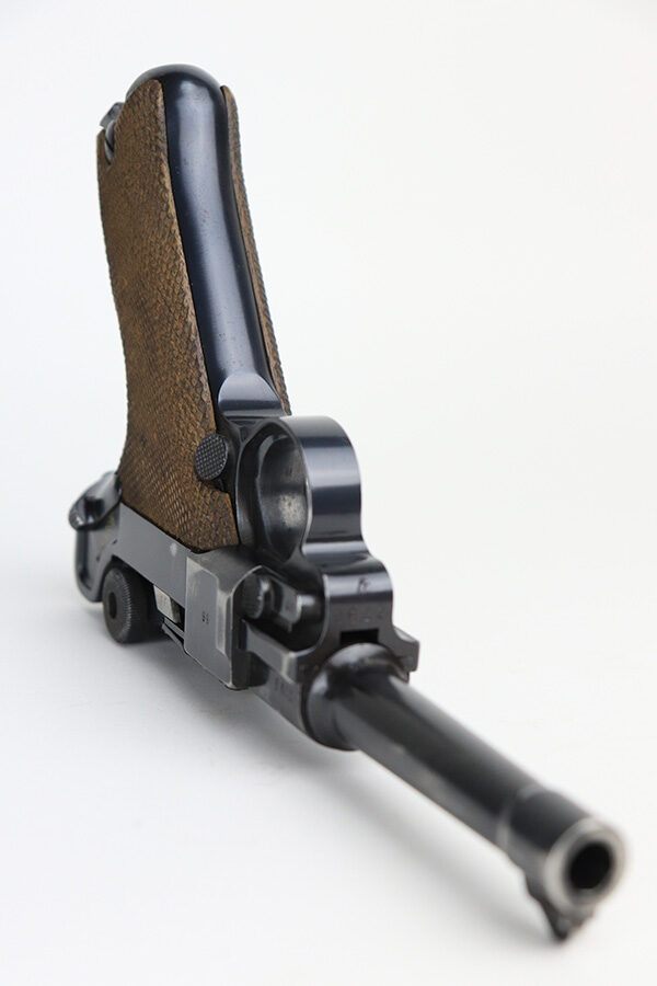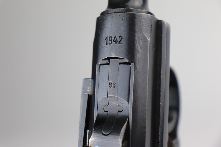 11/30/21 – This is a very nice example of a Mauser Banner Luger issued to the Nazi police force in 1942. It is all matching, has the Mauser banner logo on the toggle, has the proper Nazi police “Eagle L” proof on the right side of the slide, and has an added police sear safety. Only about 4,700 guns of this variation were produced. This one also comes with a matching-numbered magazine. The gun has retained about 93-94% of its original finish. Most of the wear is on the left side, concentrated around the muzzle, on the barrel, on the side plate, and on the left side of the frame. There is also very minor wear on the right side of the muzzle and front edge of the right side rail. Very minor freckling on both grip straps. Comes with excellent matching-numbered wood grips. The bore is very shiny with strong rifling and some very light freckling in the grooves.