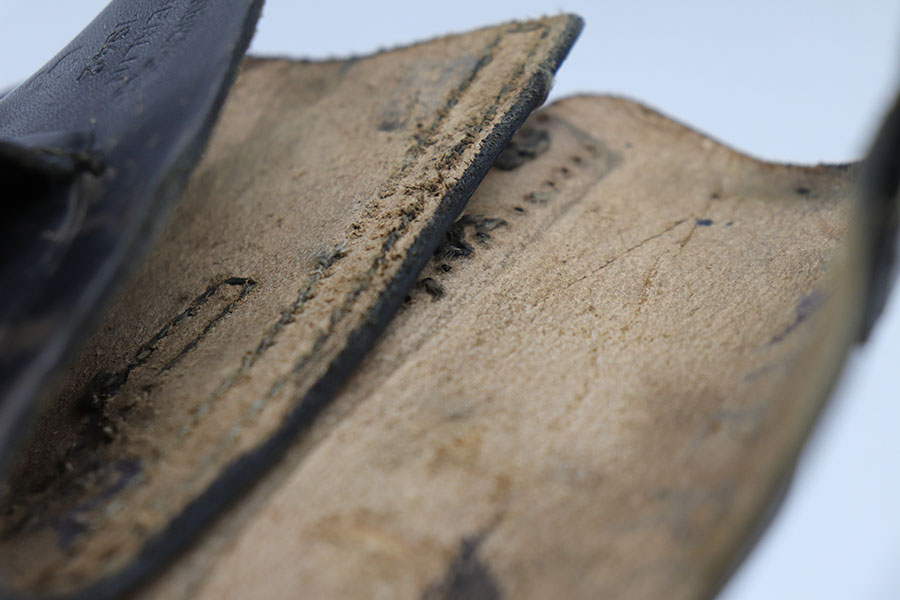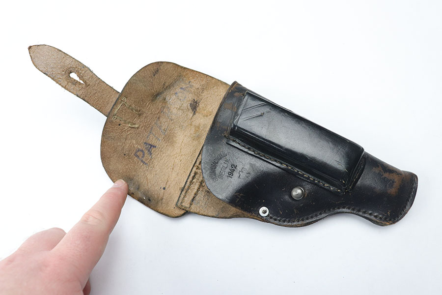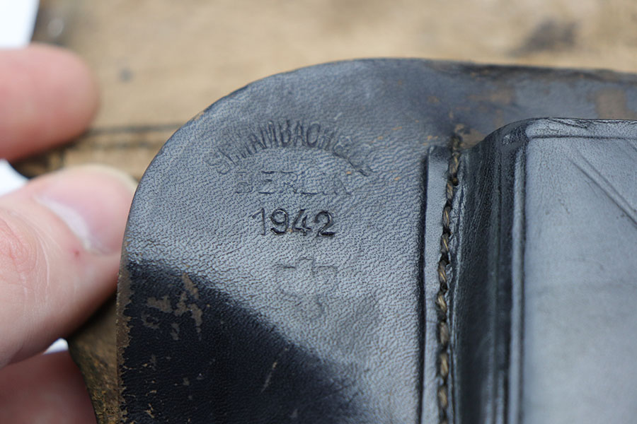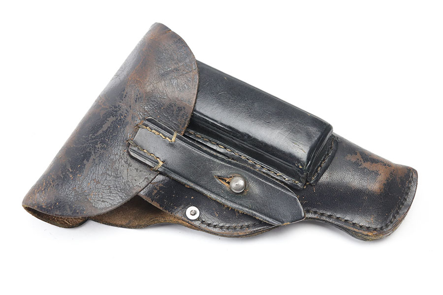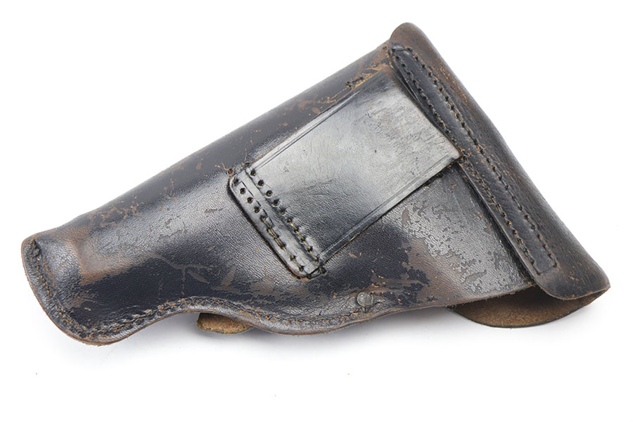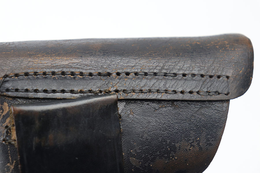 10/26/21 – This is a 7.65mm police pistol holster from WW2. Great for a Sauer 38h, Mauser HSC, or Walther PPK. The holster is maker stamped, police eagle stamped, and dated under the closure strap. The leather has some mild exterior scuffing and signs of previous use. The stitching at the top hinge (lid and body of leather) is missing. See photos.