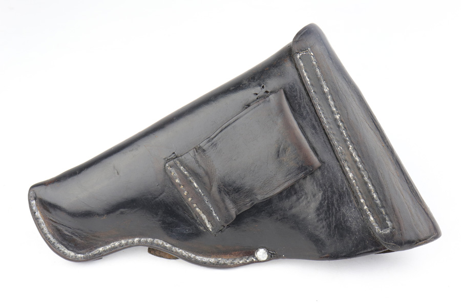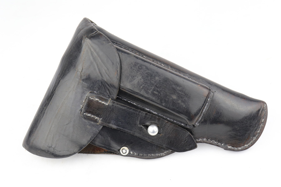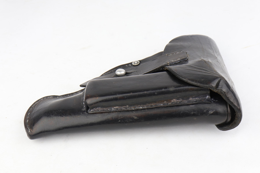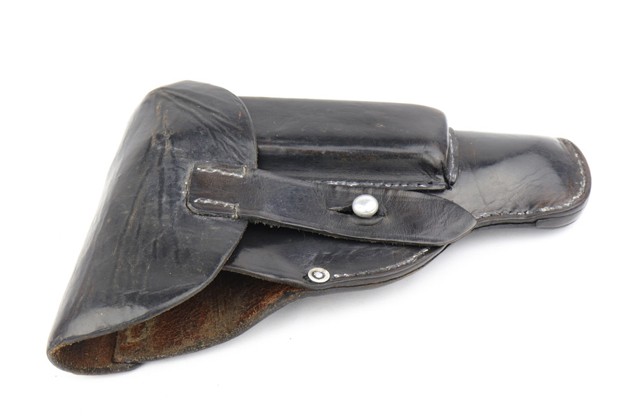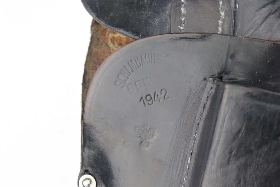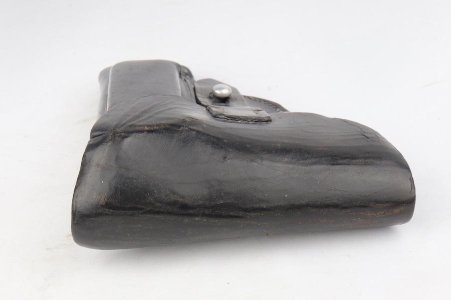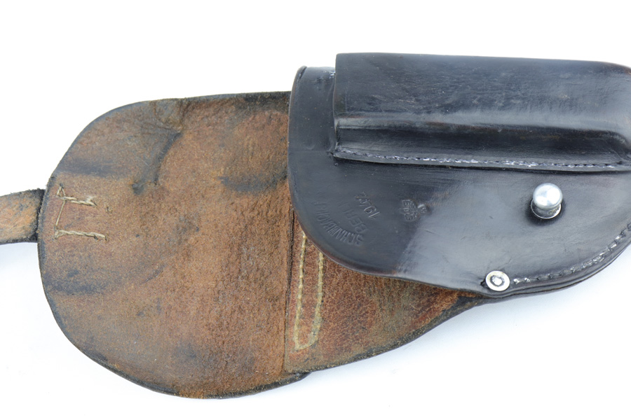 3/22/19 – This is an original WW2 era 1942 dated police holster that would fit a PPK or similar sized 7.65mm pistol. The holster has black leather with normal wear and original stitching. The back strap has been riveted to the holster – likely a late war or post-war repair (looks old). Maker stamped, police stamped, and dated under the closure strap. Guaranteed original.