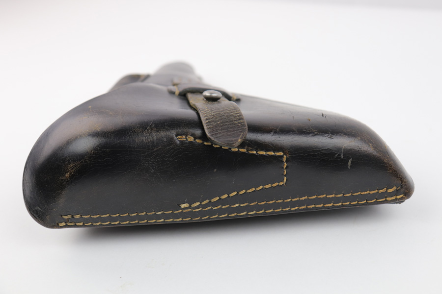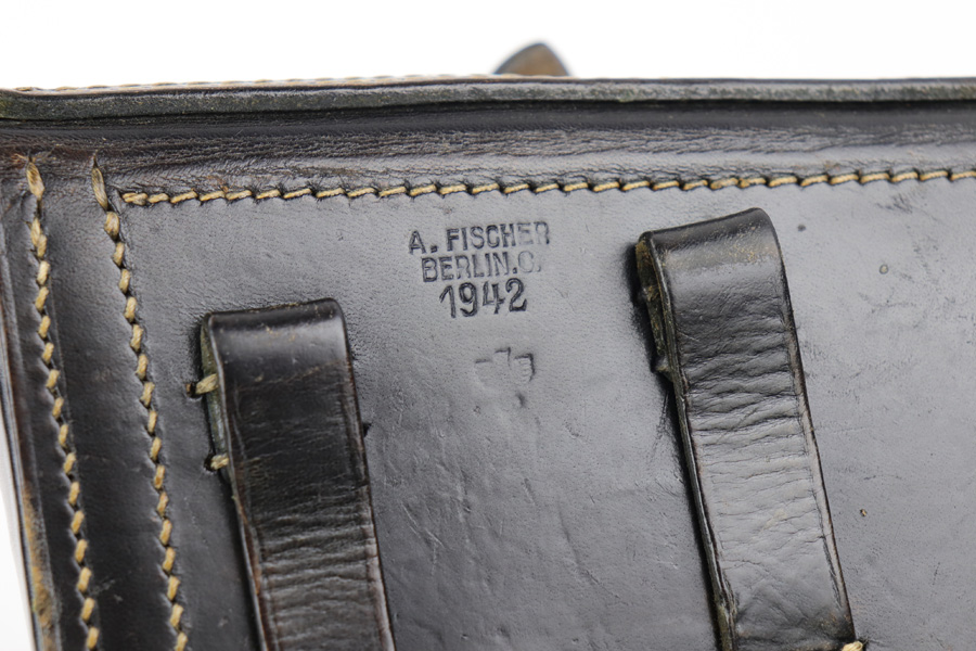 7/31/19 – This is an original 1942 dated holster for a police issued P.08. The holster is maker stamped and dated on the back leather with a police eagle proof stamp. The leather is excellent and very clean despite some minor, normal wrinkling in the leather. Stitching is all original and in tact as well. A very nice, high end collectible police luger holster.