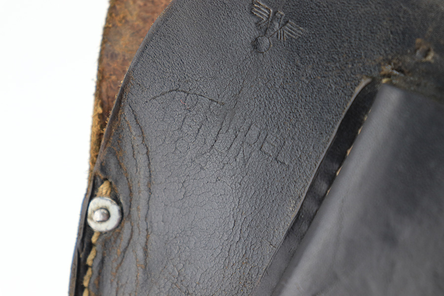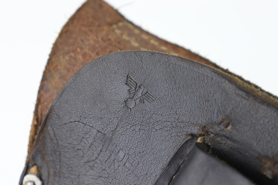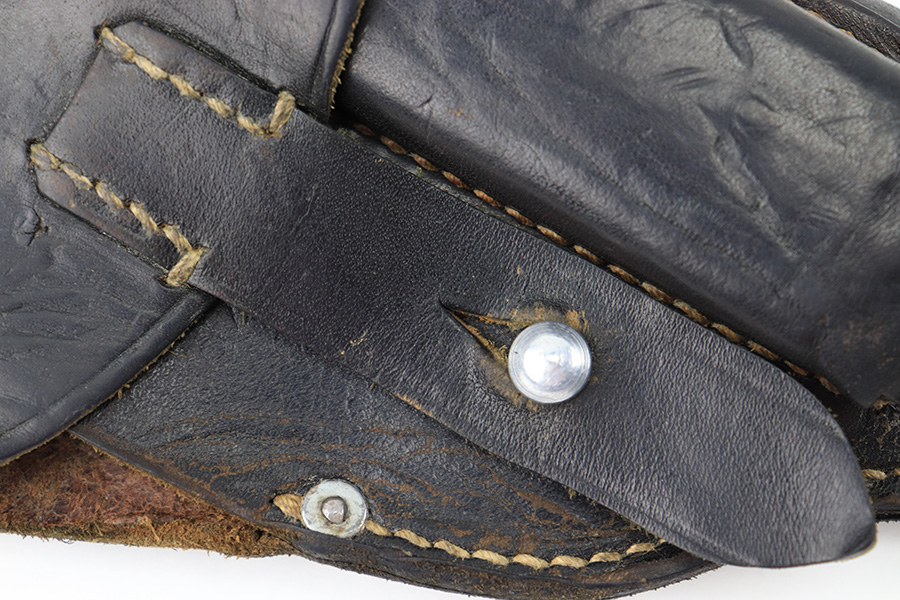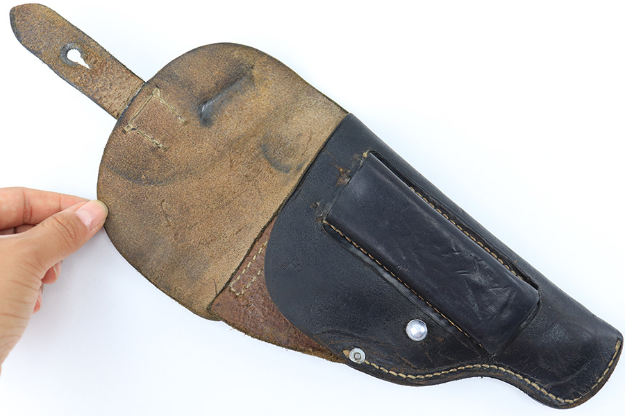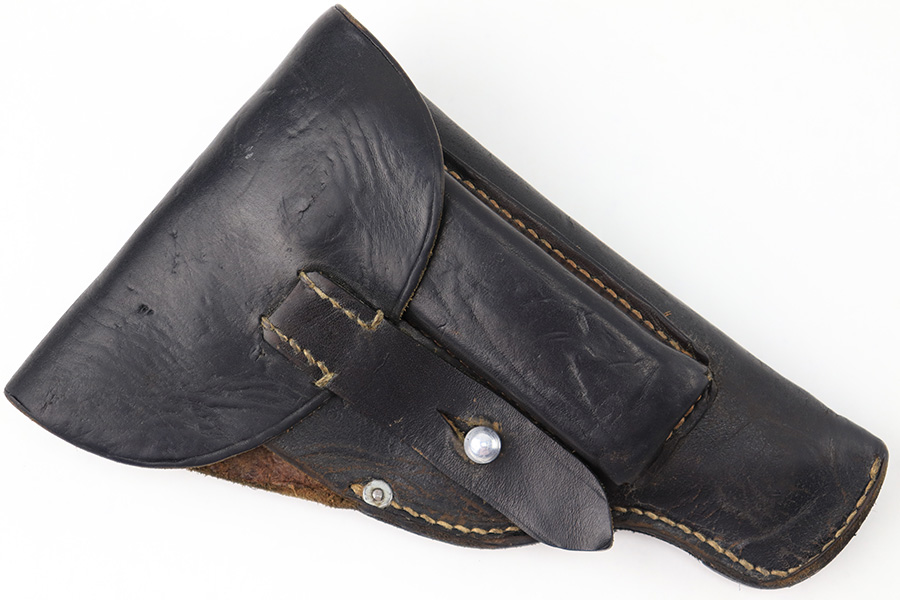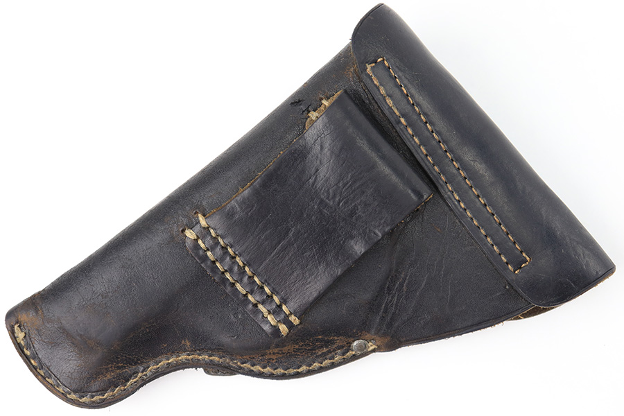 8/17/23 – This is an original 1942 dated Police holster for a Walther PPK or similar sized 7.65mm Axis Police pistol (Sauer 38h). The holster is in great overall condition with normal signs of wear and aging throughout. The leather is soft and pliable as a result, and the front maker and date stamp are faded with age. The police proof stamp is more clearly visible, as shown. The stitching is tight and original throughout with no issues.