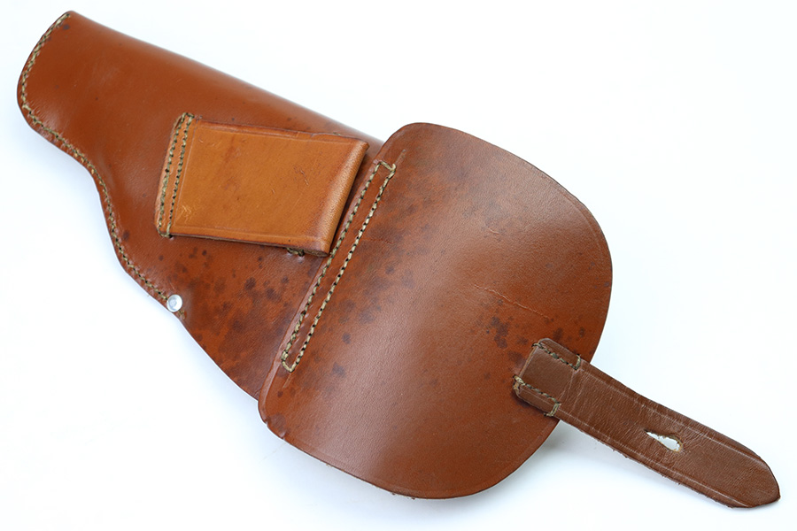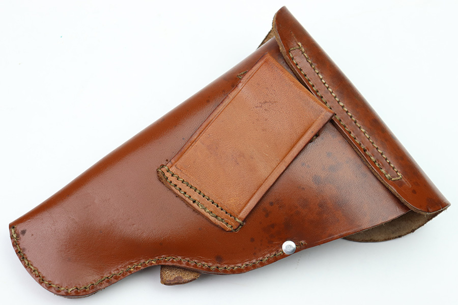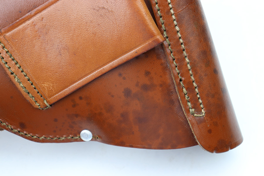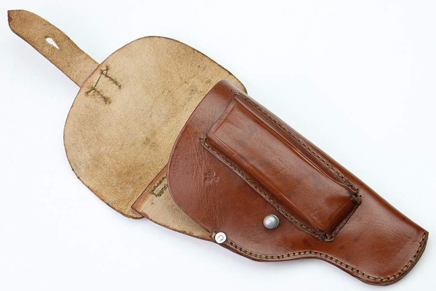 8/4/22 – This is an excellent, unissued condition Police Walther PPK holster. The holster is maker stamped, dated, and police eagle stamped under the closure strap. The leather is crisp and very clean throughout, with some mild surface stains on the front and back leather. No stitching issues. A Walther PPK fits, but it’s very snug because the leather is “like-new” condition.