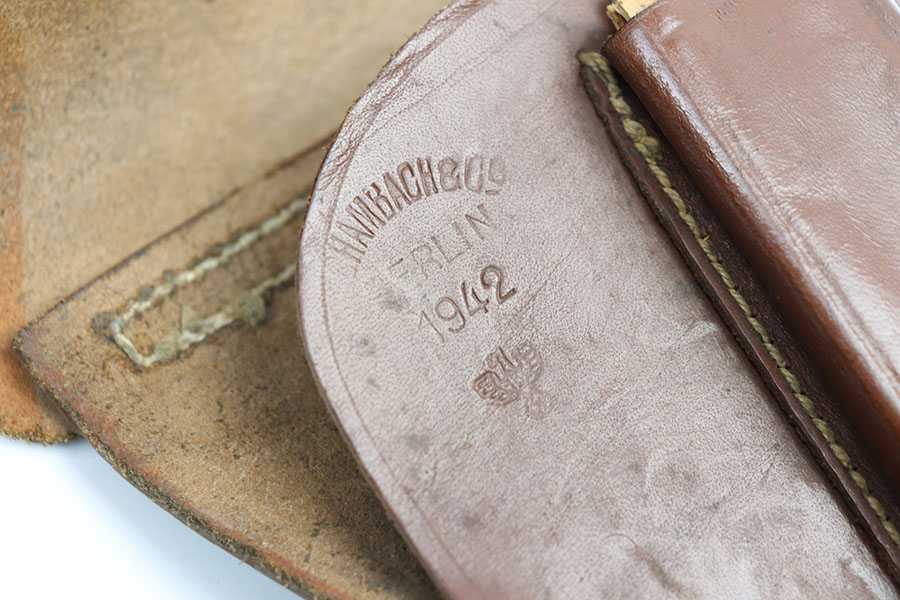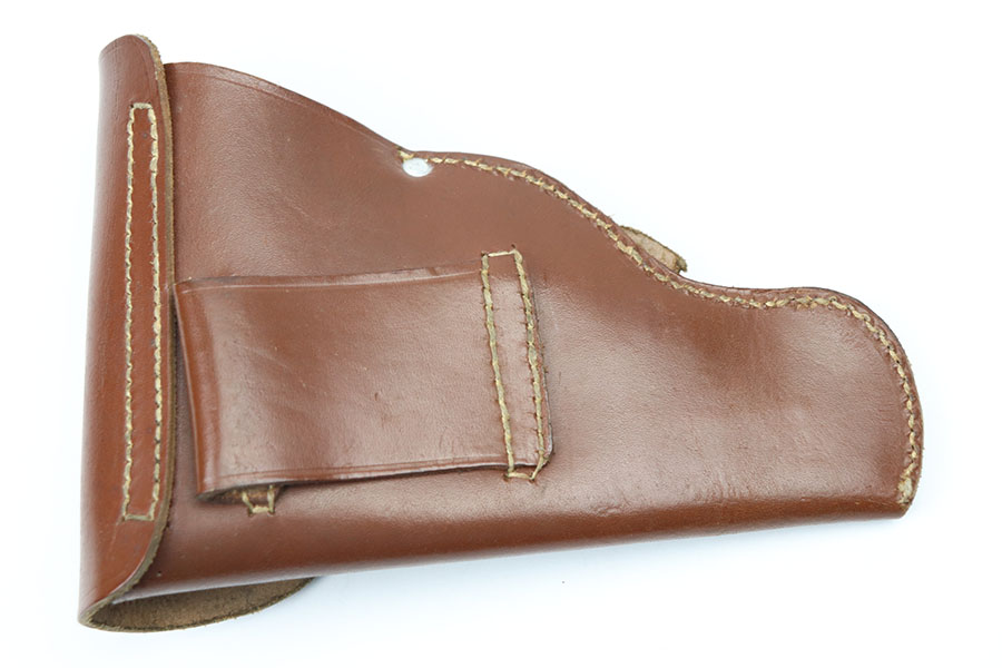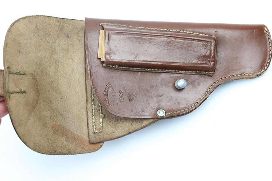 1/27/21 – This is a minty condition police holster made in 1942. The holster is for a Walther PPK, but a PPK fits extremely snug into this leather. This is likely due to the leather being stiff after not having held a pistol for some time. Should loosen up if you leave your PPK inside overnight. Clean leather and stitching and stamped under the closure strap.
