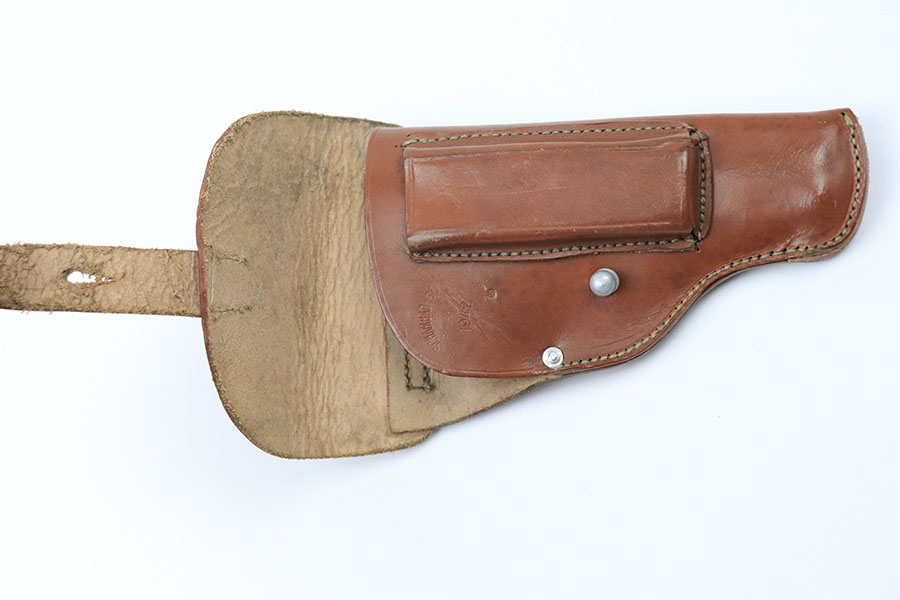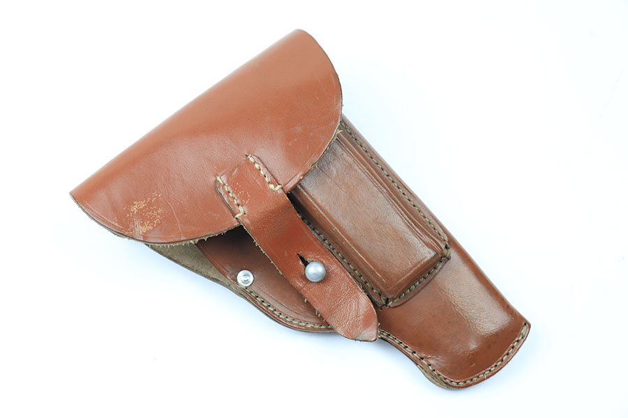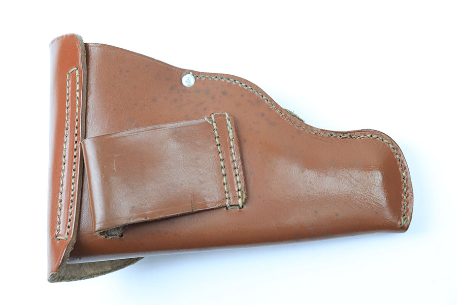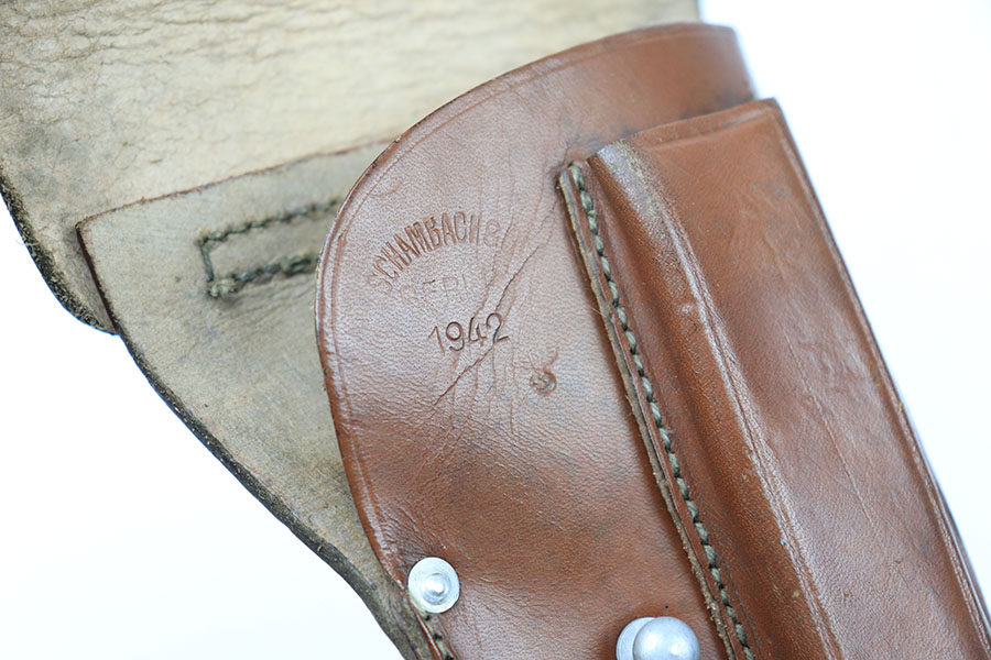 10/6/21 – This is an original 1942 dated Walther PPK police holster. The holster has a faint maker stamp and police eagle under the closure strap, and is 1942 date stamped. The leather is clean and excellent overall, as is the original stitching. Some mild discoloration on the back leather.