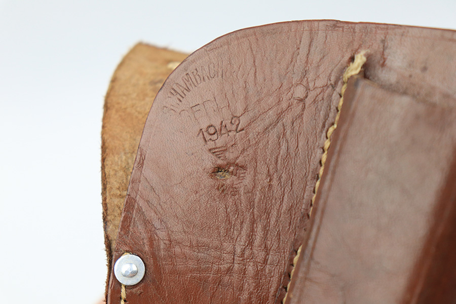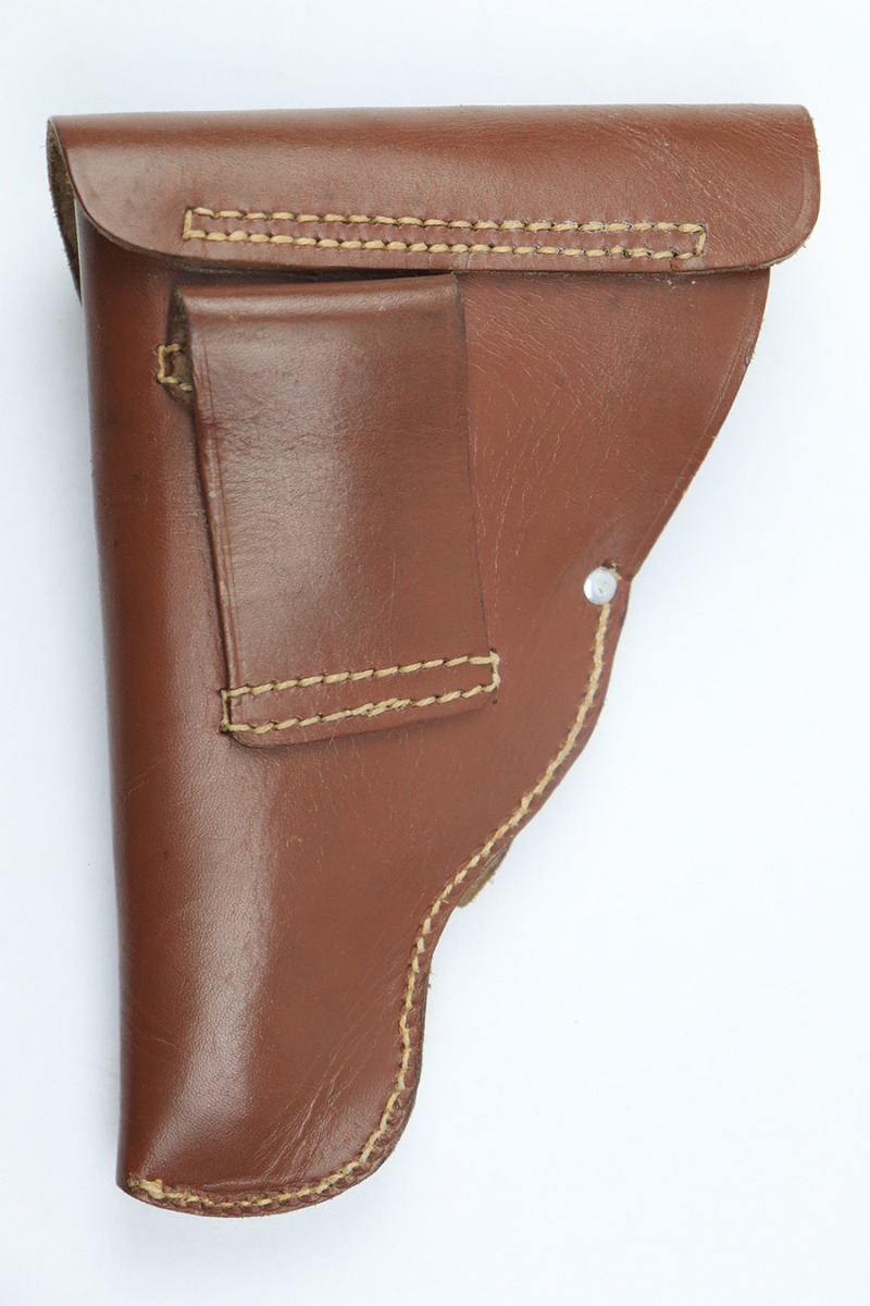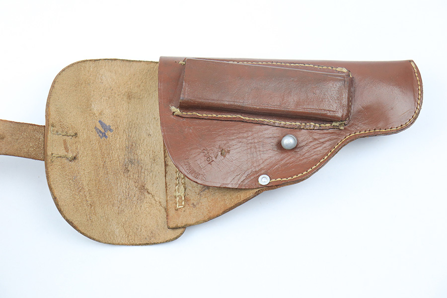 1/29/22 – This is a police Walther PPK holster from WW2. The holster is maker stamped, dated, and police eagle proof stamped under the closure strap. The leather is very clean and in great overall condition. There’s some mild surface wrinkling in various areas throughout the leather. The stitching is all tight and in tact with no issues. Fits a Walther PPK snugly.
