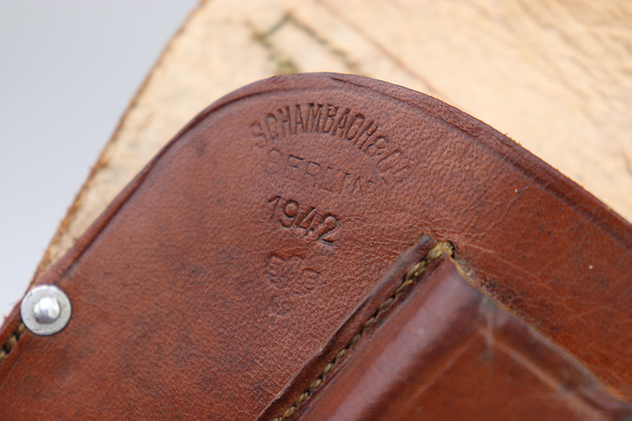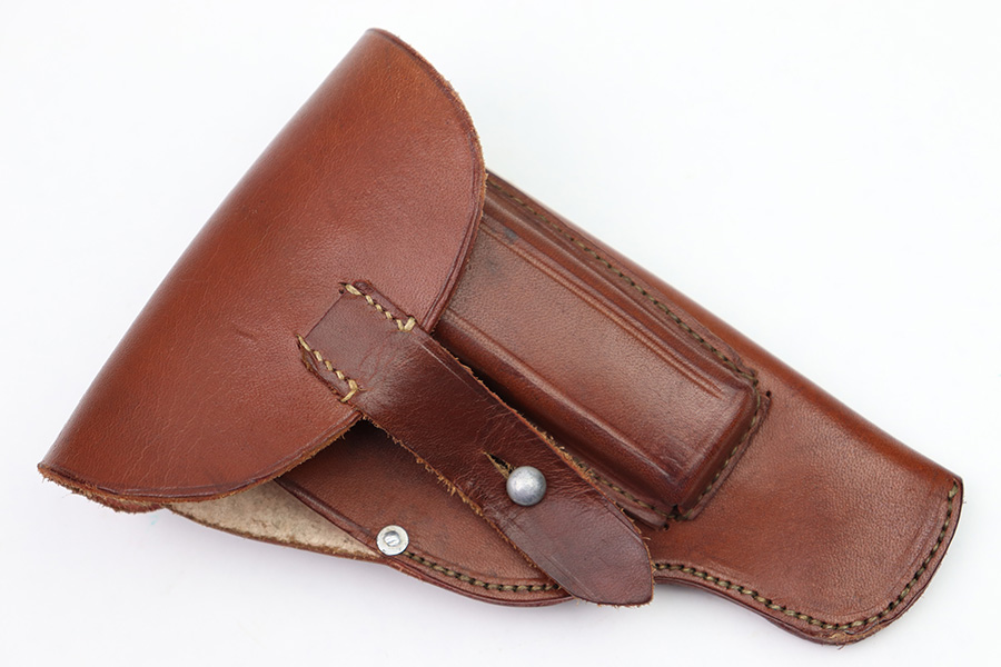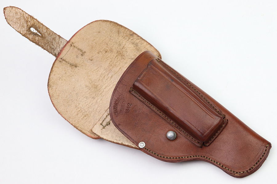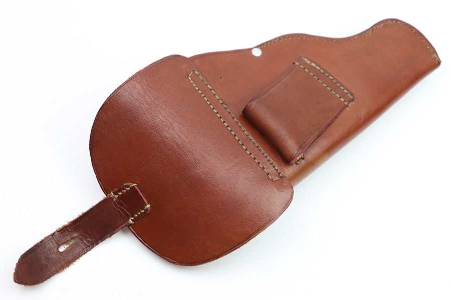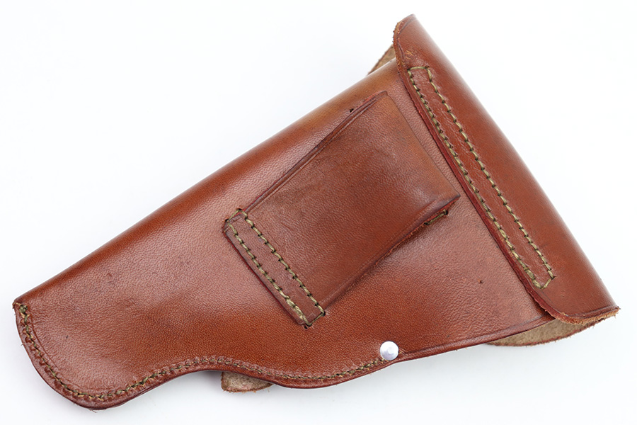 8/3/22 – This is an original, minty condition holster for a police Walther PPK or similar sized Axis pistol. The holster is in minty, unissued condition with very clean and firm leather. Maker stamped, dated, and police proof stamped on the front leather. No stitching issues. A PPK fits very snug but will “break in” over time (if desired).