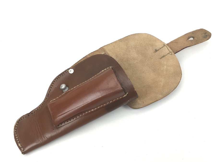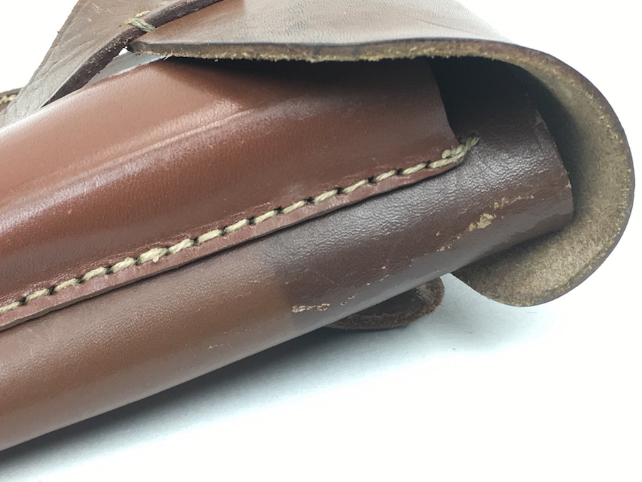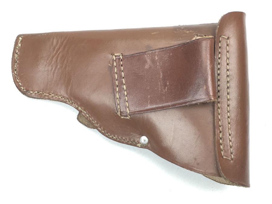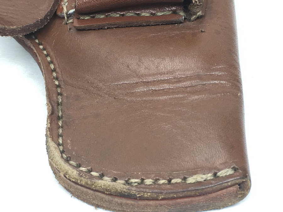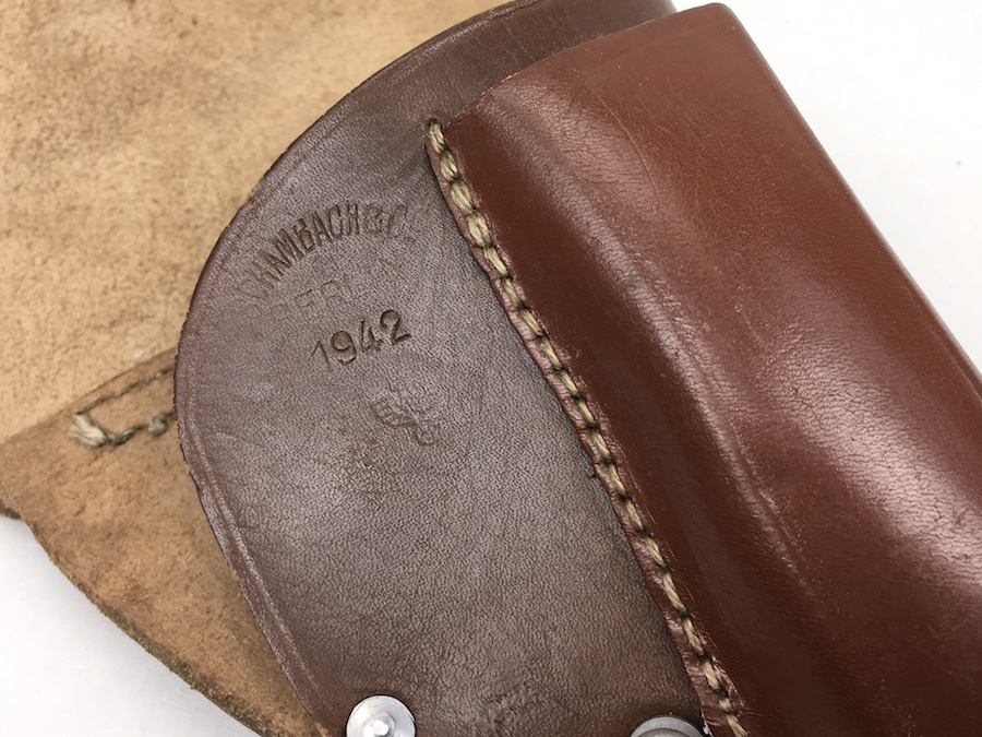 5/28/19 – This is an original 1942 dated Walther PPK (or similar sized pistol) holster. The holster is dated, police eagle stamped, and maker stamped under the closure strap. Some minor scuffs and stains but minty leather is firm and clean. All original stitching. Very hard to upgrade police holster!