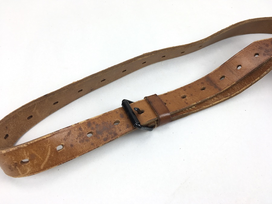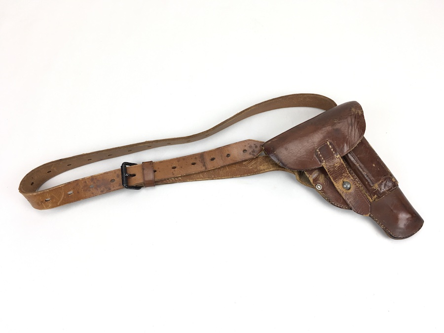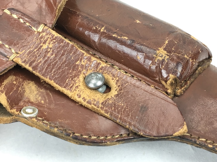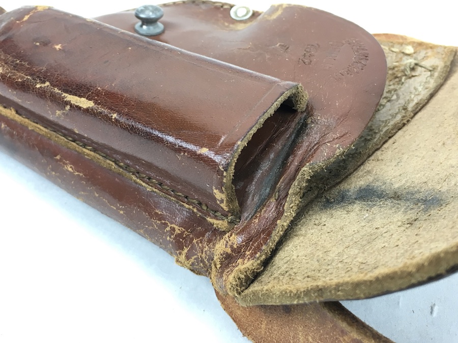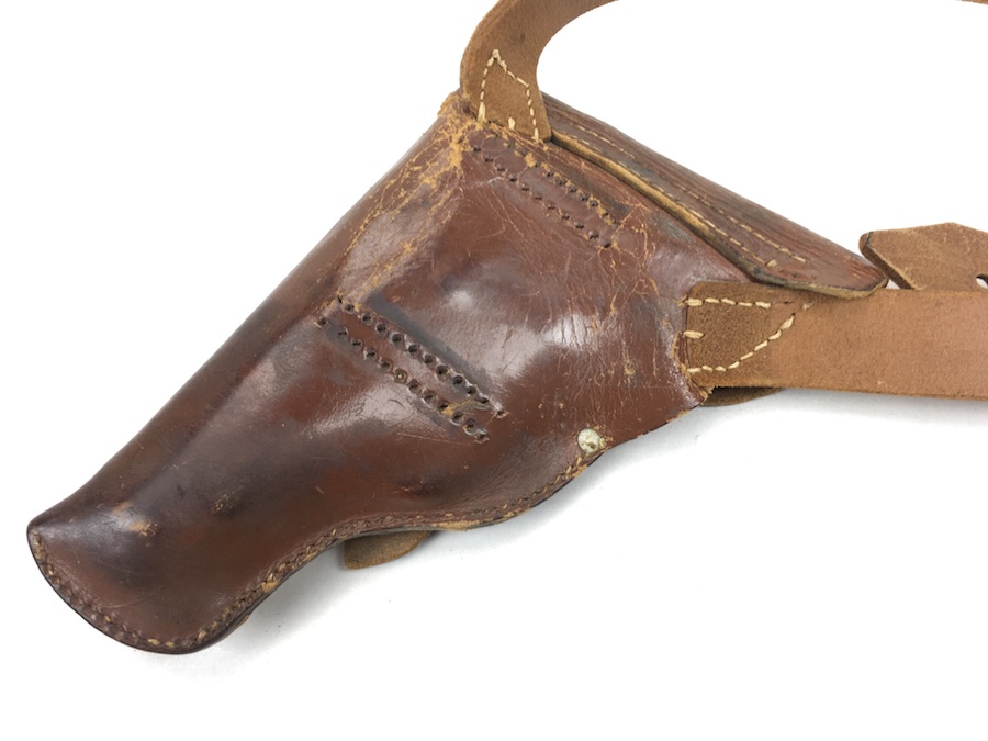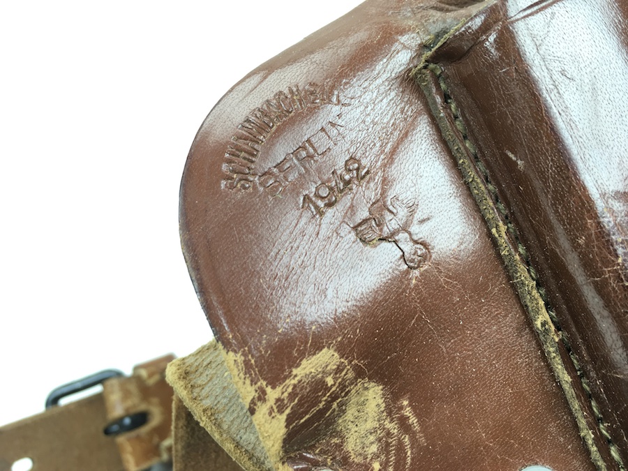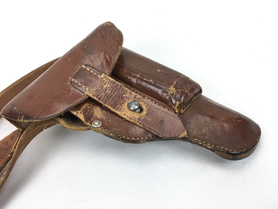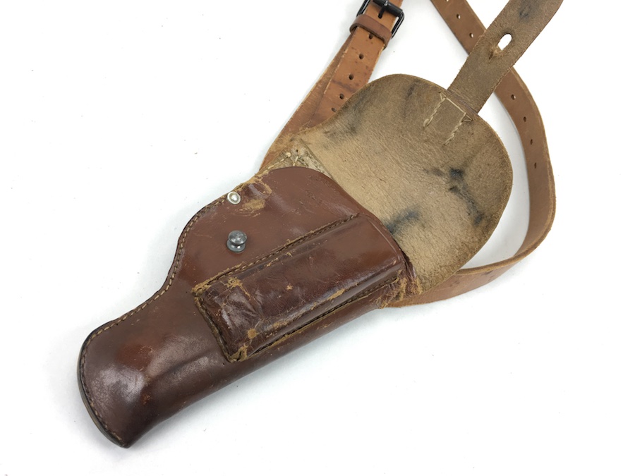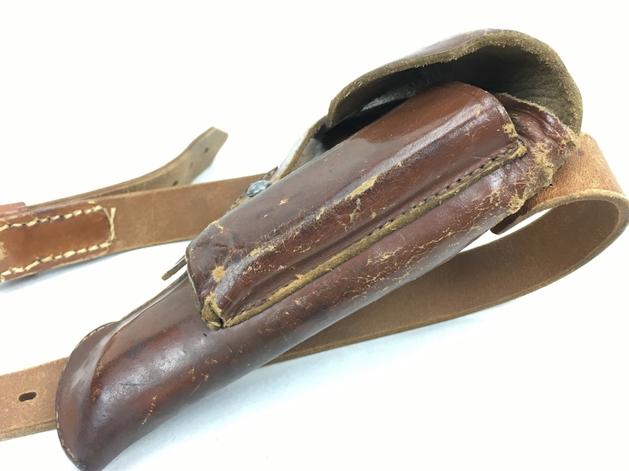 7/1/19 – This is an original 1942 dated Walther PPK (or similar sized pistol) holster. The holster is dated, police eagle stamped, and maker stamped under the closure strap. Holster has been modified with a shoulder strap. The shoulder strap appears WW2 era. Belt loop has been removed. Some minor scuffs and wrinkles. Buckle and strap are secure.