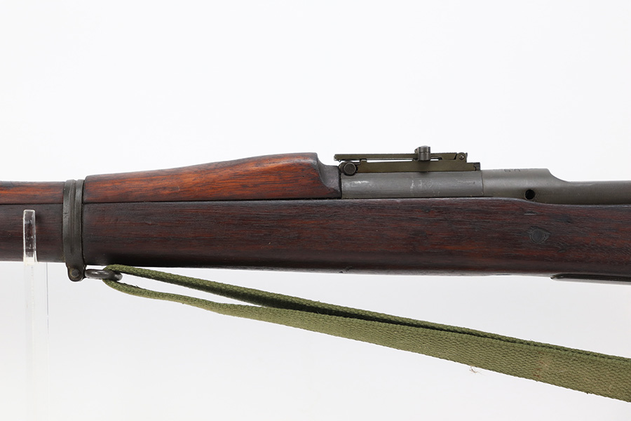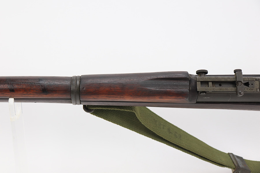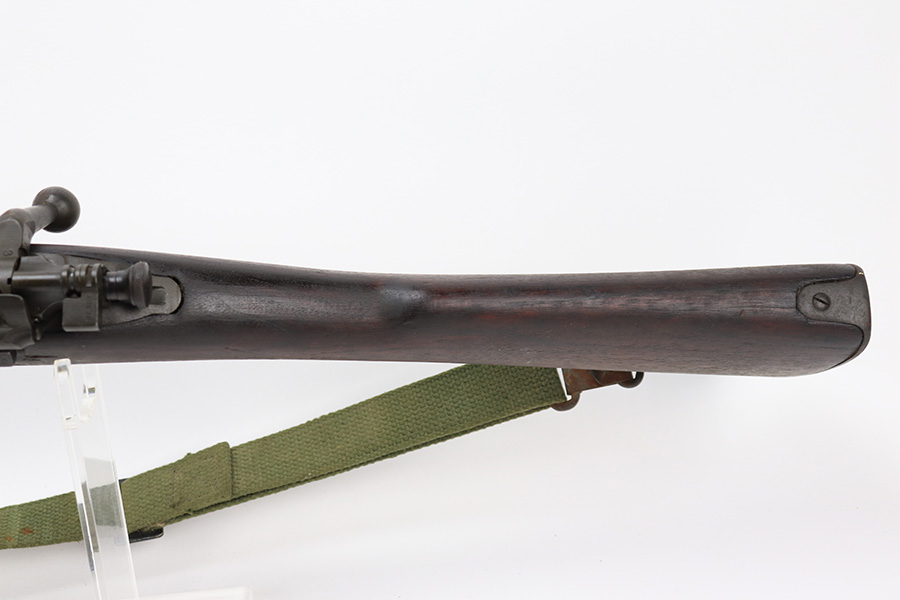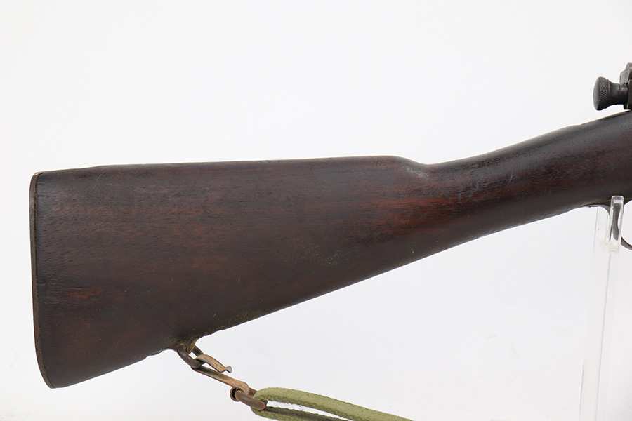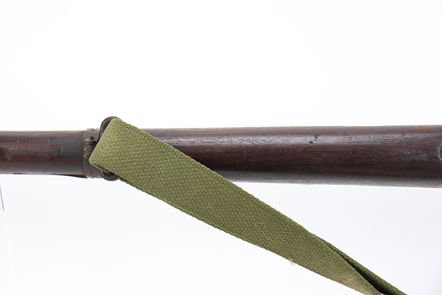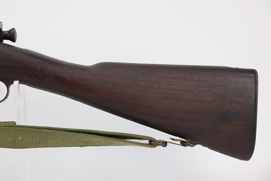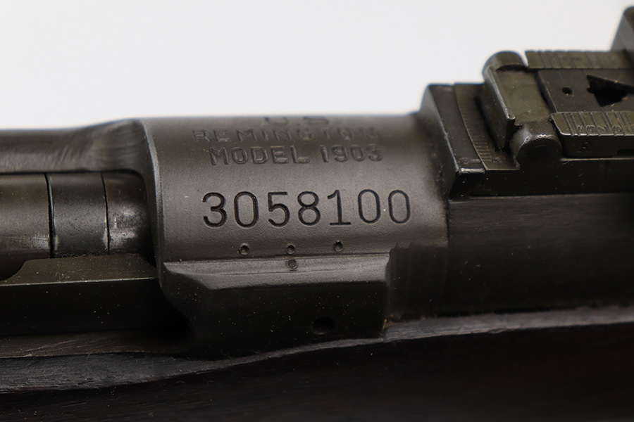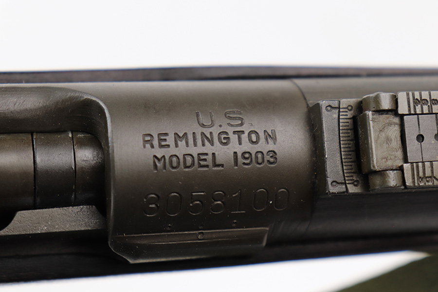 5/10/23 – This is an excellent example of a Remington Model 1903 issued to the US military in 1942. The barrel is Remington-marked and dated February of 1942. No visible markings on the stock except for a carved “W” on the very front under the barrel. The gun comes with a green canvas sling and a flaming bomb-proofed front sight hood. This is an arsenal-refurbished example, so the finish is excellent. Virtually no actual finish loss. The wood stock is excellent for the most part, but there are some small bruises here and there. A couple of small gouges around the safety lever. There is also a repaired hairline crack in the upper handguard. The bore has good rifling, but there is pin-pricking in the grooves.