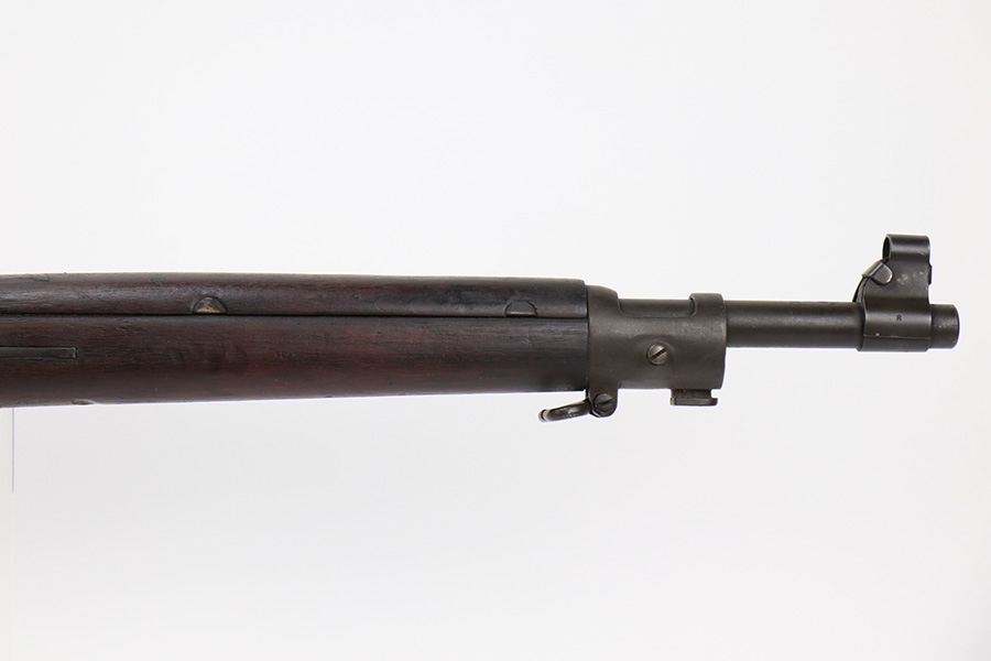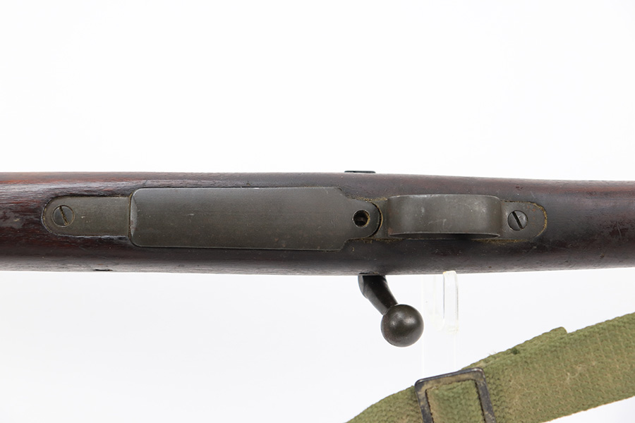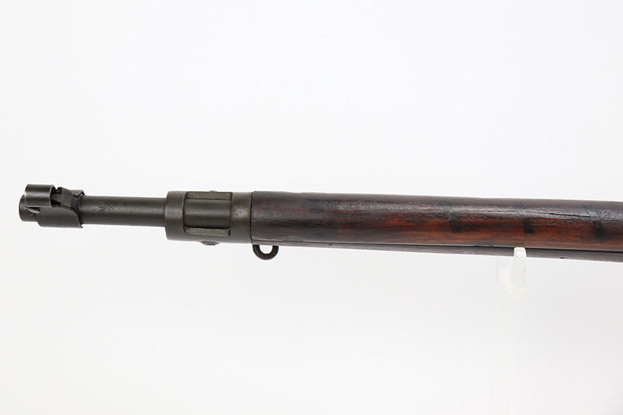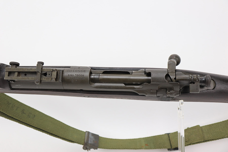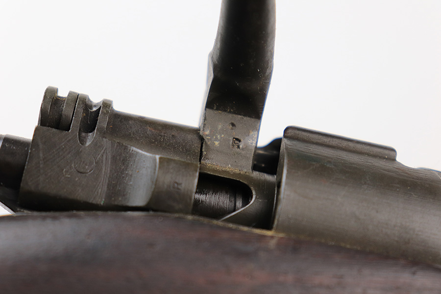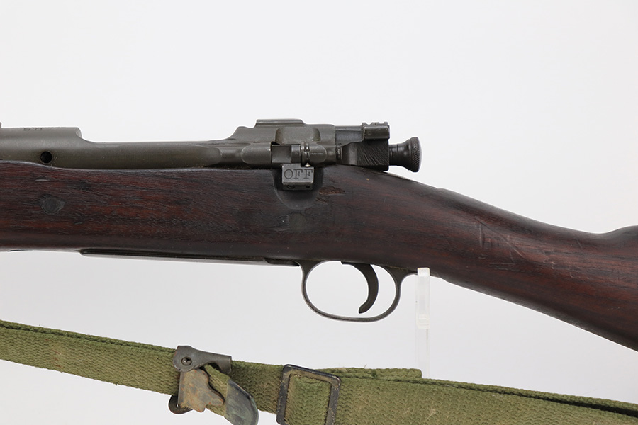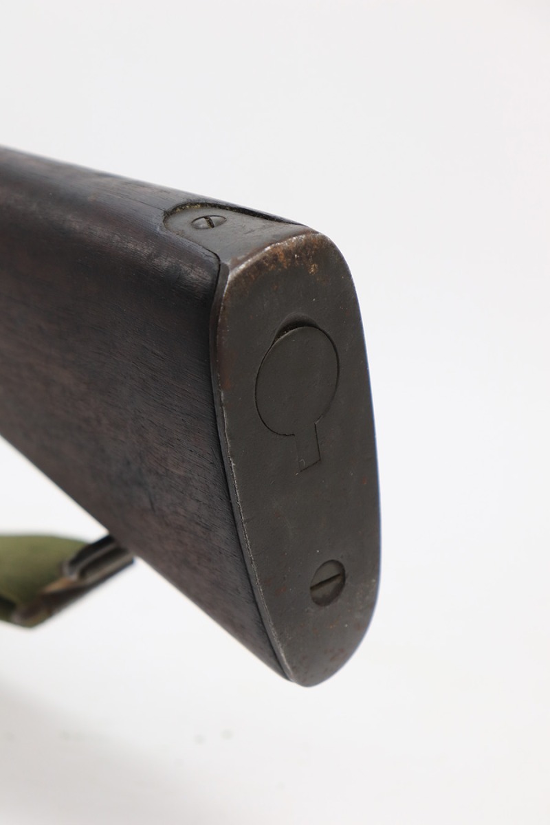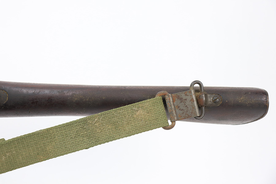 5/10/23 – This is an excellent example of a Remington Model 1903 issued to the US military in 1942. The barrel is Remington-marked and dated February of 1942. No visible markings on the stock except for a carved “W” on the very front under the barrel. The gun comes with a green canvas sling and a flaming bomb-proofed front sight hood. This is an arsenal-refurbished example, so the finish is excellent. Virtually no actual finish loss. The wood stock is excellent for the most part, but there are some small bruises here and there. A couple of small gouges around the safety lever. There is also a repaired hairline crack in the upper handguard. The bore has good rifling, but there is pin-pricking in the grooves.