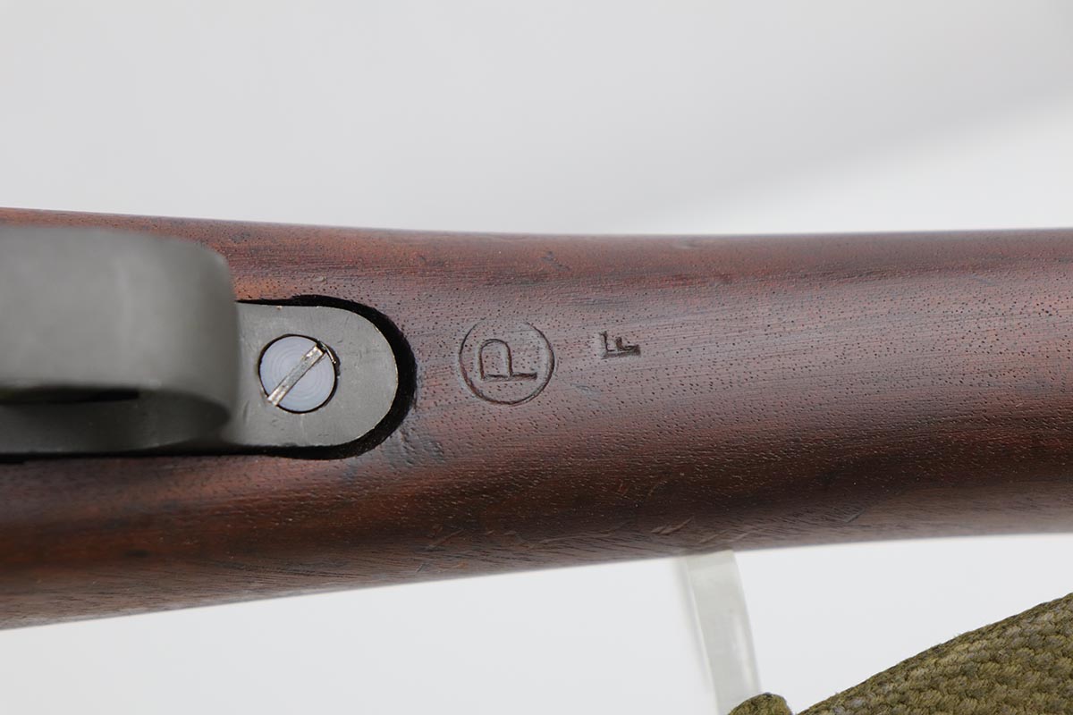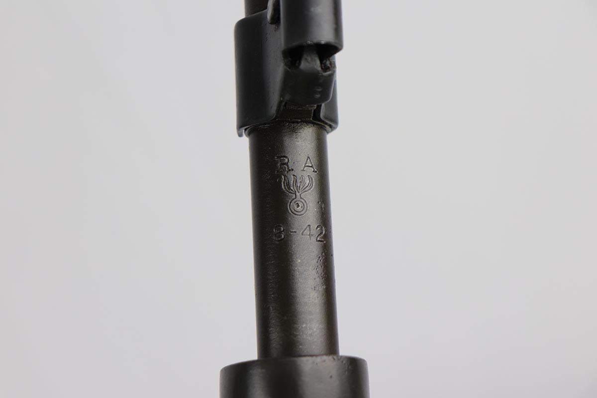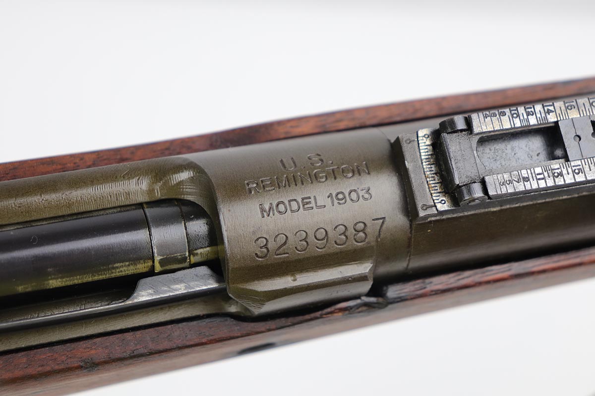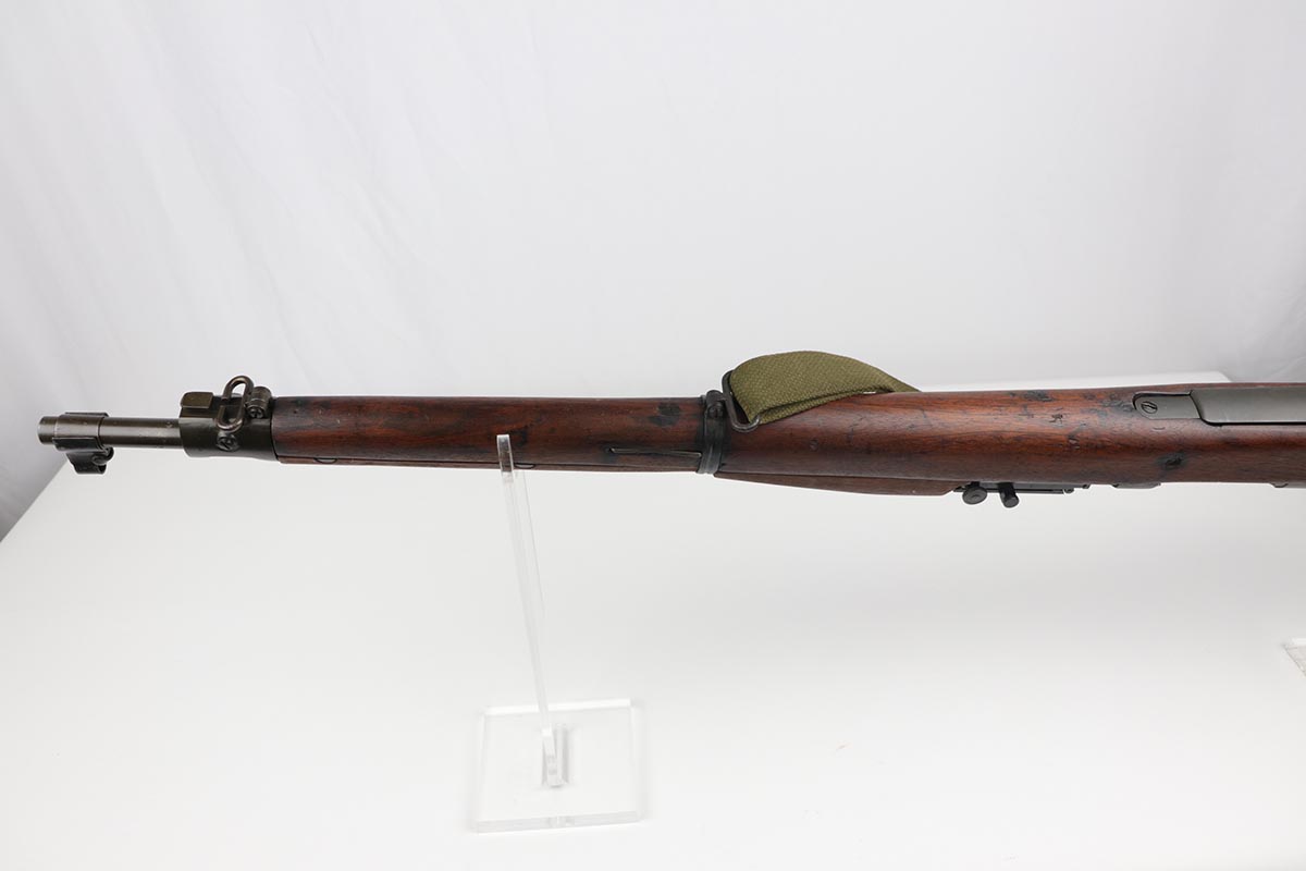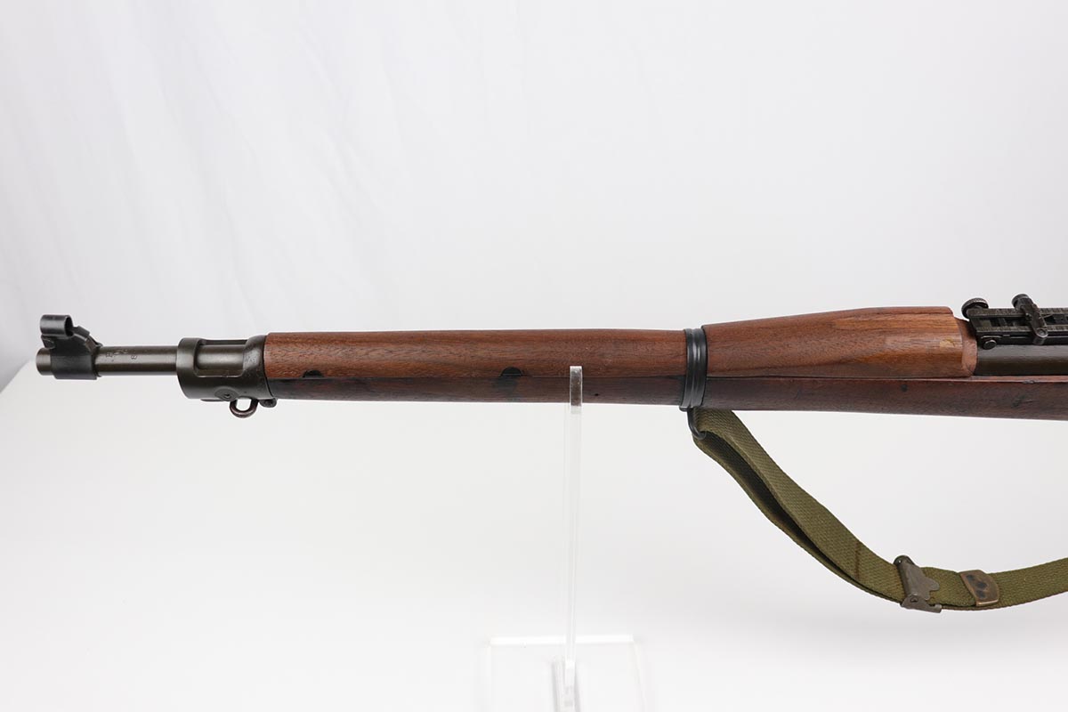 7/17/19 – This is a great example of an original 1942 Remington Model 1903 Rifle, manufactured before the transition to the widely known 03-A3 model. The stock is properly marked with a U.S. military cartouche and an “FJA” inspector proof. The barrel is marked with a flaming bomb and an August, 1942 manufacture date. Overall, the gun is in great condition. We would rate the finish on the metal parts around 90-95%. The bolt is blued and the receiver and barrel are parkerized. About 10% of the metal parts have very minor pitting/pin-pricking, especially on the front barrel band and around the muzzle. There are also a few areas of minor discoloration on the receiver. The wooden stock is in excellent condition. It appears to be original but lightly sanded. The markings, however, are still visible. The bolt action is fully functional and smooth. The bore is in great condition – shiny with strong rifling.