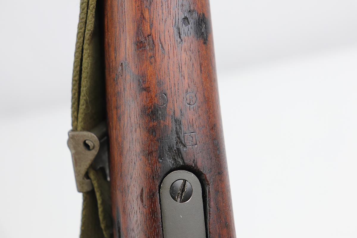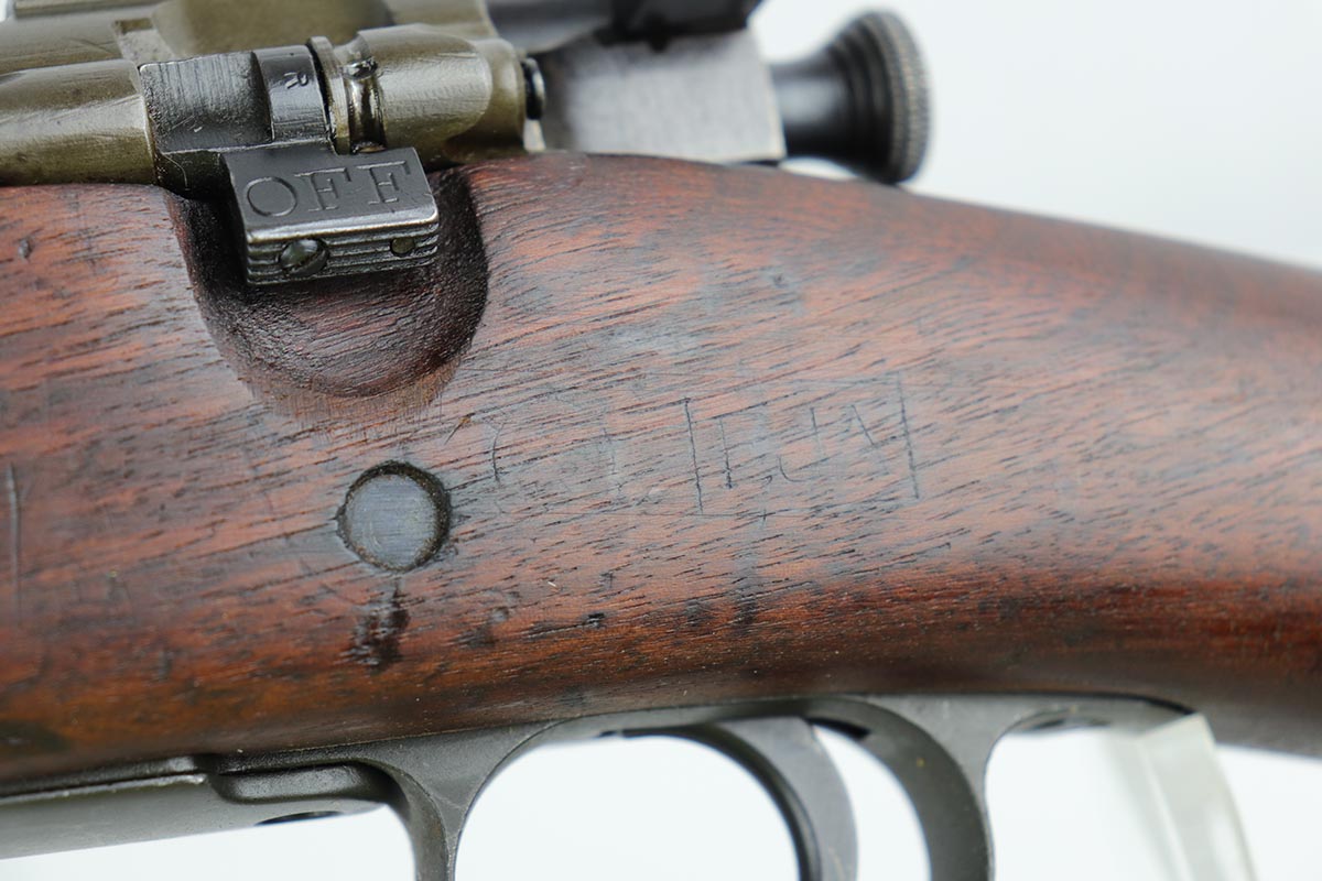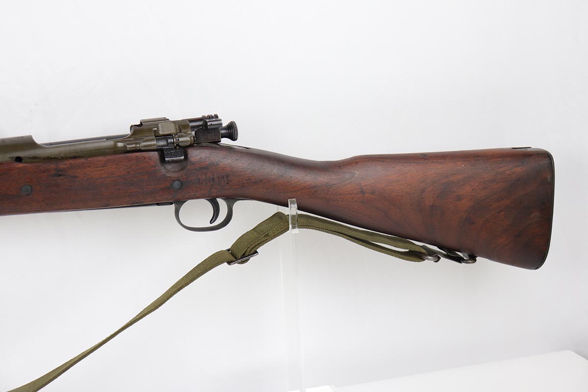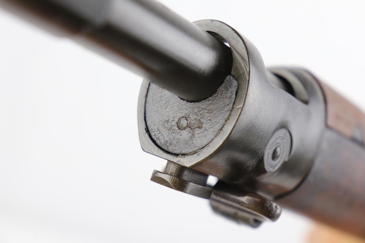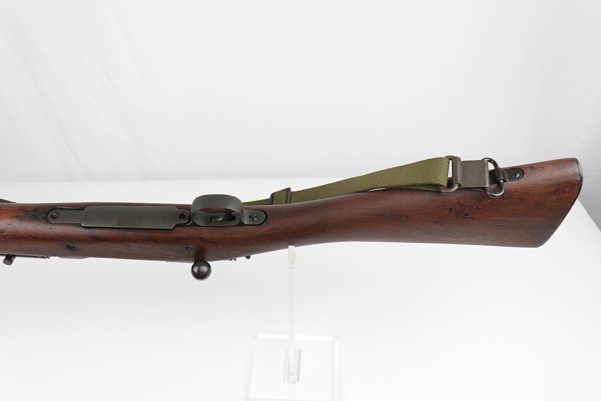 7/17/19 – This is a great example of an original 1942 Remington Model 1903 Rifle, manufactured before the transition to the widely known 03-A3 model. The stock is properly marked with a U.S. military cartouche and an “FJA” inspector proof. The barrel is marked with a flaming bomb and an August, 1942 manufacture date. Overall, the gun is in great condition. We would rate the finish on the metal parts around 90-95%. The bolt is blued and the receiver and barrel are parkerized. About 10% of the metal parts have very minor pitting/pin-pricking, especially on the front barrel band and around the muzzle. There are also a few areas of minor discoloration on the receiver. The wooden stock is in excellent condition. It appears to be original but lightly sanded. The markings, however, are still visible. The bolt action is fully functional and smooth. The bore is in great condition – shiny with strong rifling.