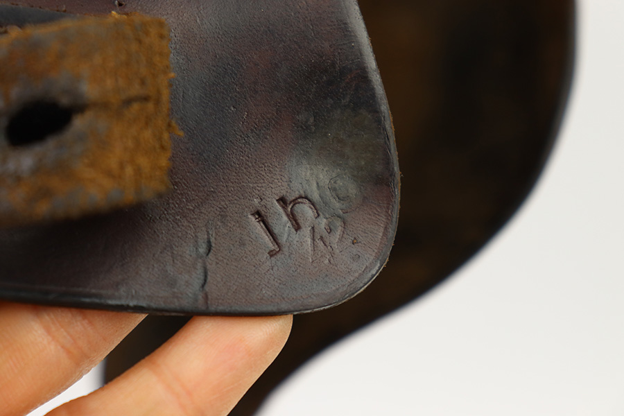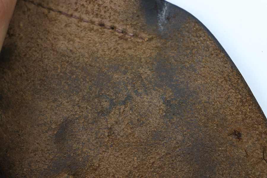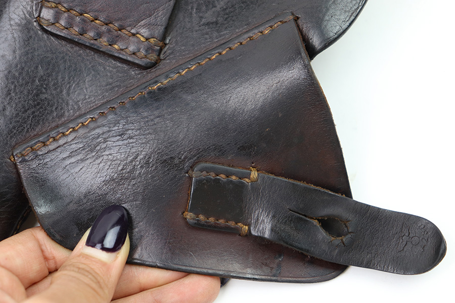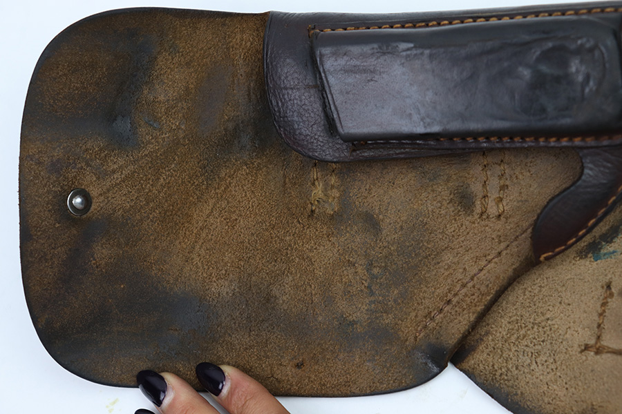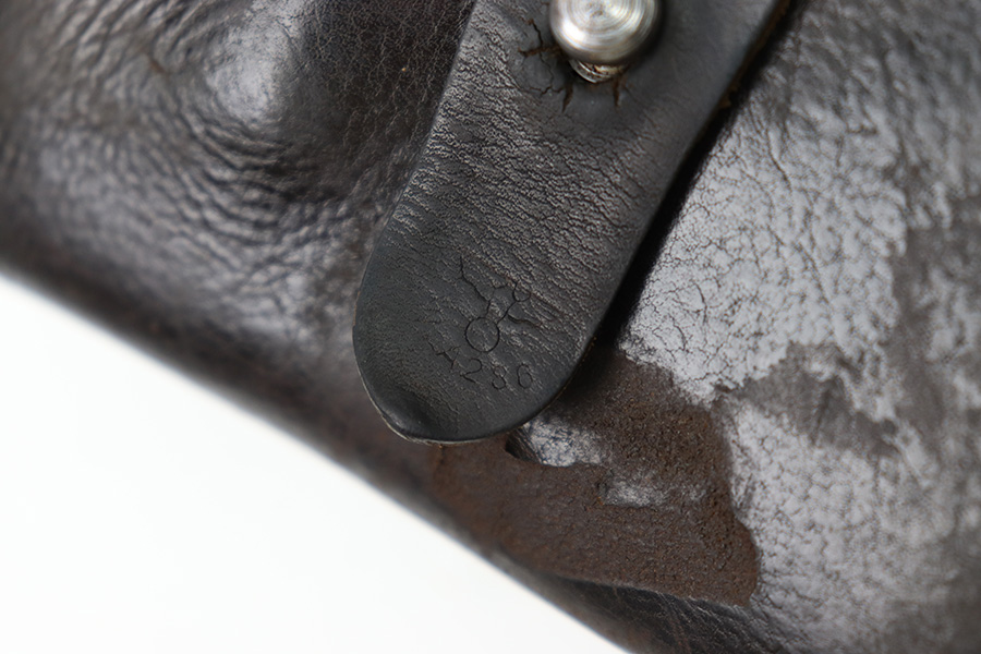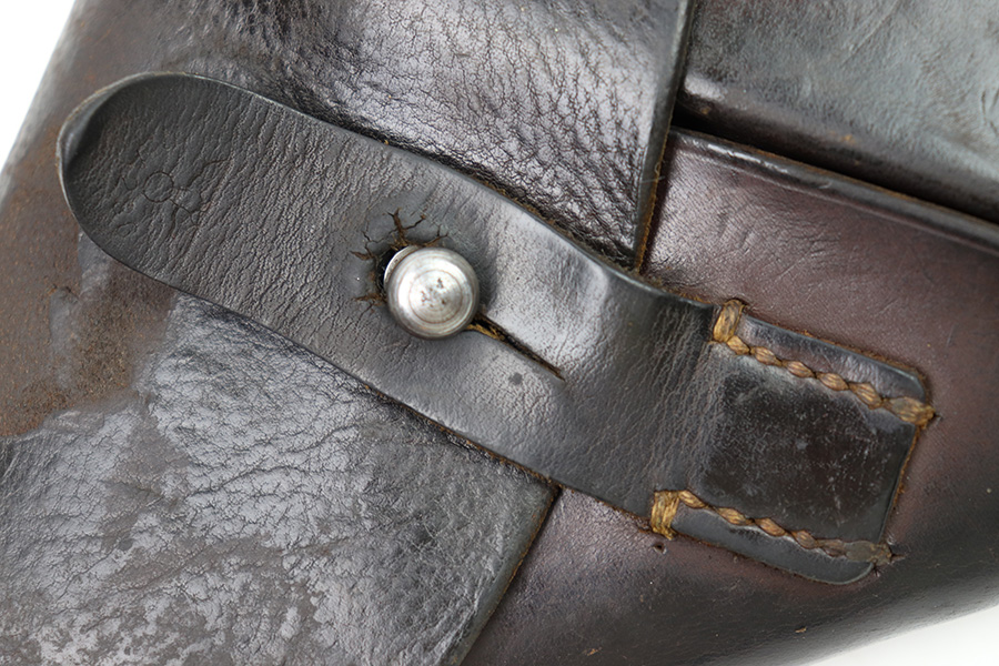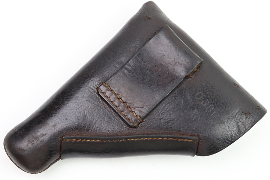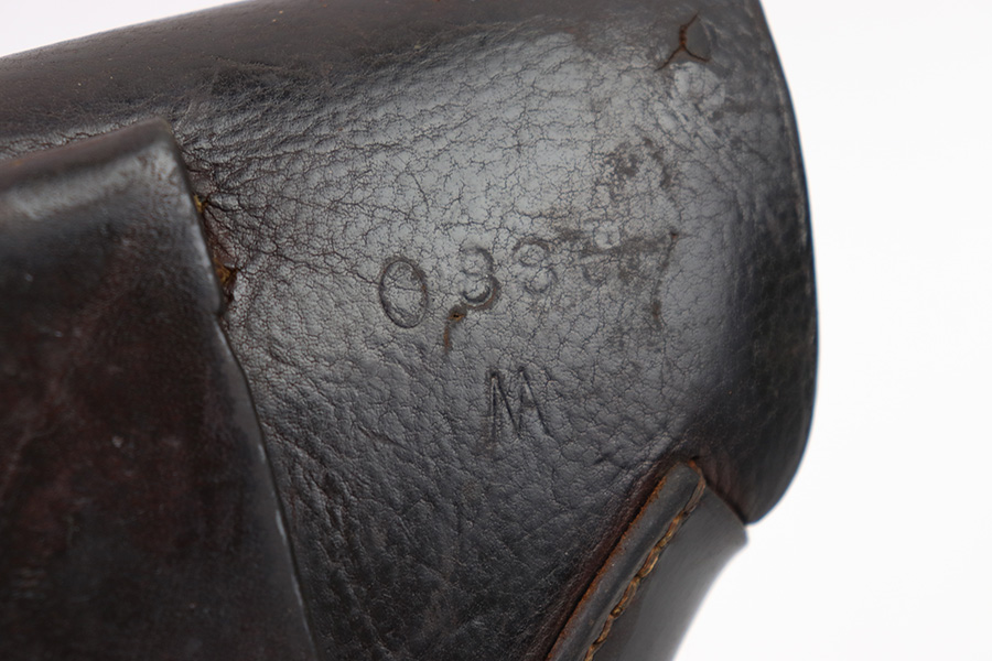 12/5/22 – This is an original 1942 dated holster for a 7.65mm Sauer pistol such as the model 38h. The holster is waffen military proof stamped on the closure strap, maker coded and date stamped under the closure strap, and ink stamped on the interior leather, “Sauer 7,65”. The ink stamp is faint, so only the “Sauer” portion of the stamp is visible (we see the “Sau” and part of the “H” underneath). Oddly, there’s a number stamp “0886 M (or W)” on the back leather. We’re not sure the significance of this marking, perhaps a unit stamp of some sort. The leather is soft and pliable with honest wear throughout. There’s a spot of surface leather that’s peeled off on the front leather, as shown. The leather is still completely intact. All original stitching intact as well.