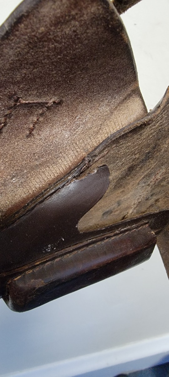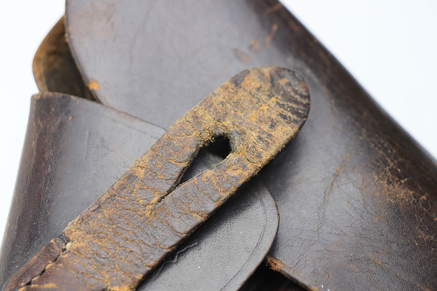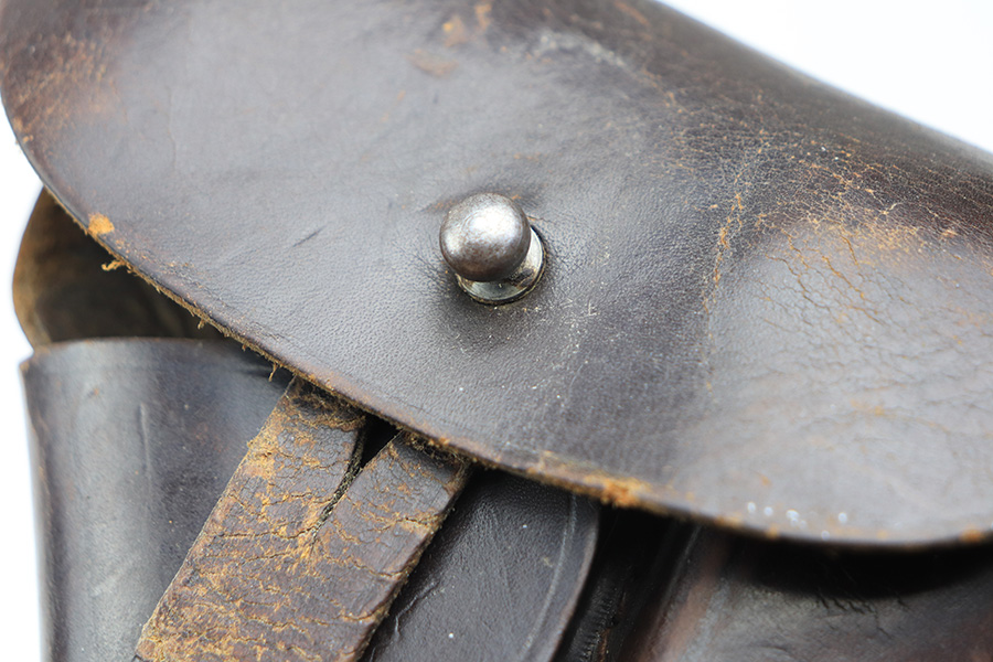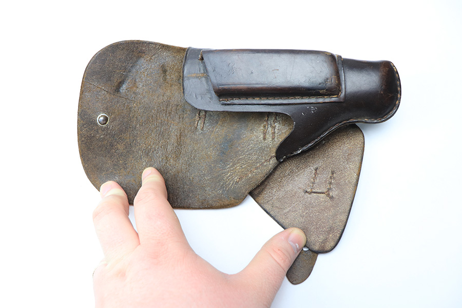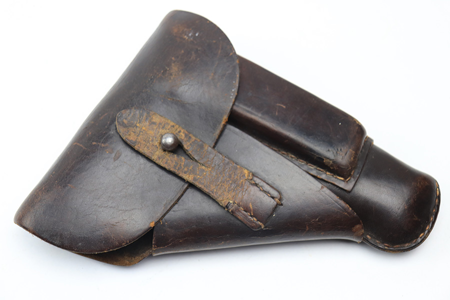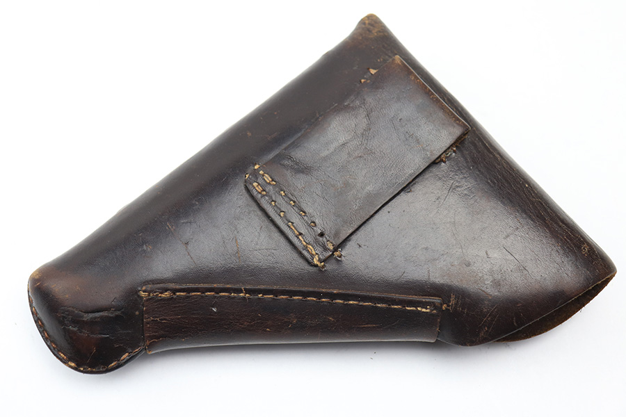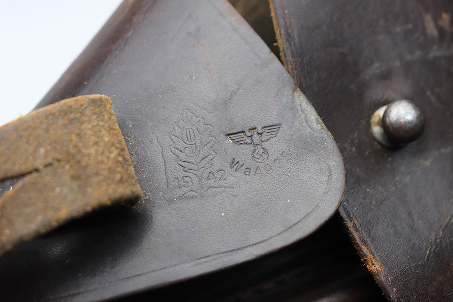 1/19/22 – This is a 1942 dated holster for a Mauser HSC or Sauer 38h. The holster is waffen stamped, maker stamped, and date stamped under the closure strap. The interior leather has no markings or stamps that we can see. We’ve seen this style before with Sauer and Mauser 7.65mm pistols. The leather is wrinkled and has surface wear throughout the closure strap and top leather. There’s normal aging and pliability. There’s a small crack in the leather and about 3 stitches missing along the left side of the holster, but this doesn’t affect functionality. Price reduced accordingly.