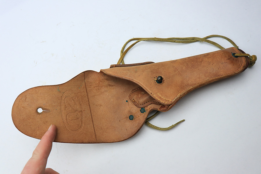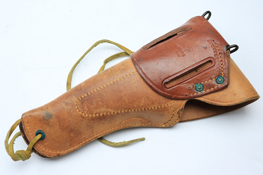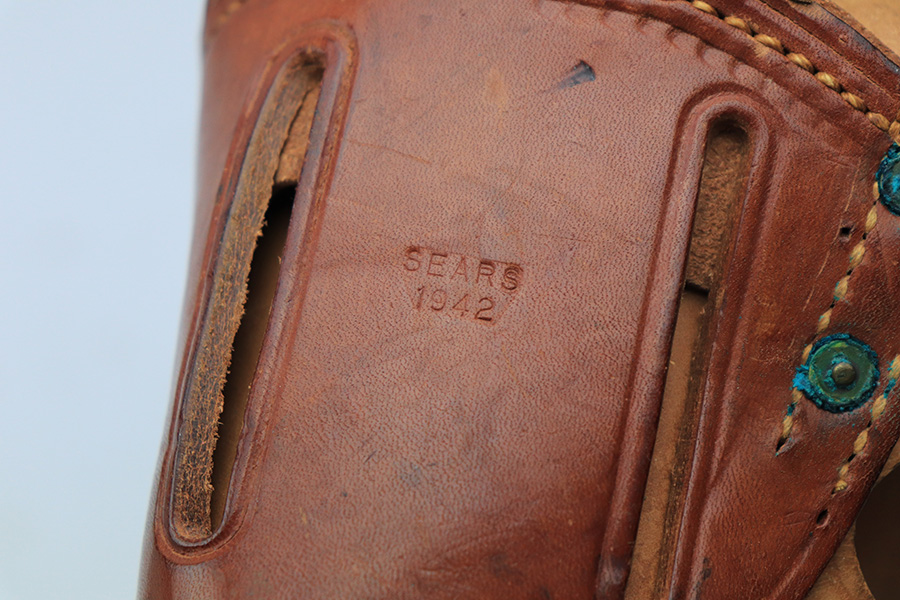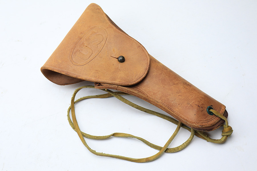 4/26/22 – This is an original 1942 dated holster for a model 1911A1 pistol from WW2. The holster is in excellent condition with very clean leather and stitching throughout. Very nice interior leather as well. The back leather is maker stamped and dated, with a US stamp on the front leather.