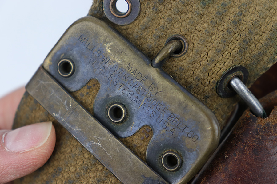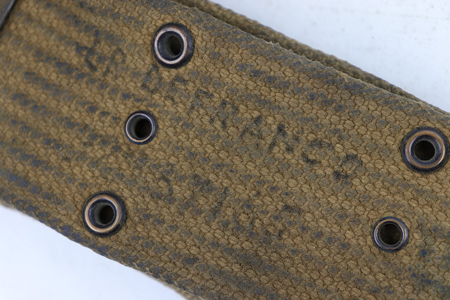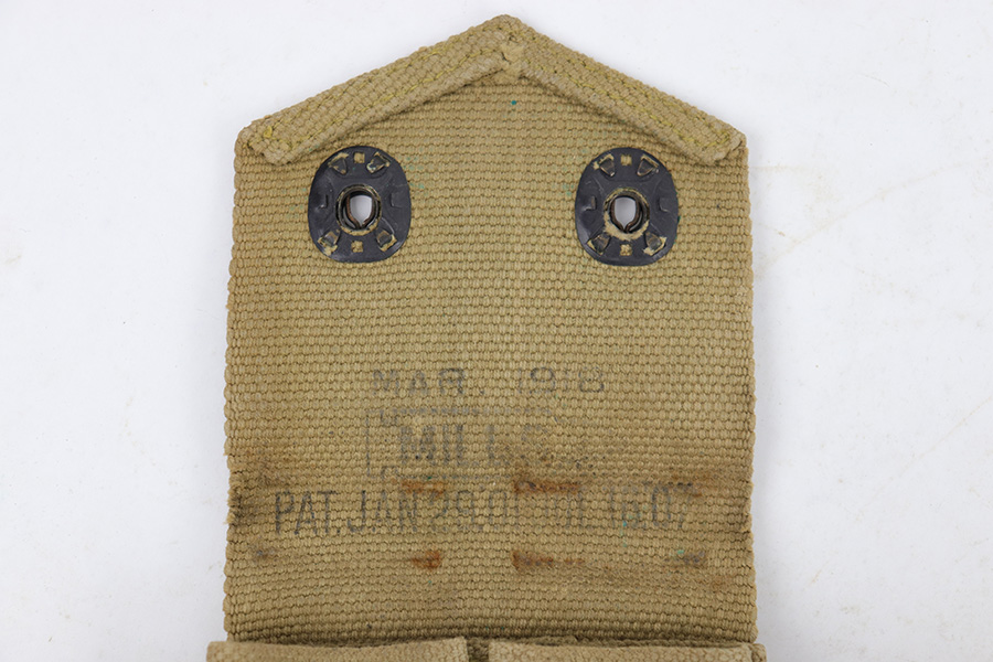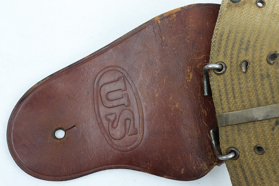 4/12/23 – This is an original 1942 dated M1916 holster for a M1911A1 pistol. The holster is in great condition with clean leather and all original stitching intact. The leather is soft and pliable with normal signs of previous use. Maker stamped and dated on the back leather. The holster comes with a WW1 era canvas belt and 1911 magazine pouch. The pouch is ink stamped on the interior with a maker and 1918 date. The belt has some mild staining and age wear but is in great condition.