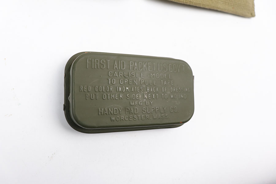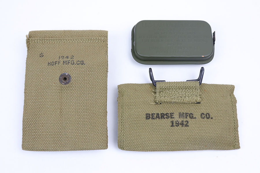 10/27/20 – This is an original 1911a1 mag pouch and canvas med kit pouch with original ww2 med kit. Each canvas pouch is dated 1942 and in excellent condition. Original WW2 items.