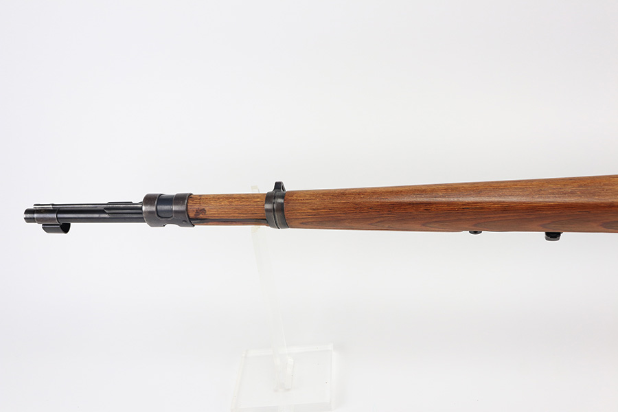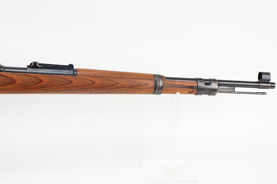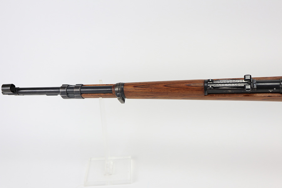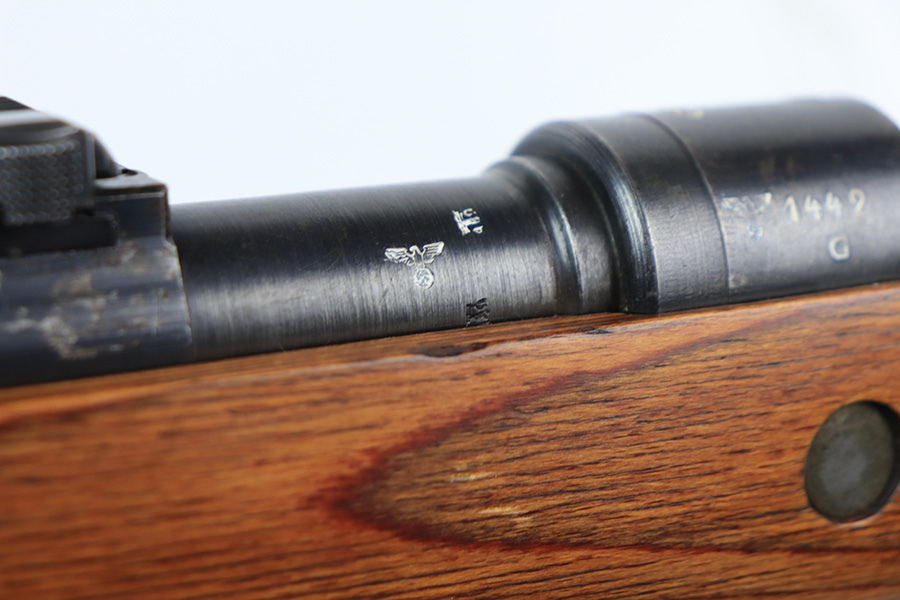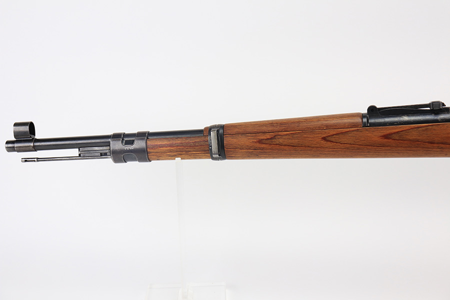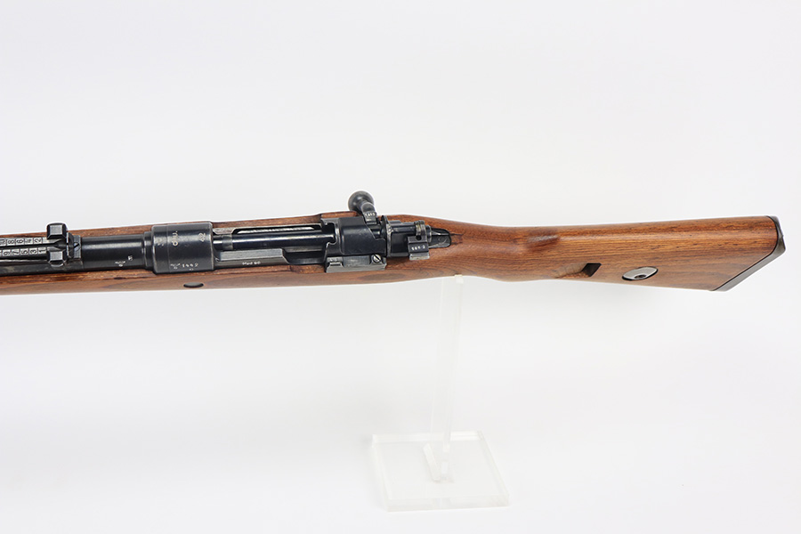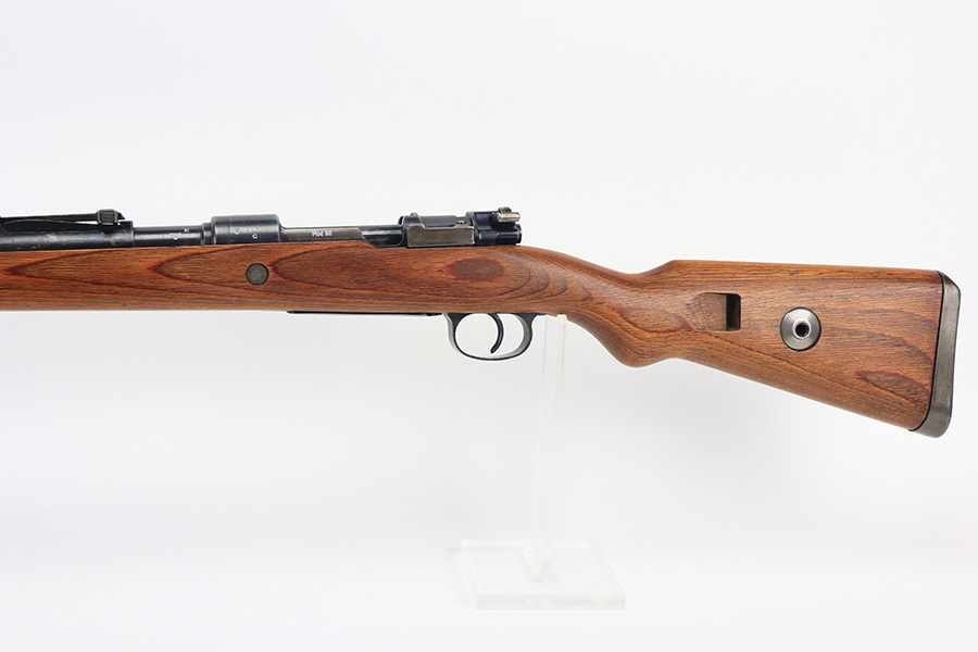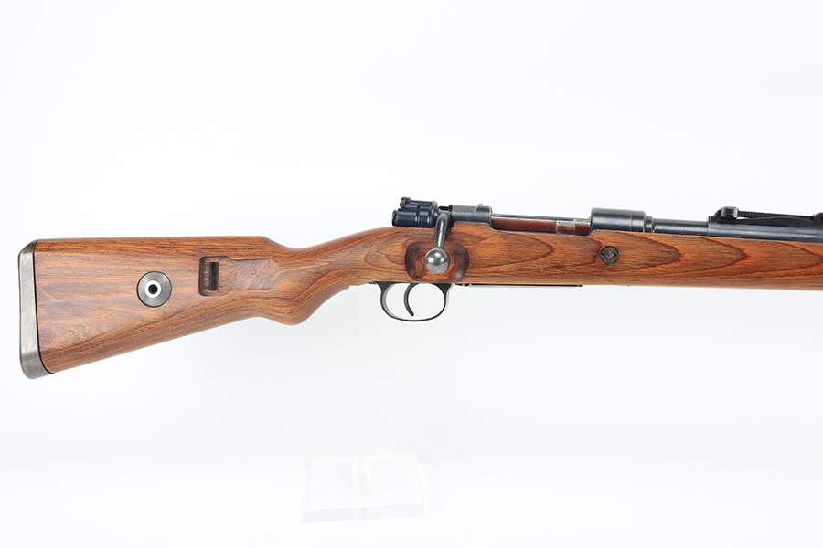 2/1/22 – This is a very nice example of a Waffenwerke-Brunn K98 rifle issued to the Nazi military in 1942. The gun is completely matching, but we believe the floor plate and trigger group have been re-numbered to match the receiver. It has the proper waffen military proofs throughout. No visible markings on the stock. The gun has retained most of its blued finish. There is minor wear around the muzzle and around the high edges of the barrel bands. A few light scratches on the floor plate. There are a couple of areas of splotchy discoloration on the receiver. The wood stock is near-mint but was likely sanded. The bore is shiny with strong rifling but there is an area of heavy oxidation about halfway down. Comes with an original cleaning rod.