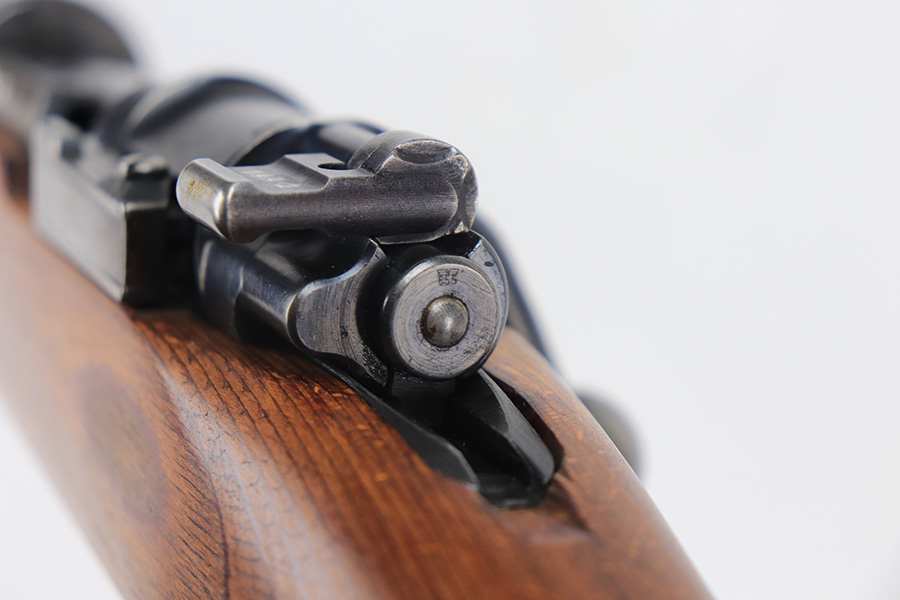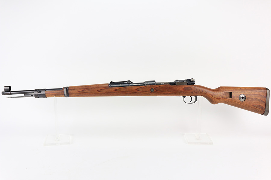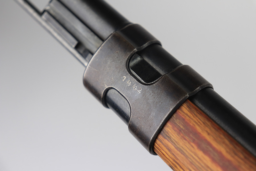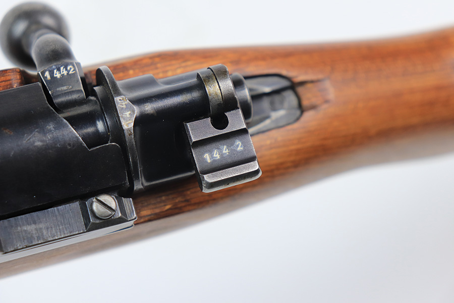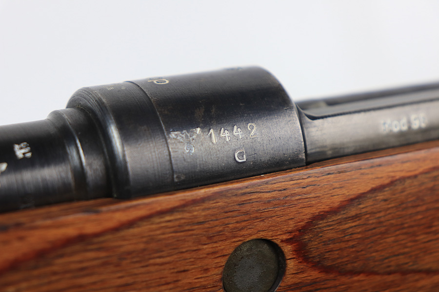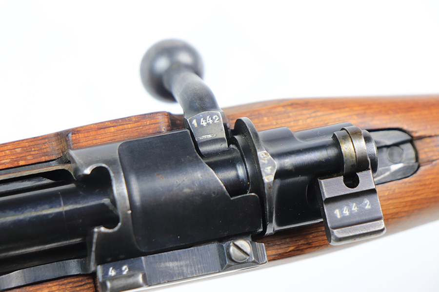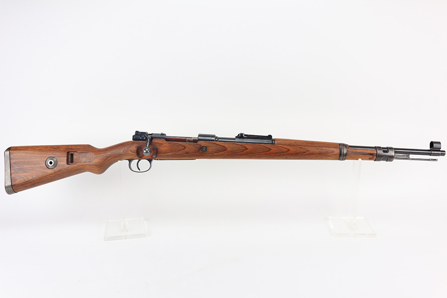 2/1/22 – This is a very nice example of a Waffenwerke-Brunn K98 rifle issued to the Nazi military in 1942. The gun is completely matching, but we believe the floor plate and trigger group have been re-numbered to match the receiver. It has the proper waffen military proofs throughout. No visible markings on the stock. The gun has retained most of its blued finish. There is minor wear around the muzzle and around the high edges of the barrel bands. A few light scratches on the floor plate. There are a couple of areas of splotchy discoloration on the receiver. The wood stock is near-mint but was likely sanded. The bore is shiny with strong rifling but there is an area of heavy oxidation about halfway down. Comes with an original cleaning rod.
