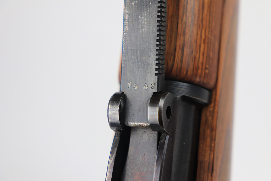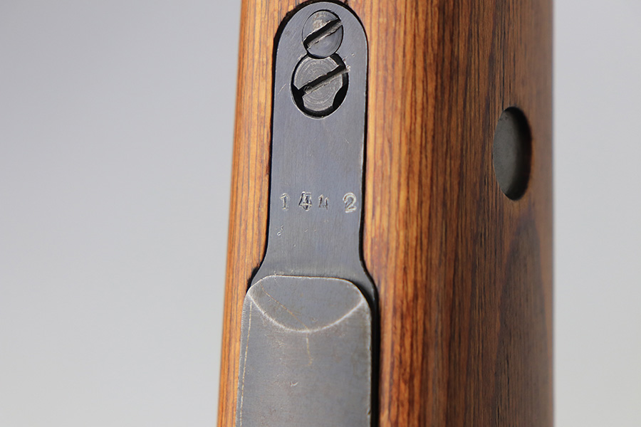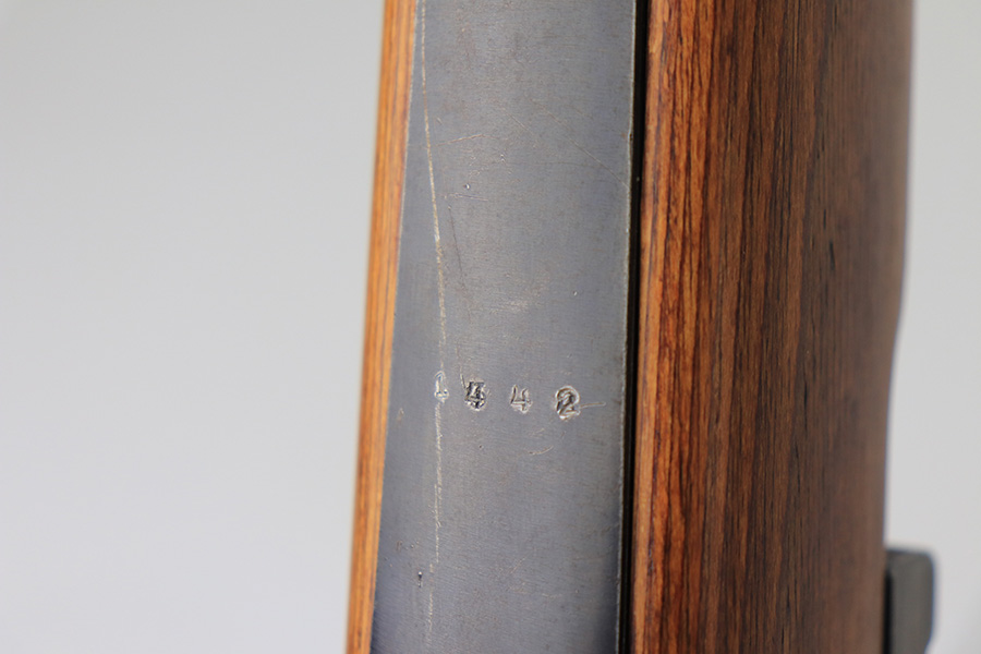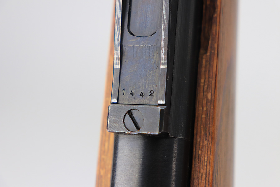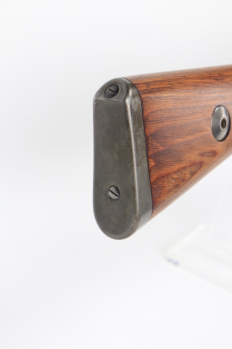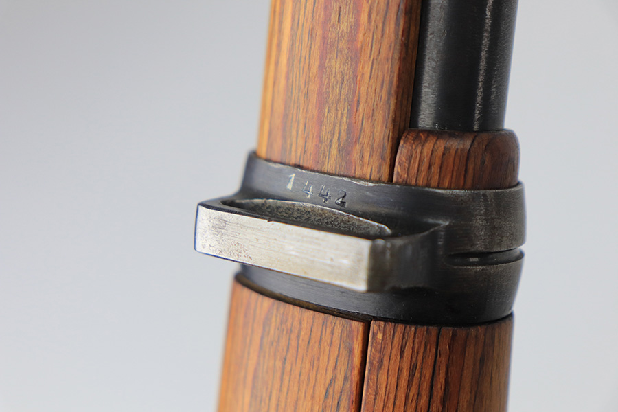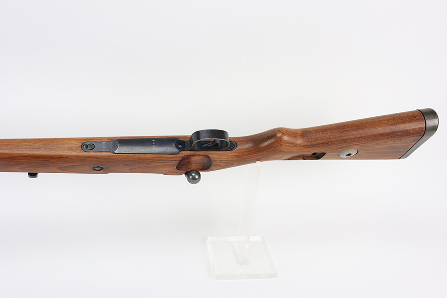 2/1/22 – This is a very nice example of a Waffenwerke-Brunn K98 rifle issued to the Nazi military in 1942. The gun is completely matching, but we believe the floor plate and trigger group have been re-numbered to match the receiver. It has the proper waffen military proofs throughout. No visible markings on the stock. The gun has retained most of its blued finish. There is minor wear around the muzzle and around the high edges of the barrel bands. A few light scratches on the floor plate. There are a couple of areas of splotchy discoloration on the receiver. The wood stock is near-mint but was likely sanded. The bore is shiny with strong rifling but there is an area of heavy oxidation about halfway down. Comes with an original cleaning rod.