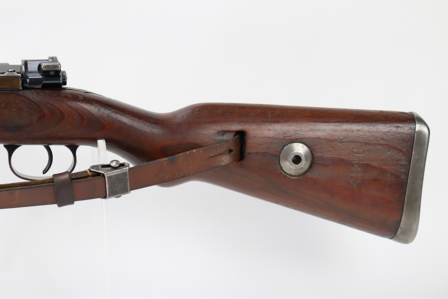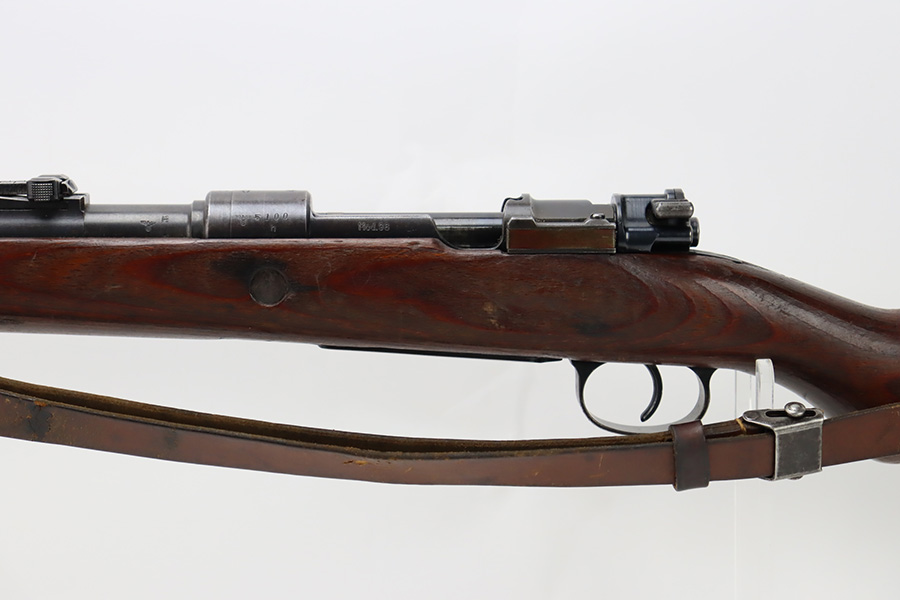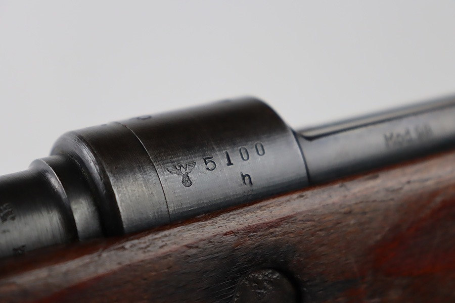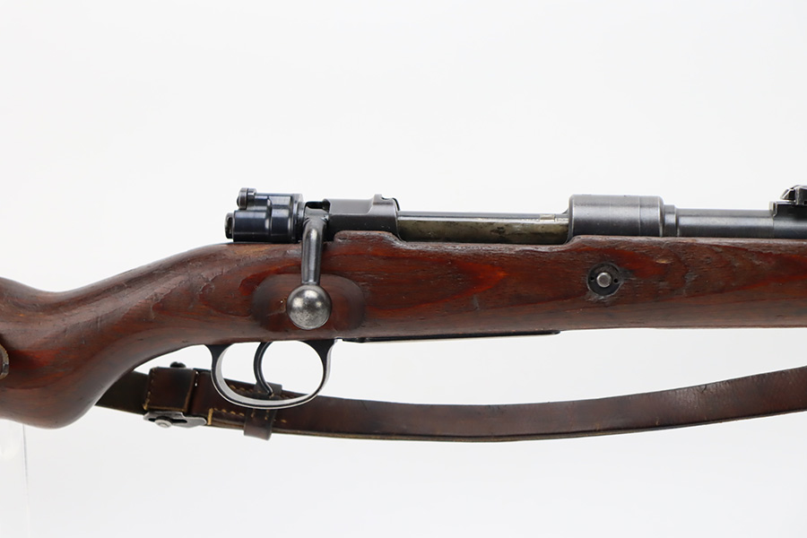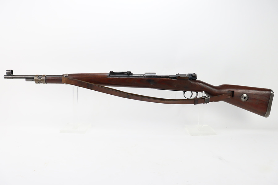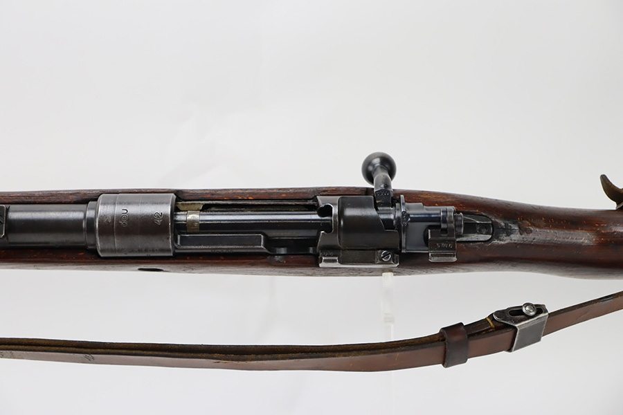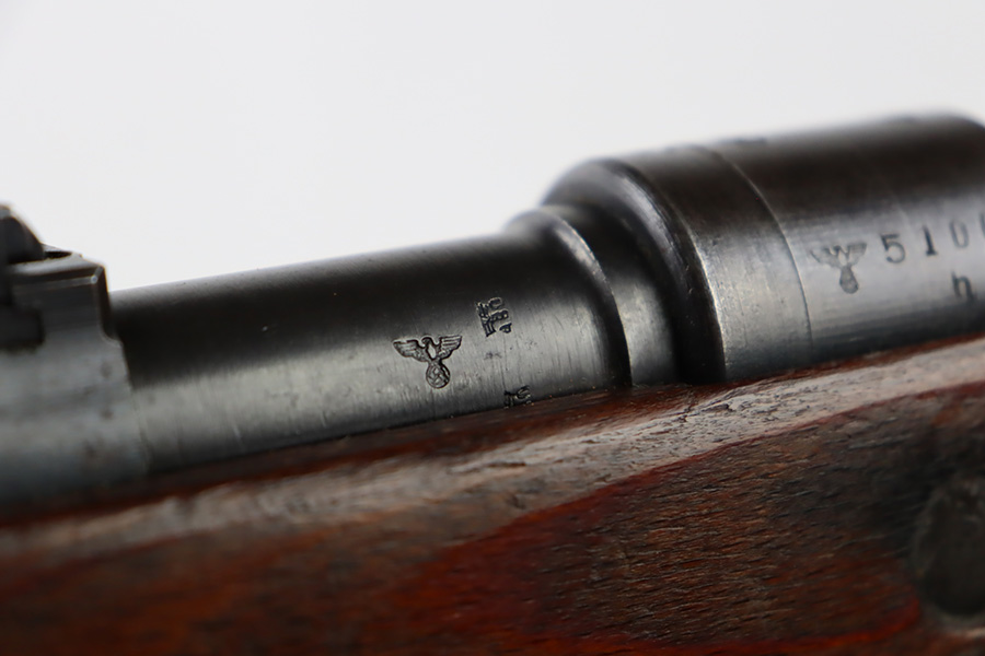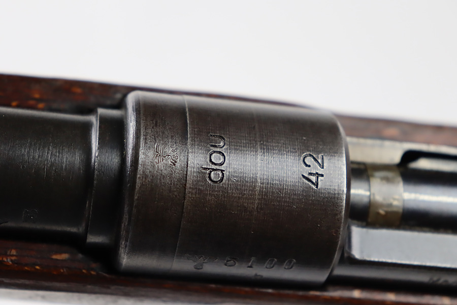 10/5/23 – This is a very nice example of a “dou 42” code Waffenwerke Brunn K98 issued to the Nazi military in 1942. It is all matching except for the stock. The bluing rates roughly 85%. The finish loss is concentrated on the barrel bands and on the floor plate. There is some spotty oxidation on the floor plate and butt plate and some light pin-pricking on the floor plate as well. The wood furniture shows the typical signs of wear with no major damage. Mint bore. Comes with a nice leather sling.