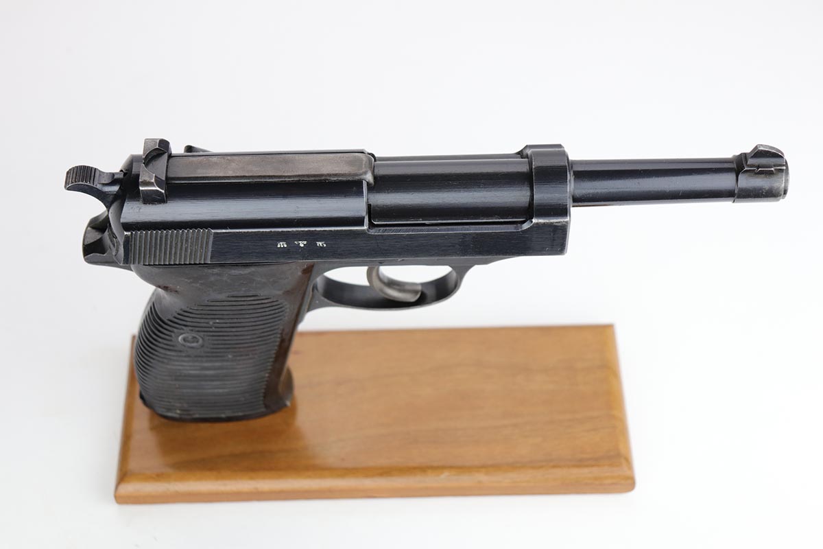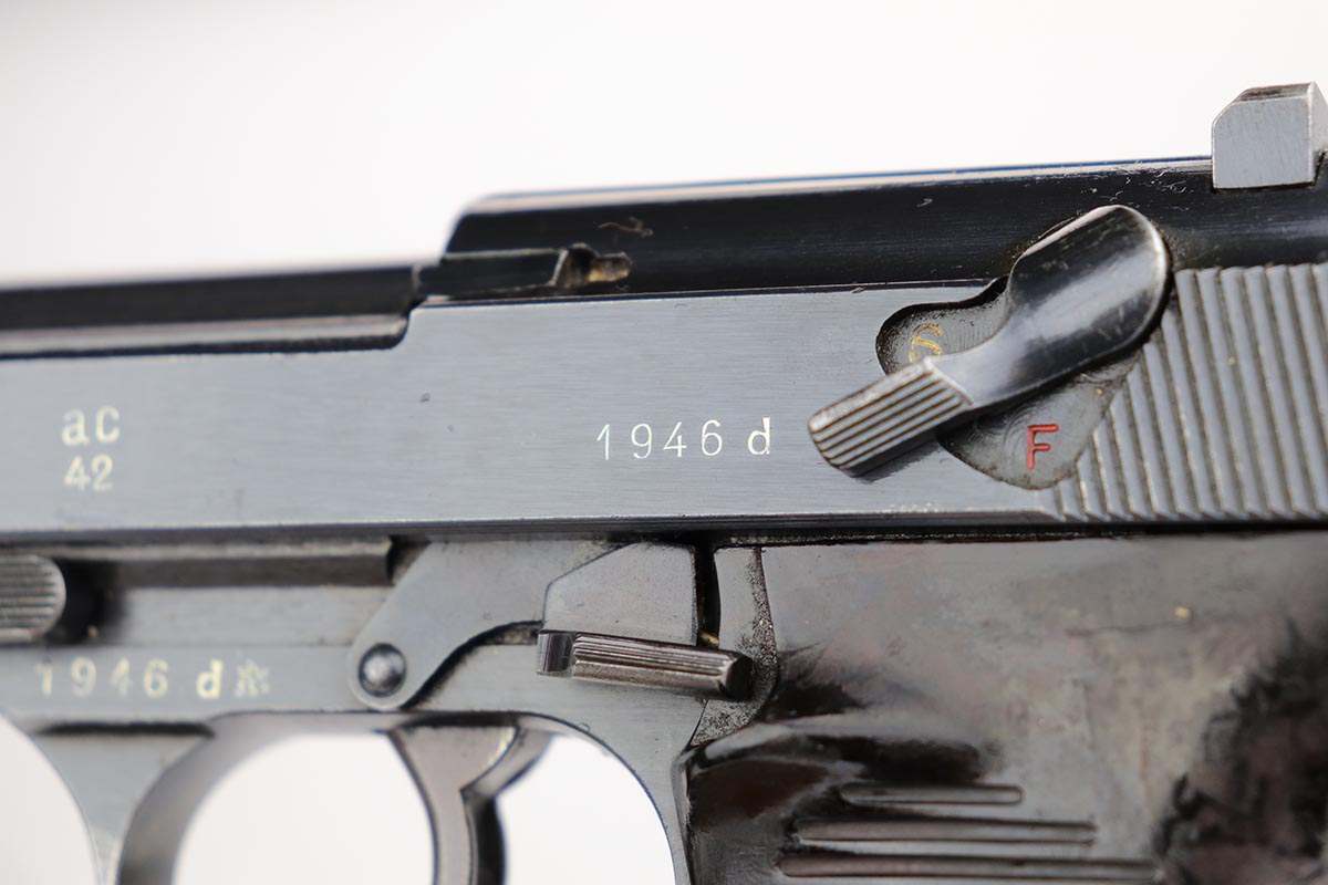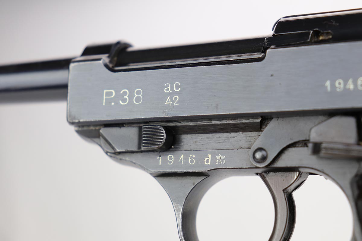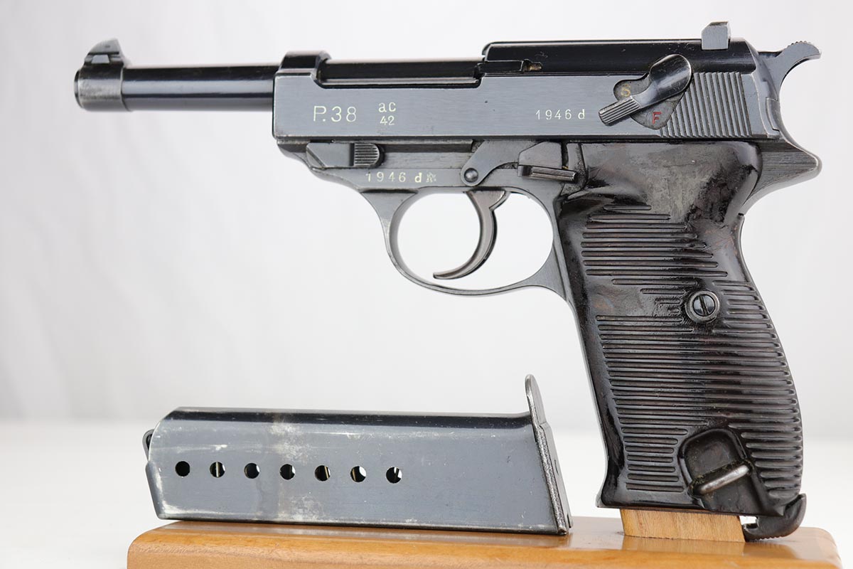 11/1/19 – This is an all matching and original Walther P.38 from May of 1942. The bluing is original and rates at about 92% with a very nice profile view but notable thinning on the front strap and top plate. Minty bore and proper functionality, including de-cocker. Nice brown grips, though there is a minor scratch on the right side. Walther magazine.