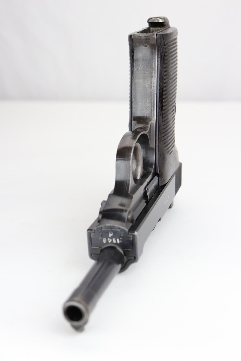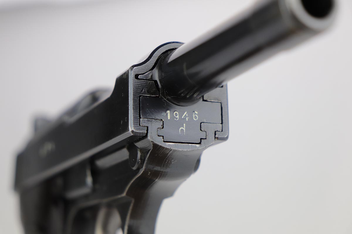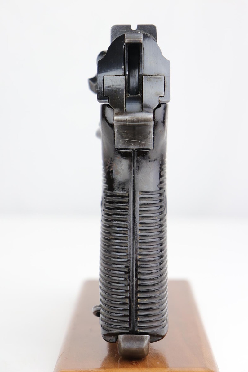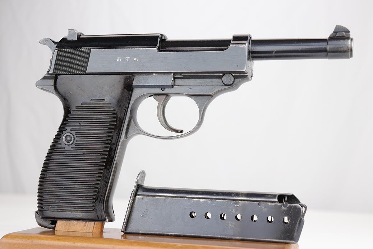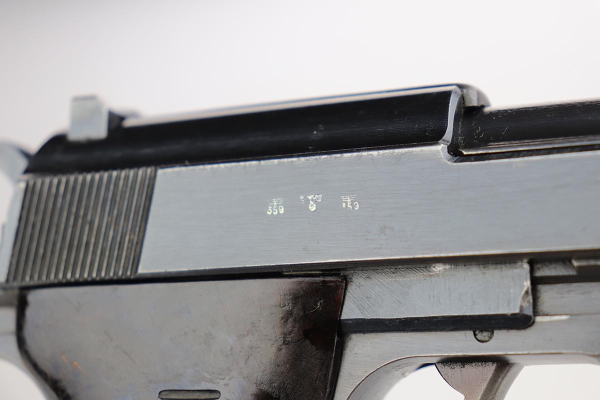 11/1/19 – This is an all matching and original Walther P.38 from May of 1942. The bluing is original and rates at about 92% with a very nice profile view but notable thinning on the front strap and top plate. Minty bore and proper functionality, including de-cocker. Nice brown grips, though there is a minor scratch on the right side. Walther magazine.