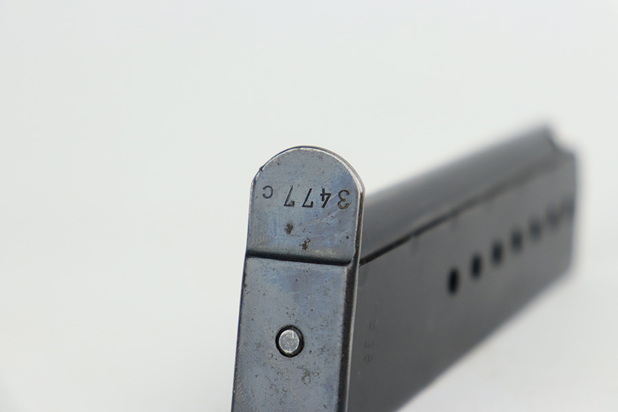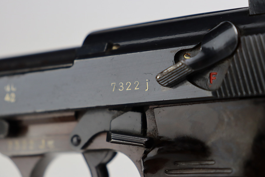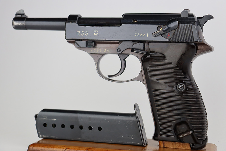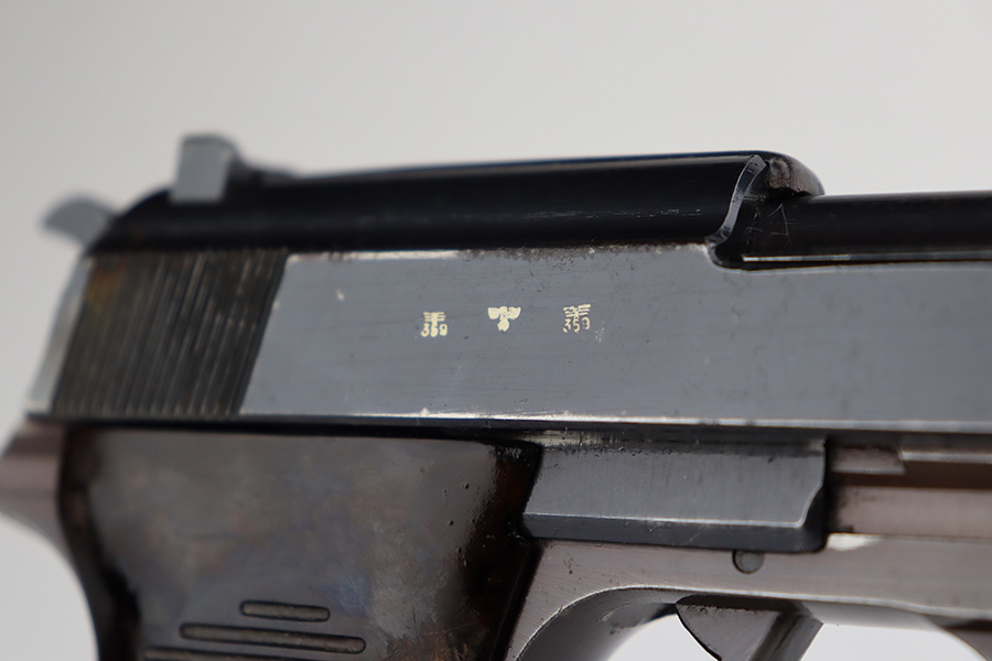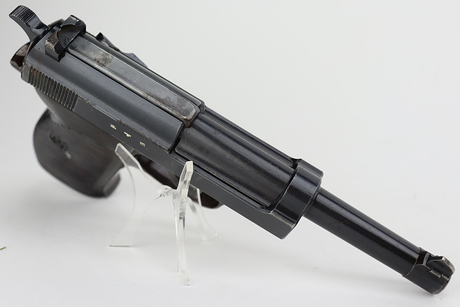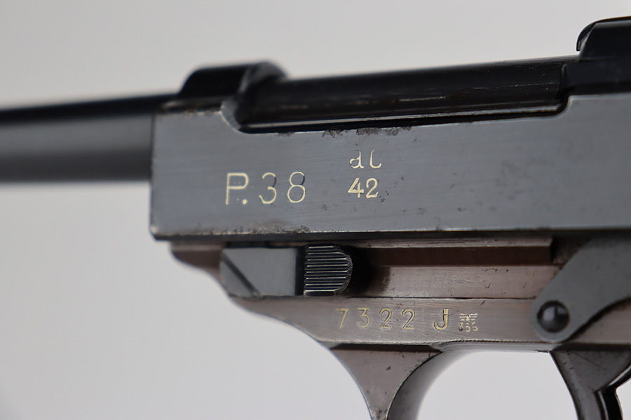 8/21/23 – This is a very nice example of an AC 42 Walther P.38 issued to the Nazi military in 1942. It is all matching with the proper “Eagle 359” military acceptance proofs throughout. It has retained roughly 85% of its original finish. The majority of the finish loss is on the front strap. There is minor wear around the muzzle and some areas of minor pitting and oxidation on some of the high edges of the slide and on the top strap. The frame has a nice plum color to it. Fitted with excellent period-correct blackish-brown bakelite grips and comes with a numbered but mismatched magazine. The bore has strong rifling with minor freckling throughout. De-cocker is functional.