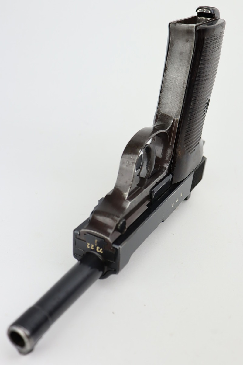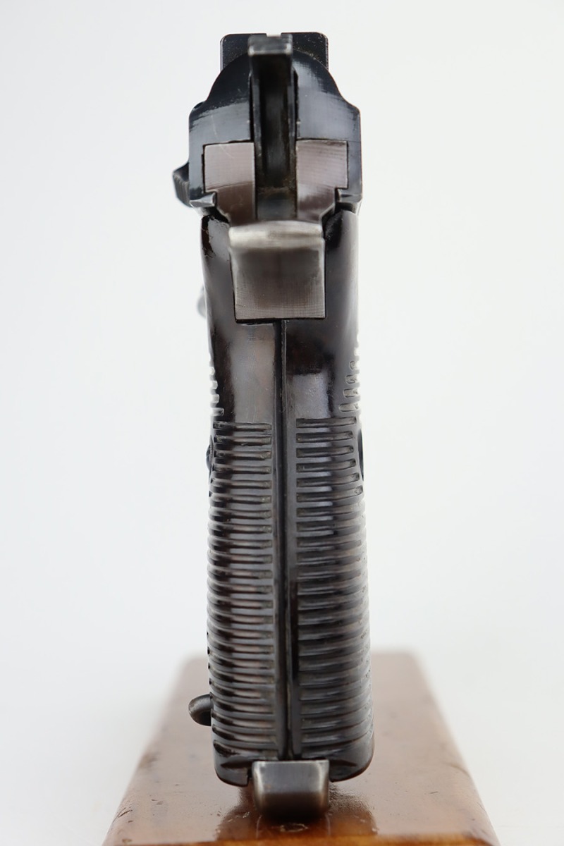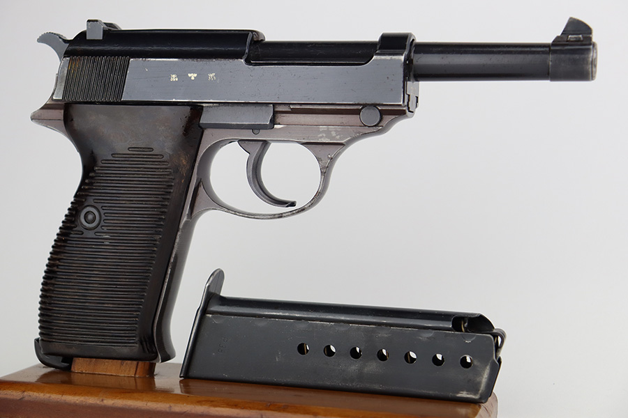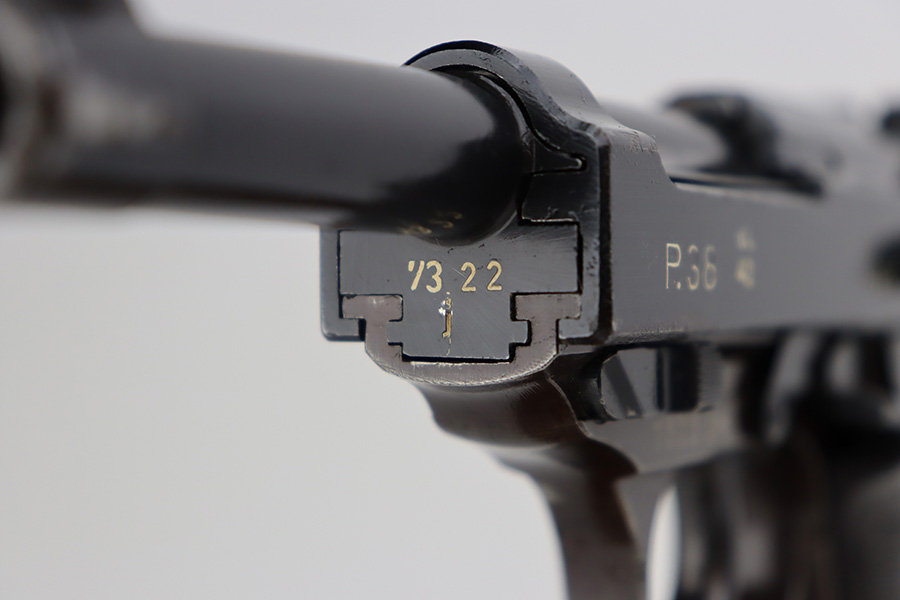 8/21/23 – This is a very nice example of an AC 42 Walther P.38 issued to the Nazi military in 1942. It is all matching with the proper “Eagle 359” military acceptance proofs throughout. It has retained roughly 85% of its original finish. The majority of the finish loss is on the front strap. There is minor wear around the muzzle and some areas of minor pitting and oxidation on some of the high edges of the slide and on the top strap. The frame has a nice plum color to it. Fitted with excellent period-correct blackish-brown bakelite grips and comes with a numbered but mismatched magazine. The bore has strong rifling with minor freckling throughout. De-cocker is functional.