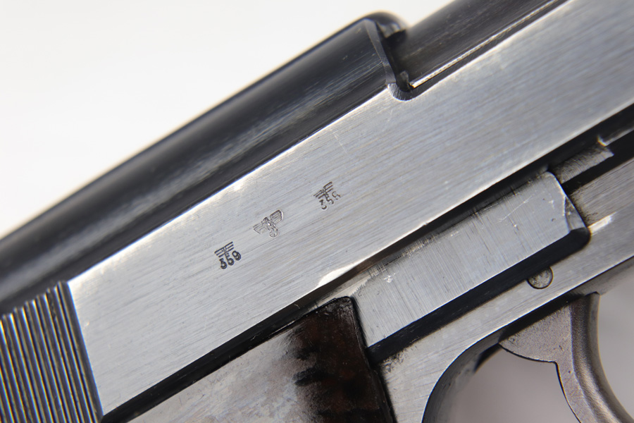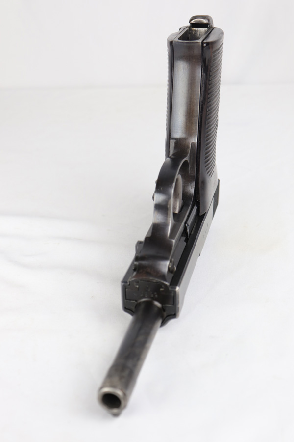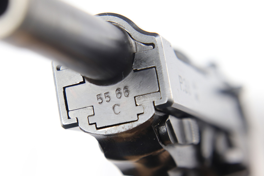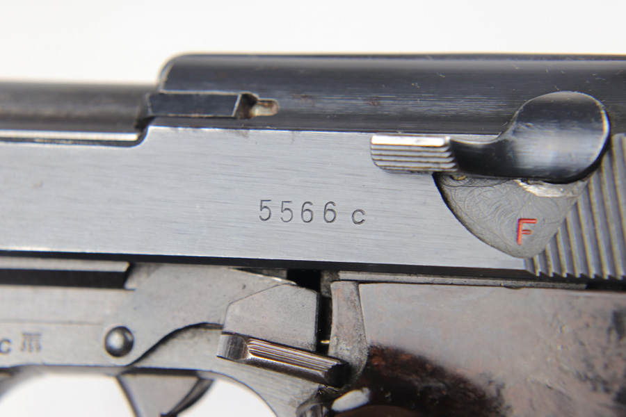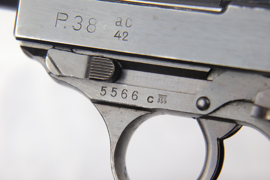 2/21/19 – This is a nice example of a Nazi Walther P.38 from 1942 with the very hard to find matching magazine. Compared to the ‘ac 42’, we see about 10x the amount of ‘ac 41’ P.38s with matching magazines. This gun is all matching and original with 92-94% blue. The majority of finish loss is on the barrel, though the front strap shows some thinning. Grips are waffen marked but properly unnumbered. Bore is shiny with strong rifling and a hint of frost. Proper functionality, including de-cocker.