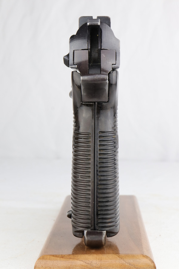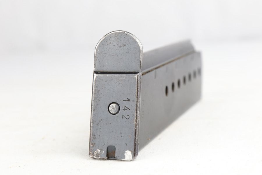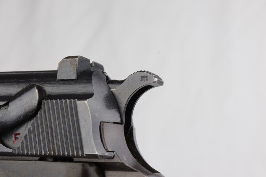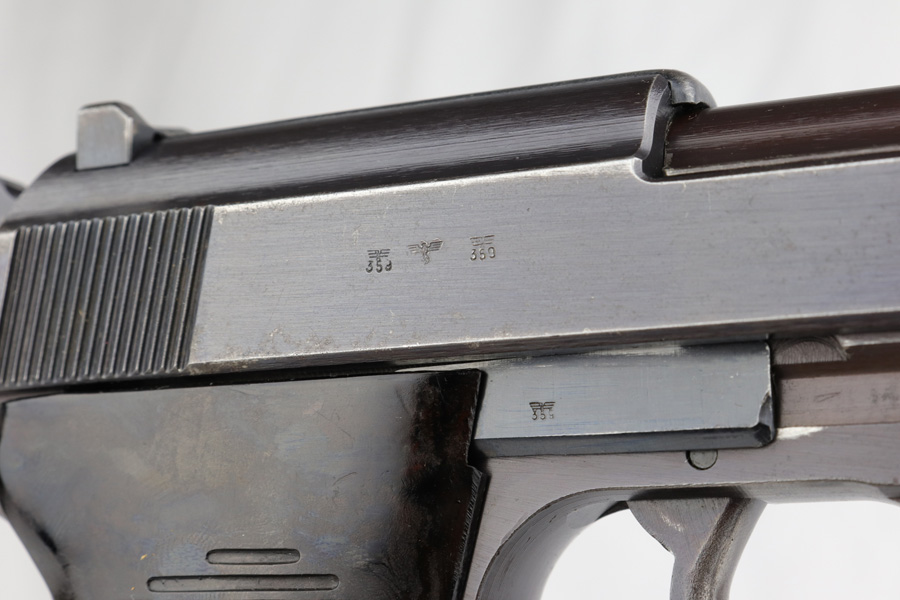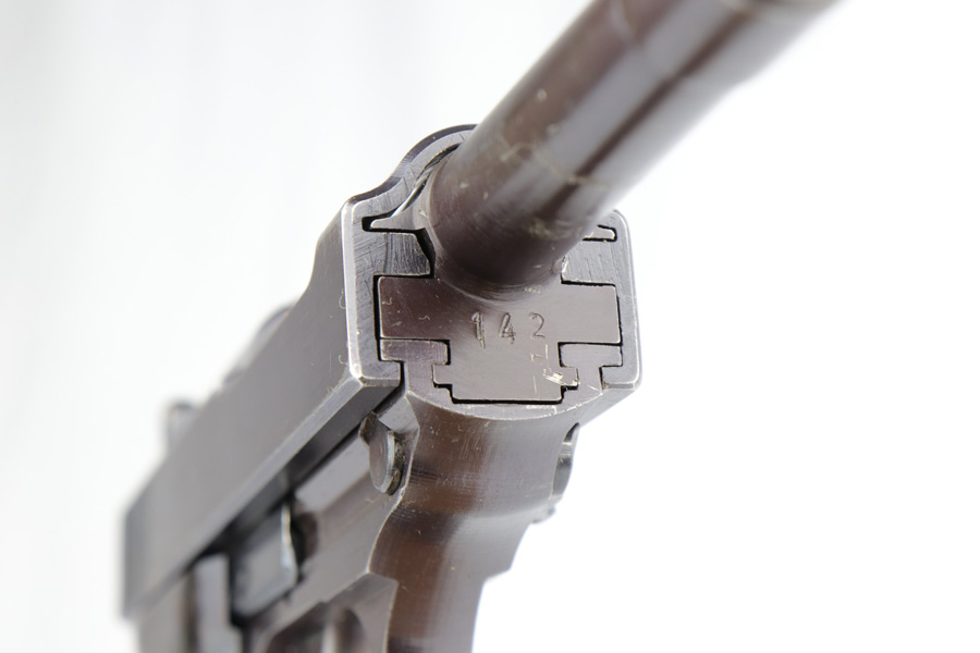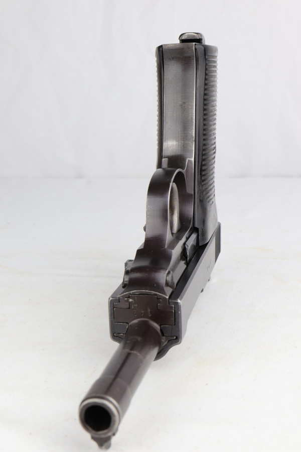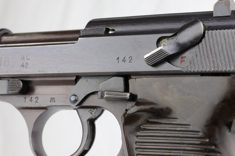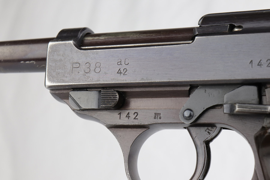 7/22/19 – This is an all matching and original Walther P.38 from 1942, and one of the first P.38s ever produced with the ‘ac 42’ factory code. The pistol is serial number 142 with no suffix, meaning it was one of the first 150 produced. The pistol retains 90+% military blue, with most of the finish loss on the front strap and underside of the barrel. There is also a notable area of pinpricking on the left side of the slide. All small parts properly feature the Walther waffenamt, including the grips, which are not numbered. Good mechanics, including de-cocker. Strong, shiny bore.