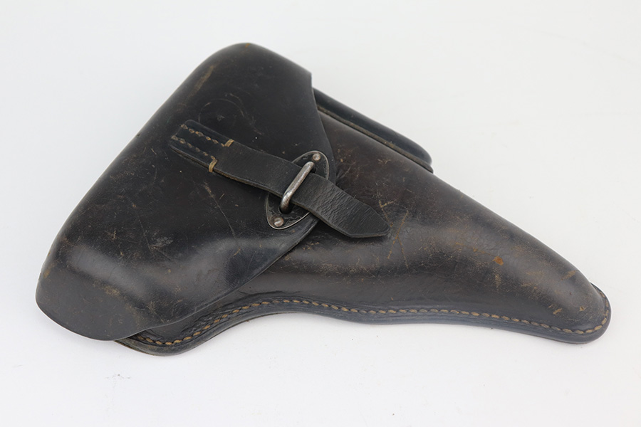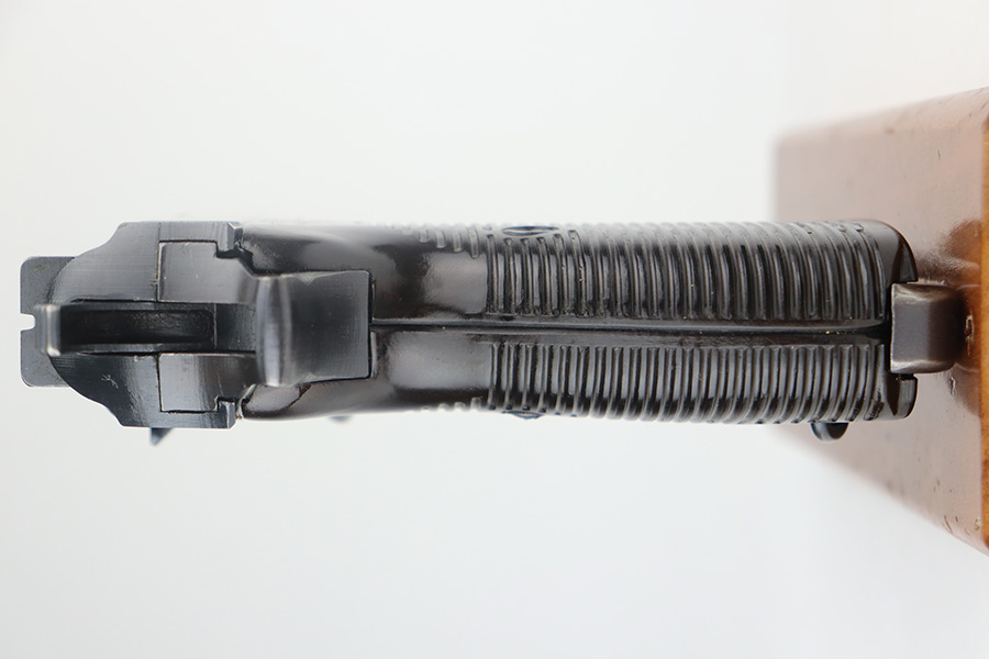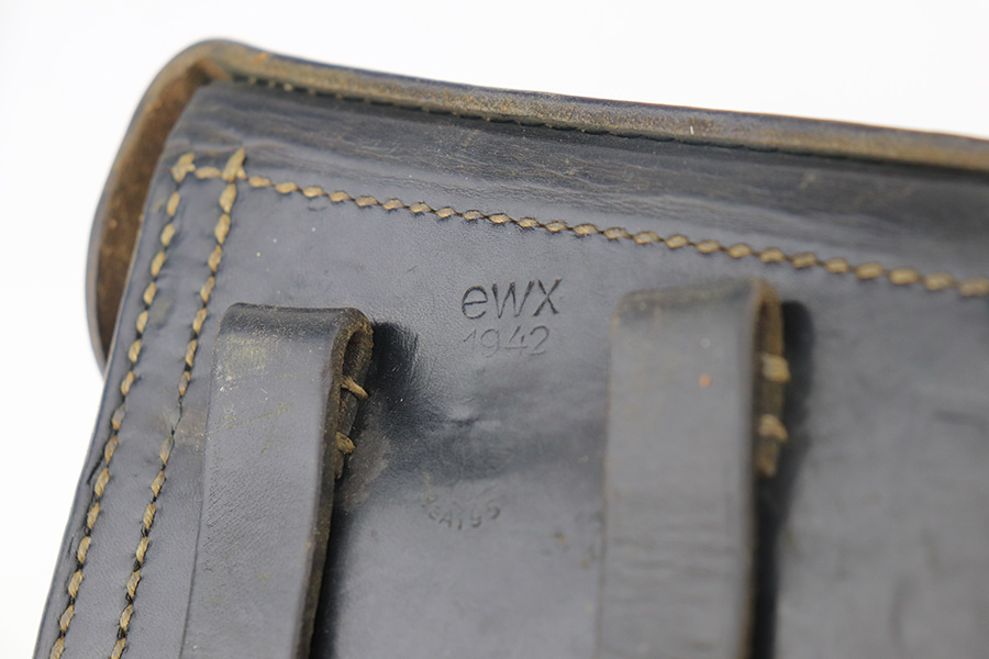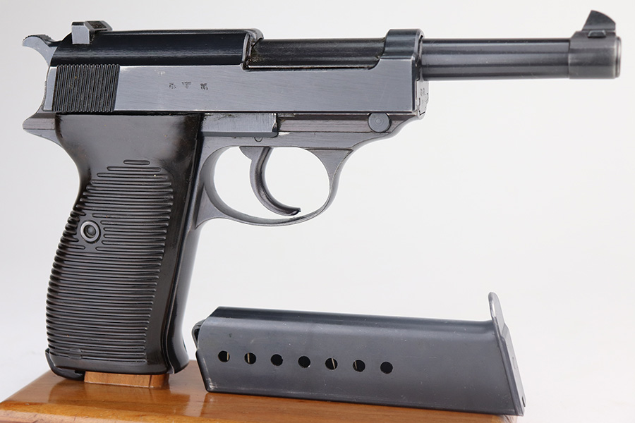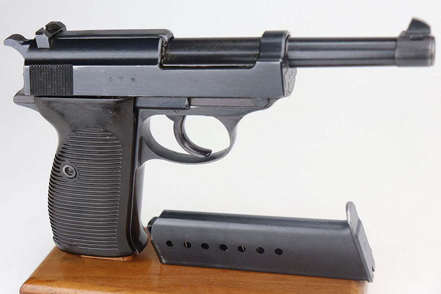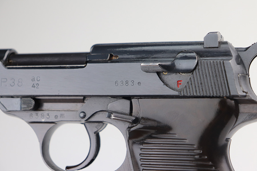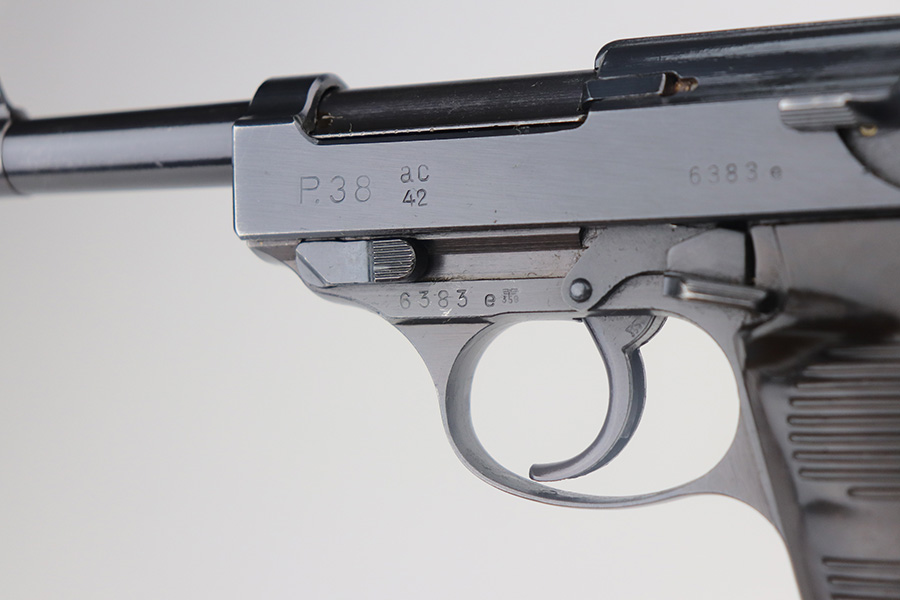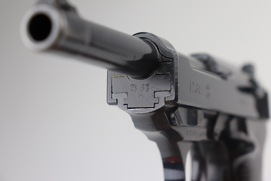 4/19/23 – This is a beautiful example of an AC 42 Walther P.38 issued to the Nazi military in 1942. It is all matching with the proper “Eagle 359” military acceptance proofs throughout. It comes as a rig with a very nice 1942-dated hard shell holster and two “Eagle 359” marked Walther magazines. It appears there was a pin on the holster’s top flap that has been removed. The gun has retained nearly all of its original finish with very minor wear around the muzzle and on the top plate. Just a hint of thinning on the front strap. Fitted with excellent blackish-brown bakelite grips. Excellent bore with strong rifling. De-cocker is functional.