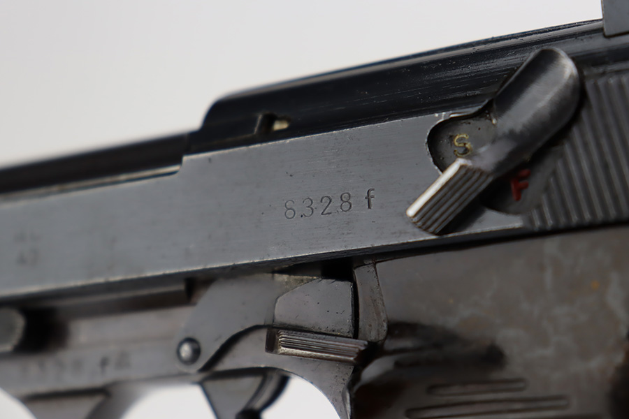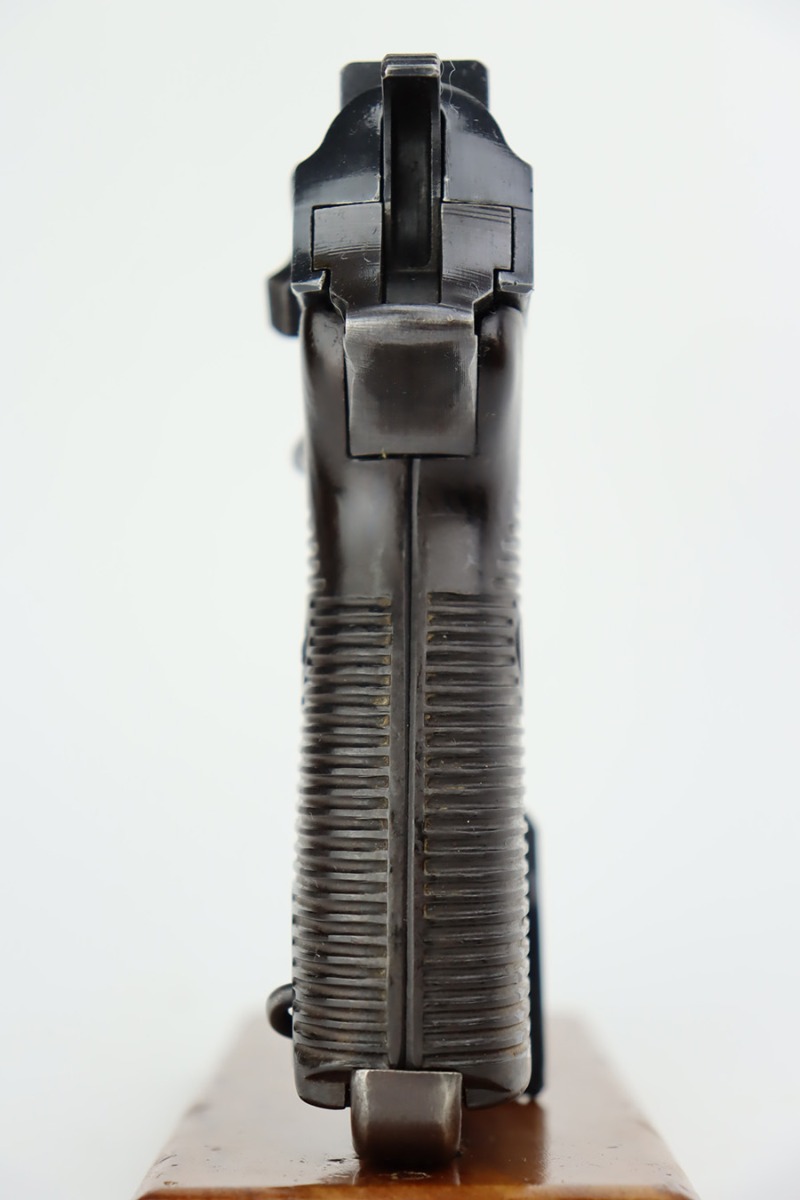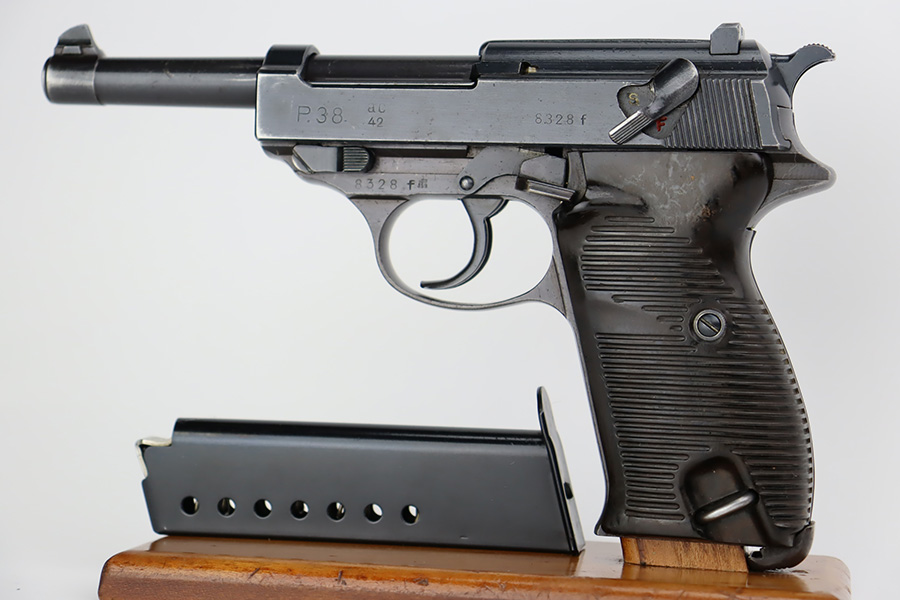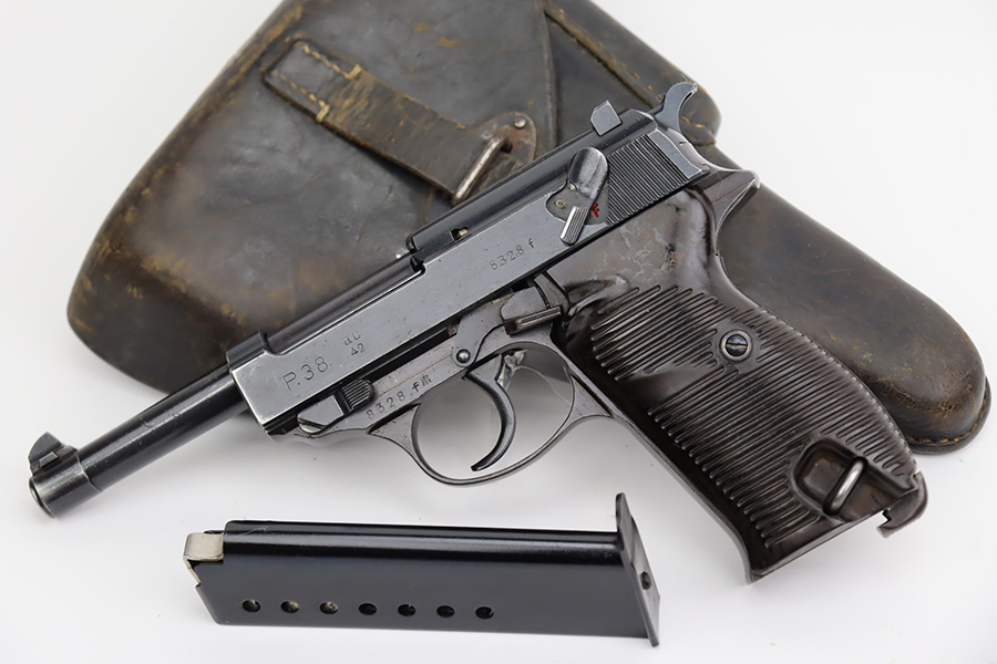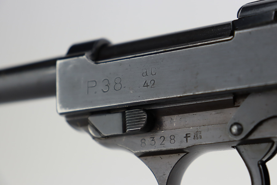 8/29/23 – This is a very nice example of an AC 42 Walther P.38 issued to the Nazi military in 1942. It is all matching and has the proper “Eagle 359” military acceptance proofs throughout. It comes as a rig with a 1942-dated hard shell holster and a reproduction magazine. The gun itself has retained about 90-92% of its original finish. The majority of the finish loss is on the front strap, but there is also minor wear around the muzzle and around the high edges of the slide. Fitted with excellent period-correct blackish-brown bakelite grips. The bore has strong rifling with just some very light freckling in the grooves. De-cocker is functional.