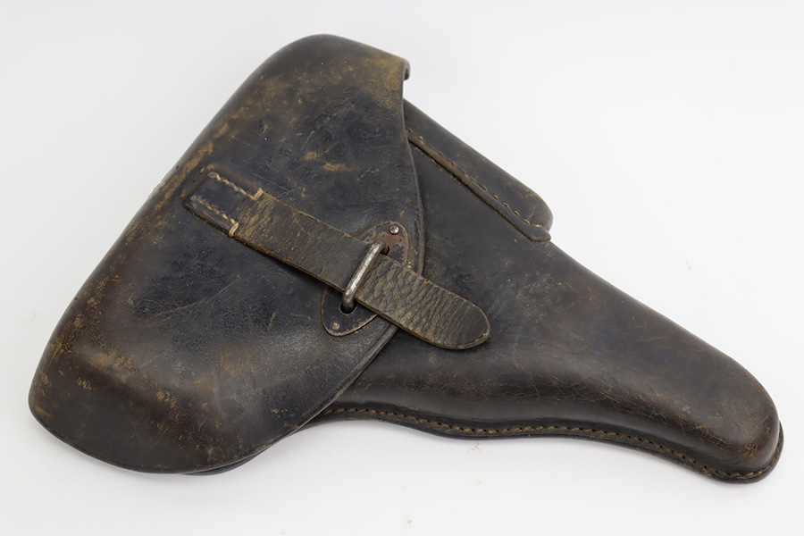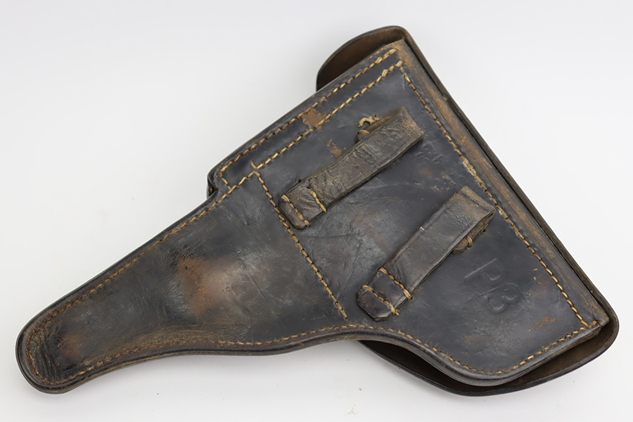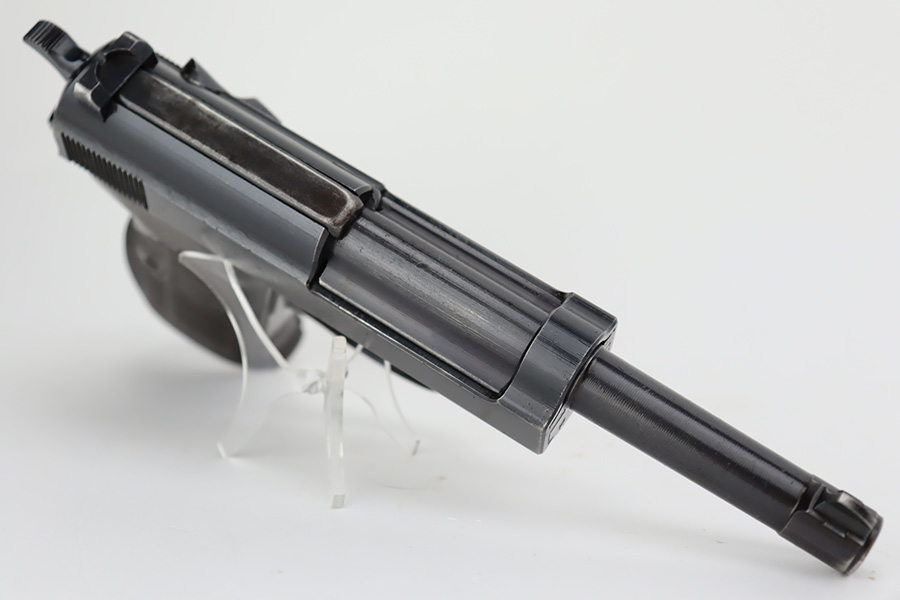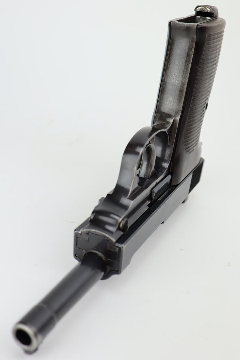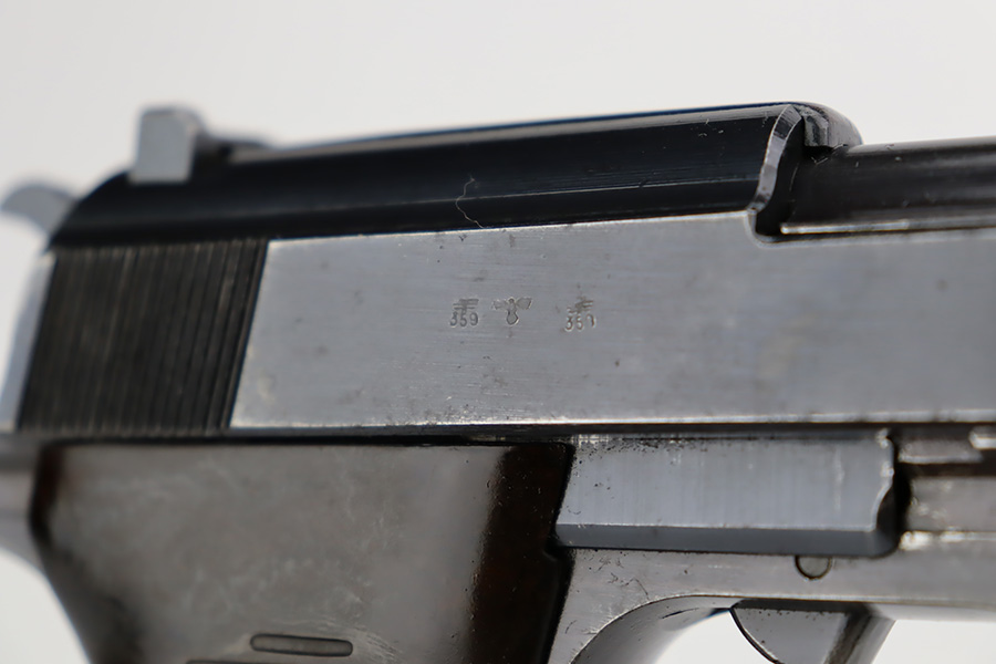 8/29/23 – This is a very nice example of an AC 42 Walther P.38 issued to the Nazi military in 1942. It is all matching and has the proper “Eagle 359” military acceptance proofs throughout. It comes as a rig with a 1942-dated hard shell holster and a reproduction magazine. The gun itself has retained about 90-92% of its original finish. The majority of the finish loss is on the front strap, but there is also minor wear around the muzzle and around the high edges of the slide. Fitted with excellent period-correct blackish-brown bakelite grips. The bore has strong rifling with just some very light freckling in the grooves. De-cocker is functional.
