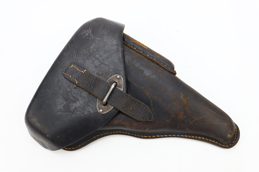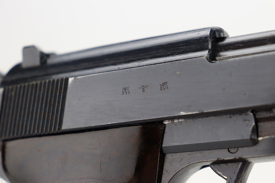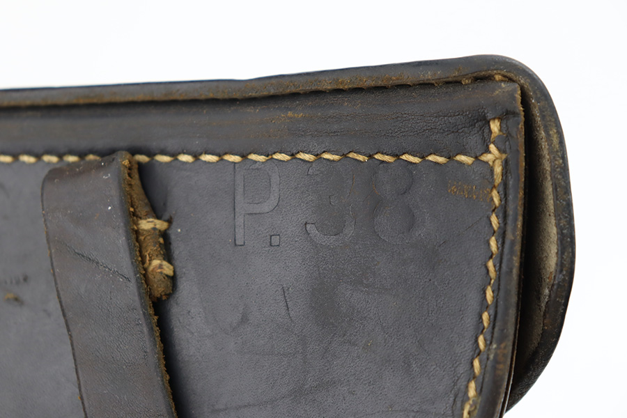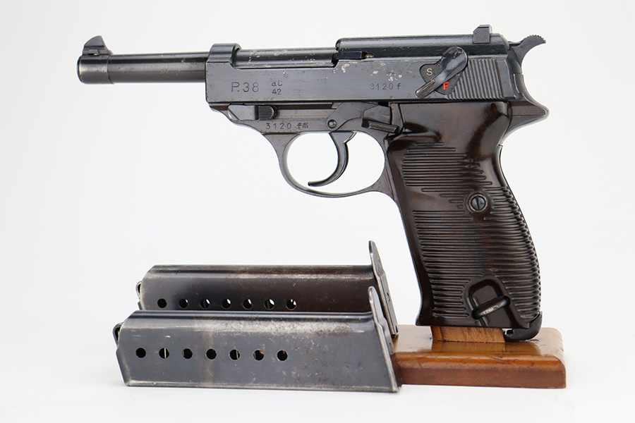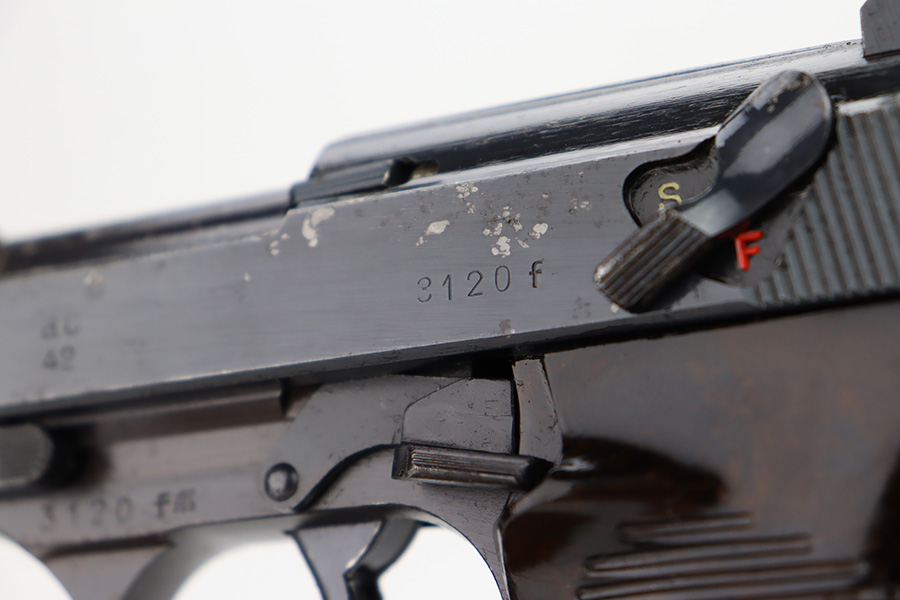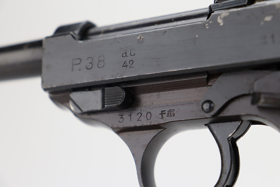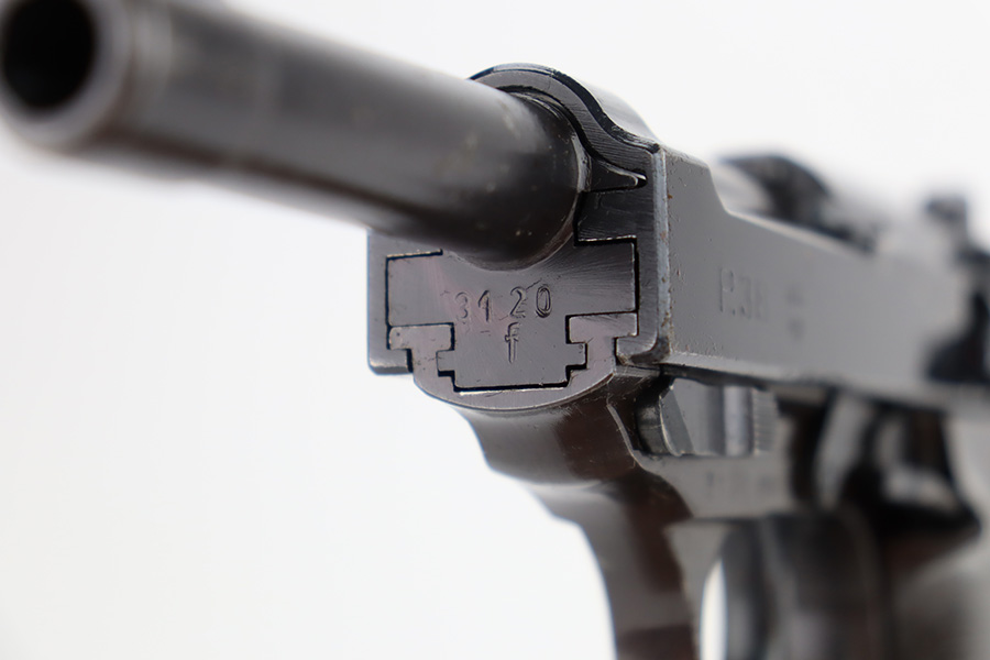12/1/23 – This a nice AC 42 Walther P.38 issued to the German military in 1942. All matching with the proper “Eagle 359” military acceptance proofs. It comes as a rig with a nice 1943-dated hard shell holster, an un-numbered Walther magazine, and one post-war magazine. The gun itself has retained about 92% of its finish. The majority of the wear is on the front strap, but there is splotchy discoloration on the top of the barrel and on the left side of the slide. Fitted with period-correct bakelite grips. Very nice bore with great rifling. De-cocker is functional.