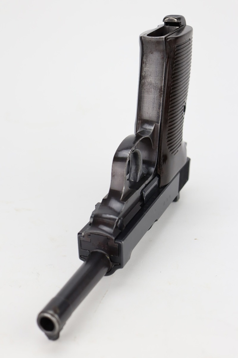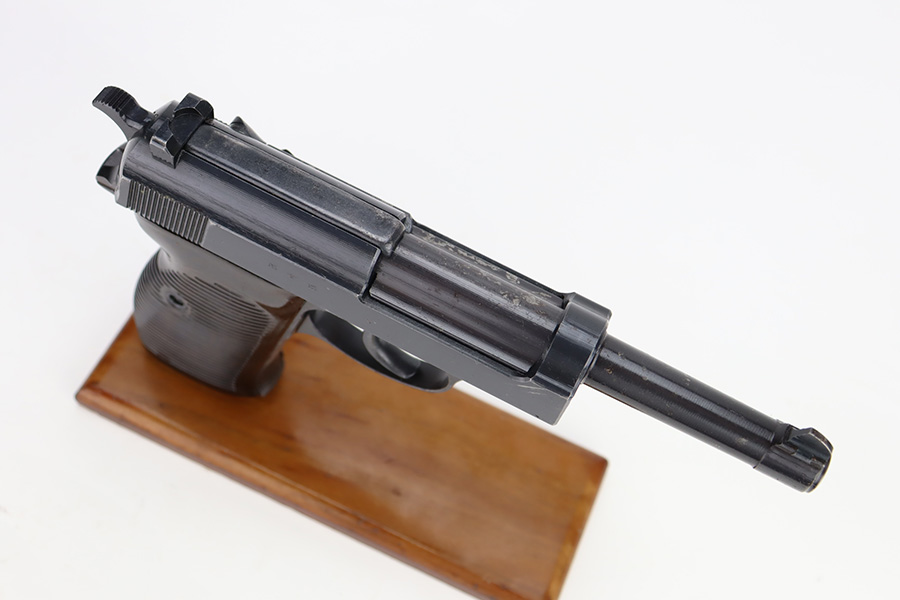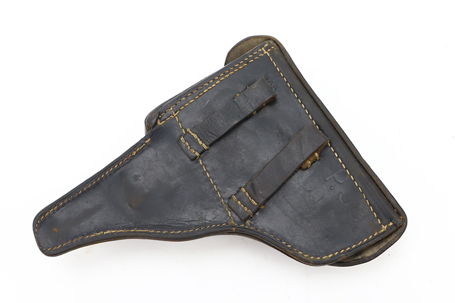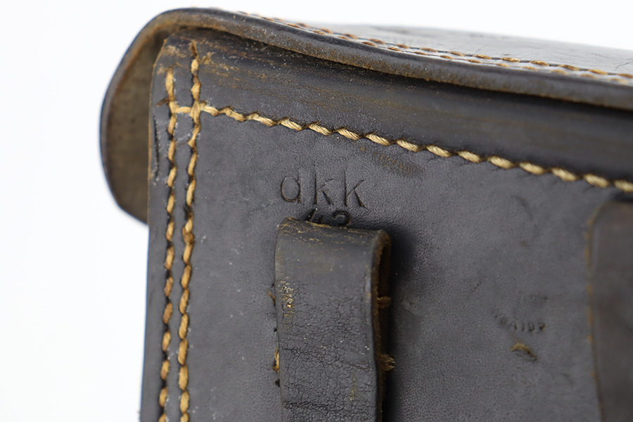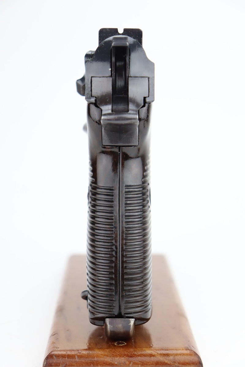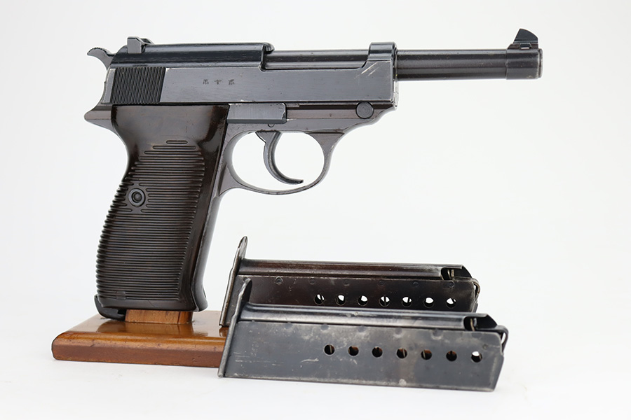 12/1/23 – This a nice AC 42 Walther P.38 issued to the German military in 1942. All matching with the proper “Eagle 359” military acceptance proofs. It comes as a rig with a nice 1943-dated hard shell holster, an un-numbered Walther magazine, and one post-war magazine. The gun itself has retained about 92% of its finish. The majority of the wear is on the front strap, but there is splotchy discoloration on the top of the barrel and on the left side of the slide. Fitted with period-correct bakelite grips. Very nice bore with great rifling. De-cocker is functional.