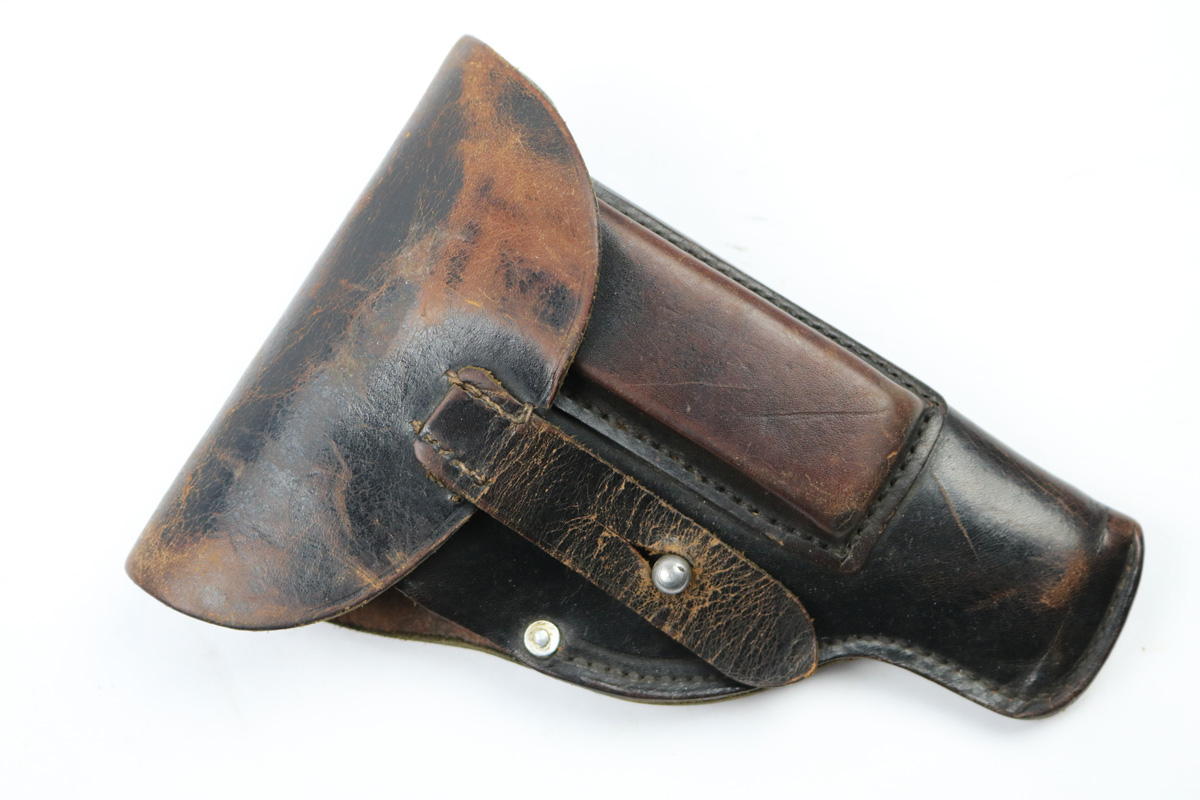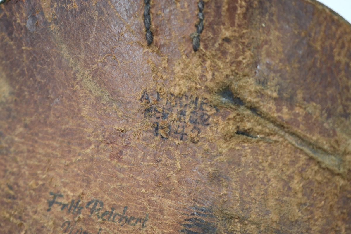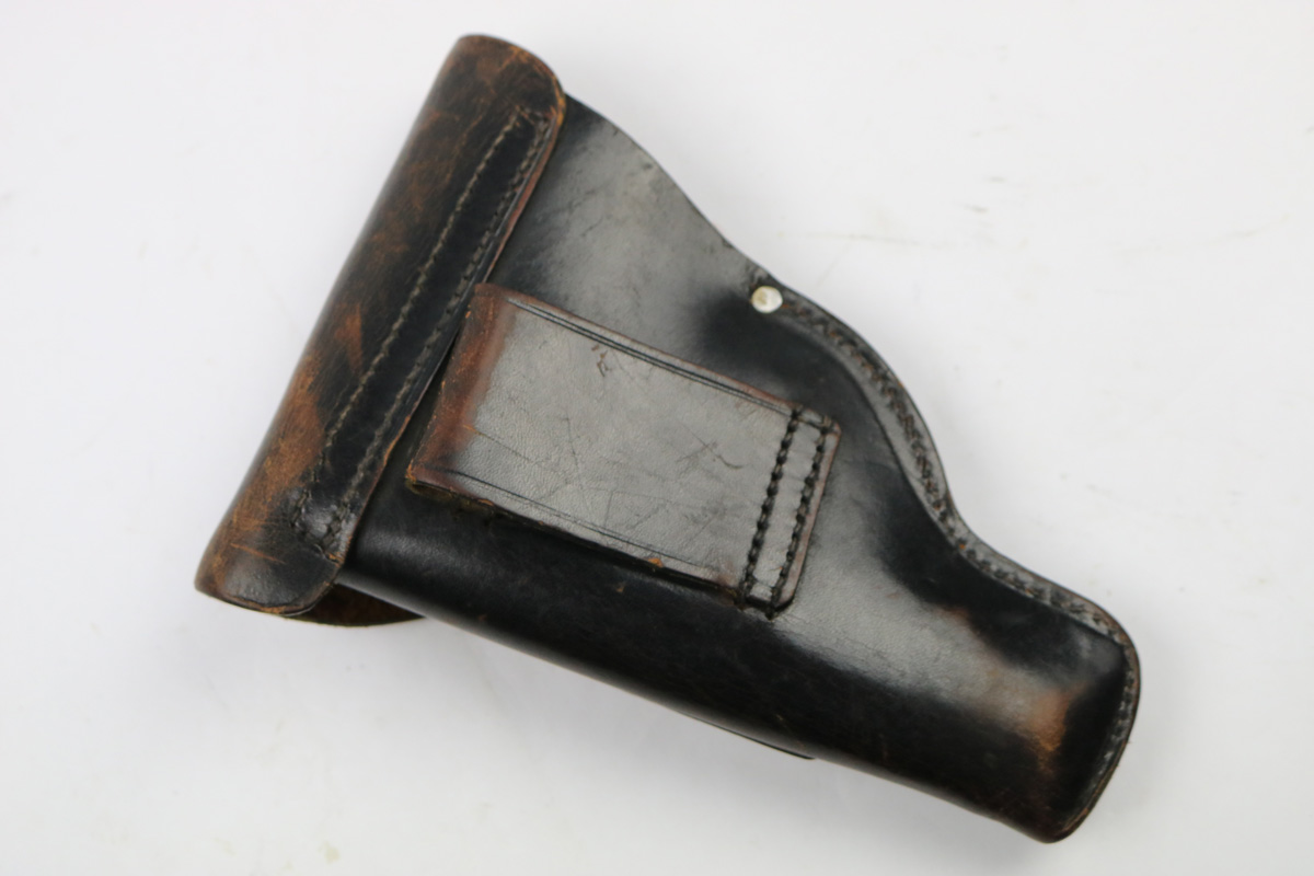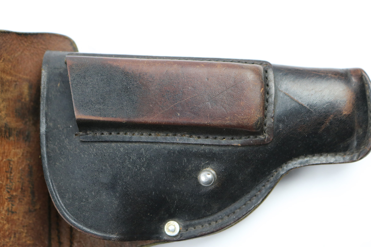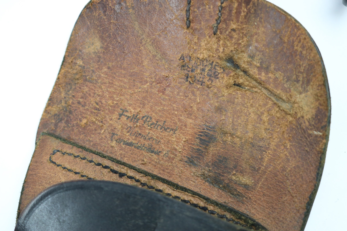 6/21/18 – This is an original 1942 dated Walther PP holster. The holster can also hold similar sized 7.65mm axis pistols from WW2. The holster isn’t police stamped, but the interior leather is A FISCHER maker stamped with a 1942 date. There’s also some light interior leather handwriting (appears German). The leather has some exterior discoloration and wrinkling, but is all in tact and original. The stitching is all original and in tact as well.