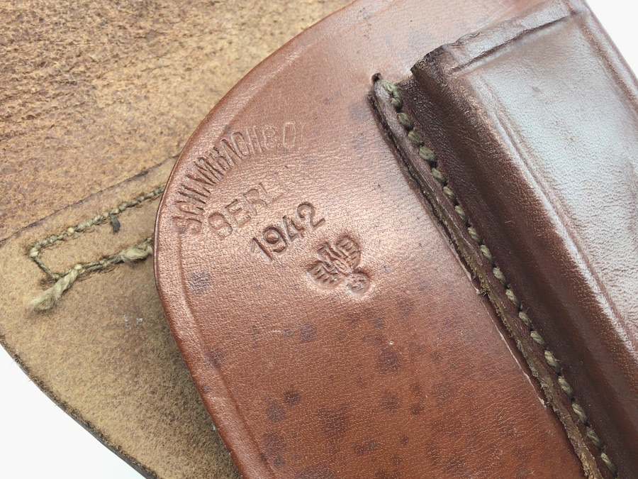 1/31/22 – This is an original 1942 dated Walther PPK (or similar sized pistol) holster. The holster is dated, police eagle B stamped, and maker stamped under the closure strap. Minty leather is firm and clean. All original stitching. Very hard to upgrade police holster!
