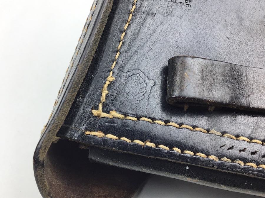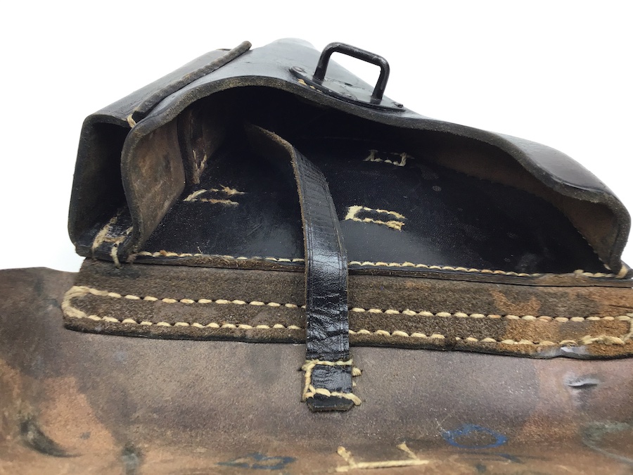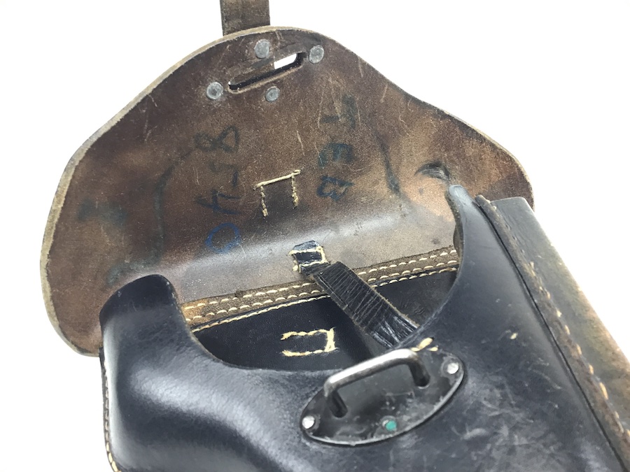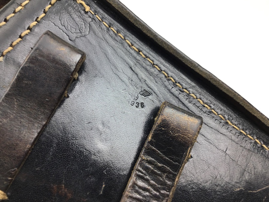 5/26/20 – This is an original WW2 era 1943 dated P.38 holster. The holster has a rare bearskin oak leaf 9 maker stamp on the back leather with a waffen WaA938 military proof stamp. The holster leather is in great shape with strong leather and stitching. There is some surface wear on the closure lid. The interior leather is very clean with a secure lift strap. Personalized under the closure lid.