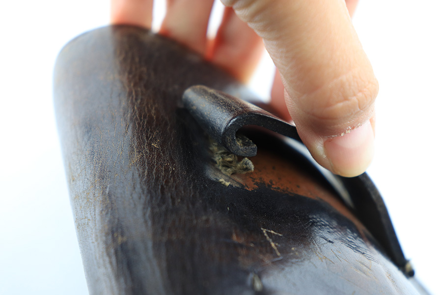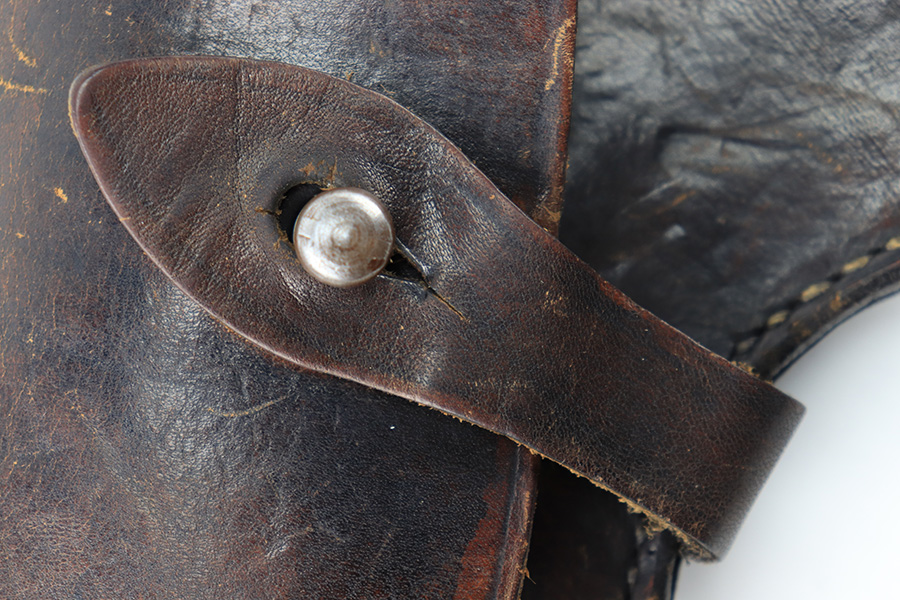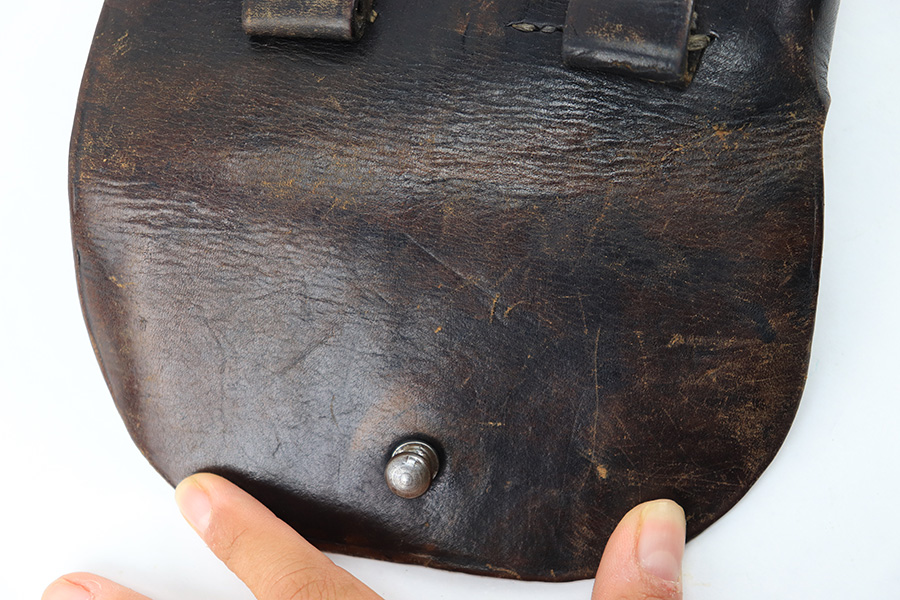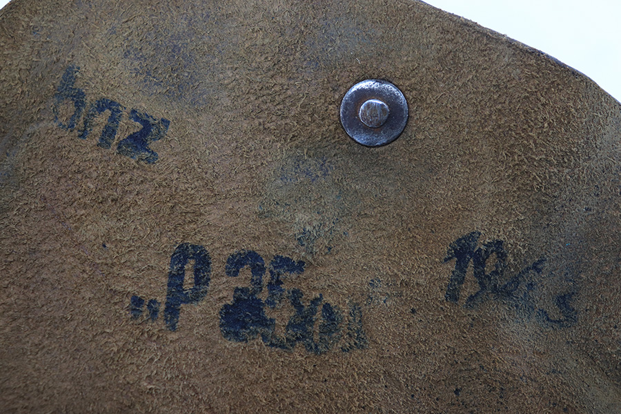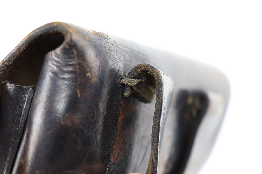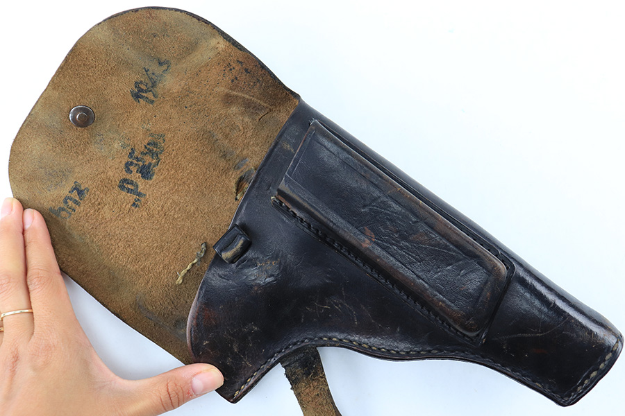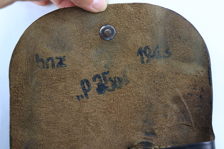 8/11/23 – This is an original WW2 production Radom P.35 pistol holster. The holster is in great overall condition with some normal surface wear, light wrinkling, and mild discoloration throughout the exterior. The stitching is all original, but some of the stitching on the top of the belt loops is slightly loose. The belt loops are still attached and secure however. The interior leather is ink stamped with a “bnz” maker code, 1943 date, and model designation stamp. Great overall condition.