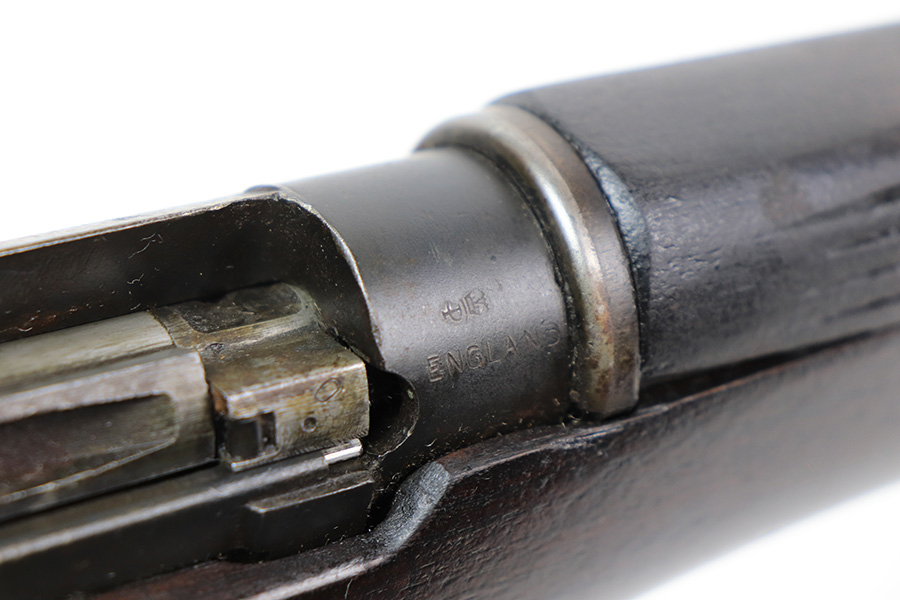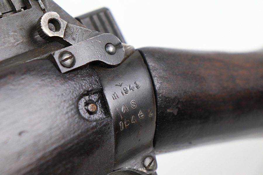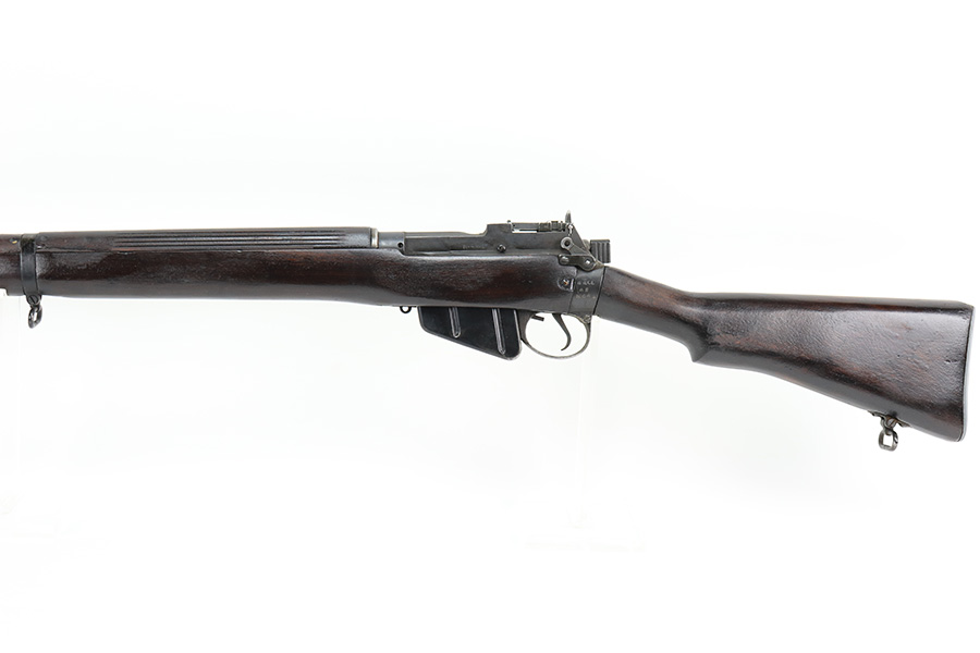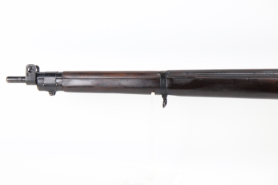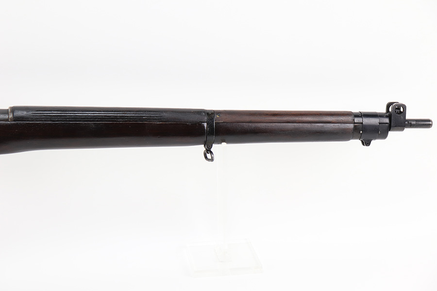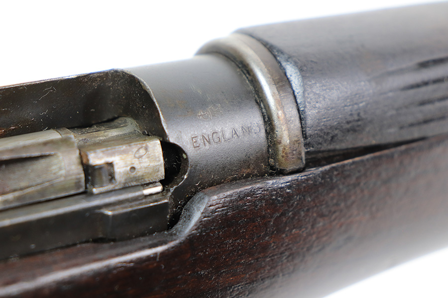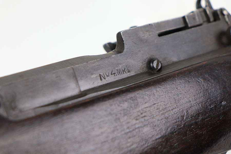 3/15/22 – This is a very nice example of an Enfield No 4 Mk 1 rifle issued to the British military in 1943. The gun is all matching and has the proper British proofs throughout. Very light British export mark on the right side of the barrel. There is minor muzzle wear and some light scratches on the barrel bands and magazine. Minor wear on the high edges of the receiver, and the finish on the bolt handle is thin. Excellent stock with only minor surface scuffs here and there. The bore has good rifling, but there is very minor pin-pricking throughout and some tiny pits in the grooves.