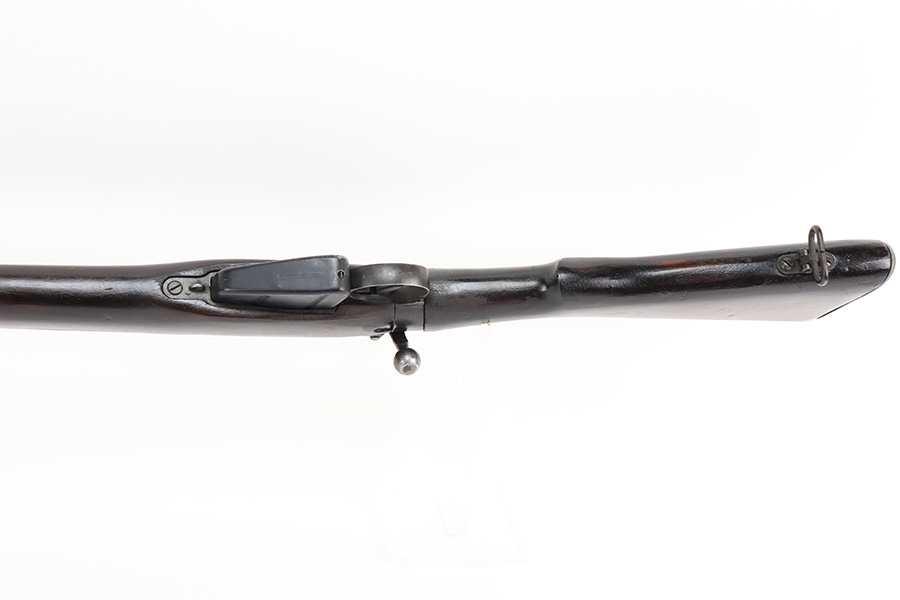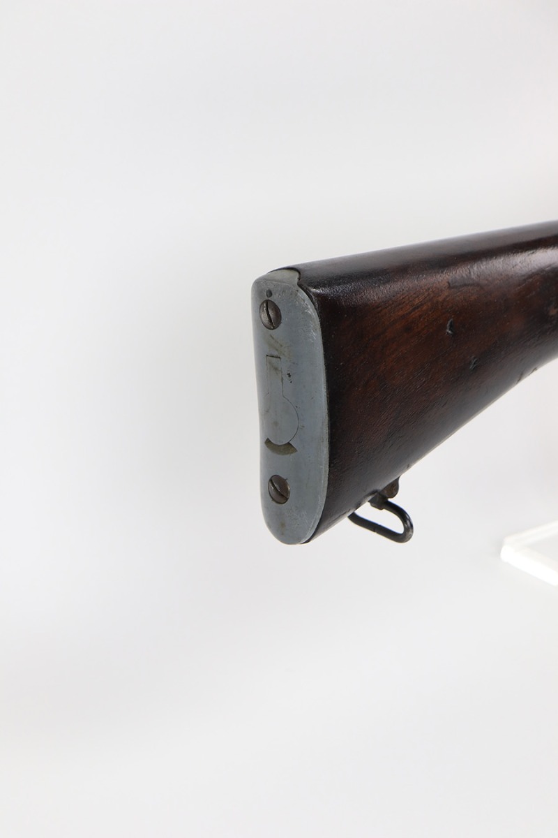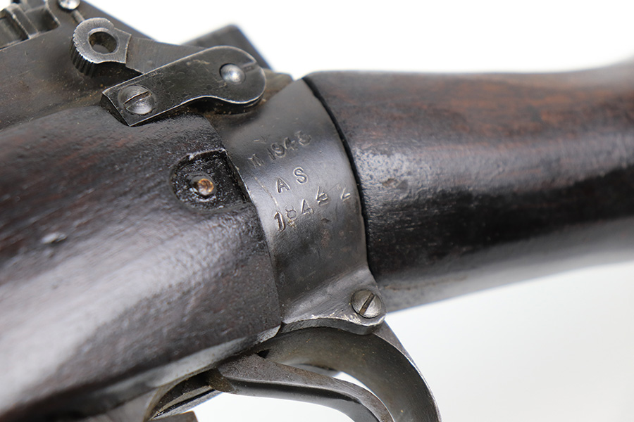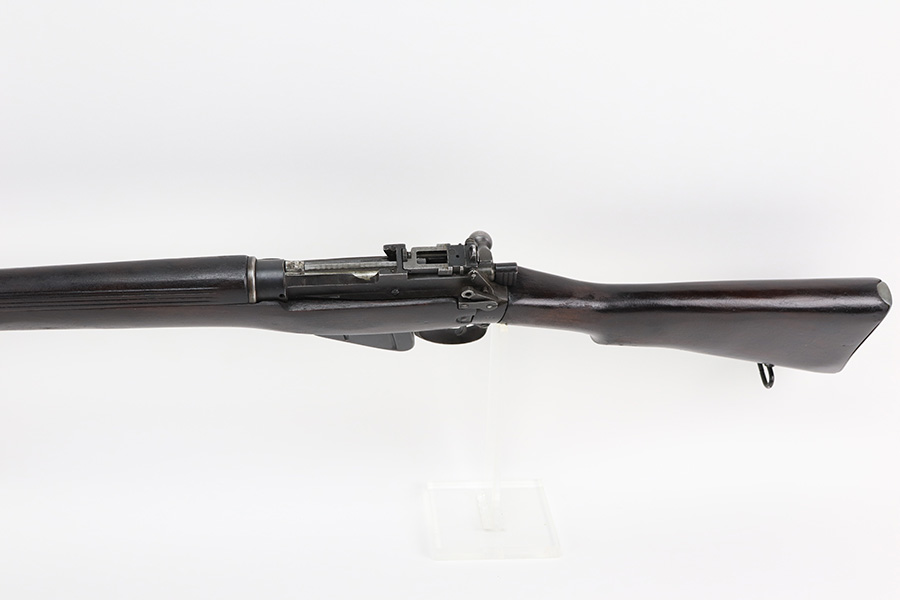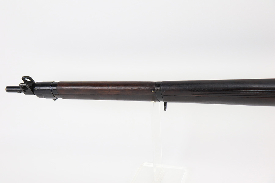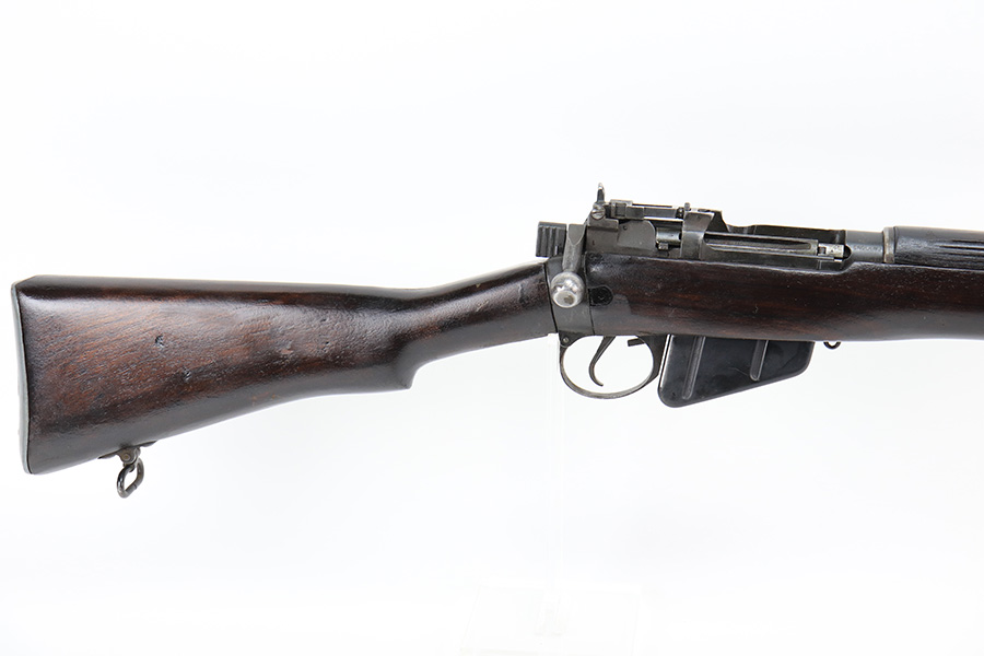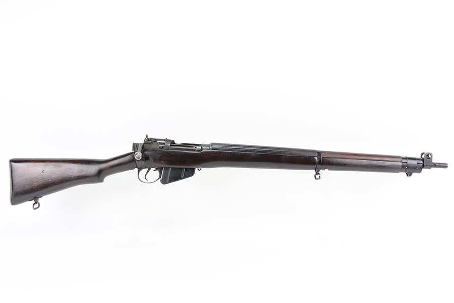 3/15/22 – This is a very nice example of an Enfield No 4 Mk 1 rifle issued to the British military in 1943. The gun is all matching and has the proper British proofs throughout. Very light British export mark on the right side of the barrel. There is minor muzzle wear and some light scratches on the barrel bands and magazine. Minor wear on the high edges of the receiver, and the finish on the bolt handle is thin. Excellent stock with only minor surface scuffs here and there. The bore has good rifling, but there is very minor pin-pricking throughout and some tiny pits in the grooves.