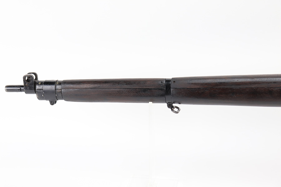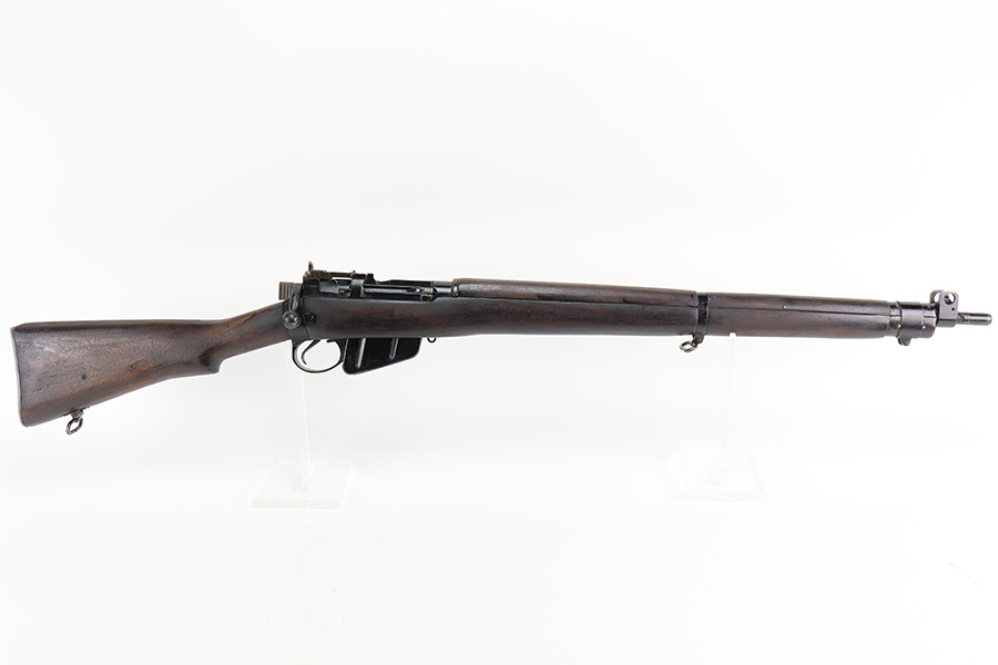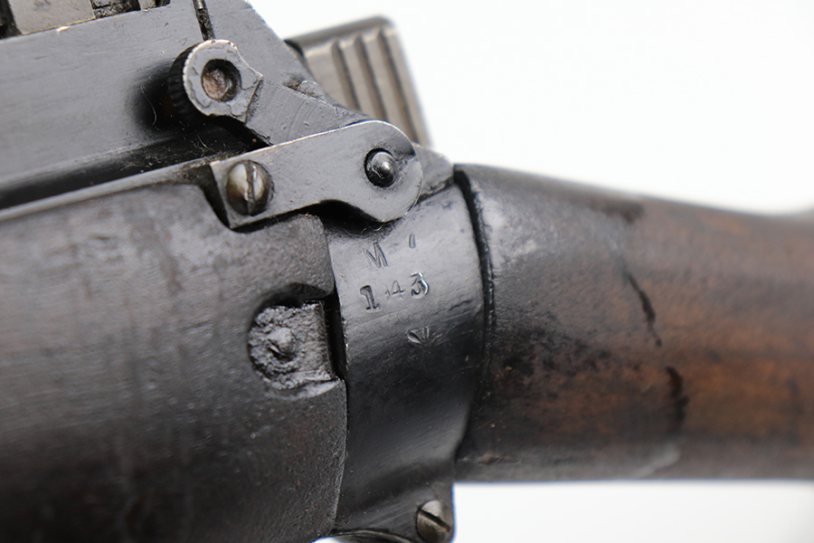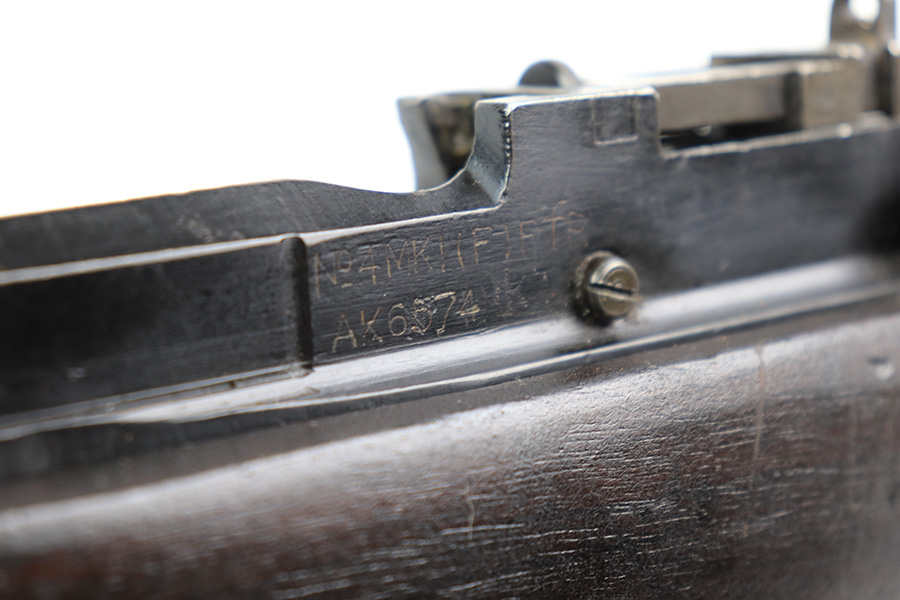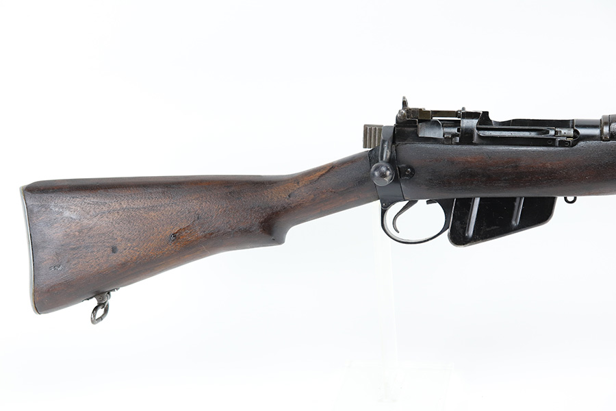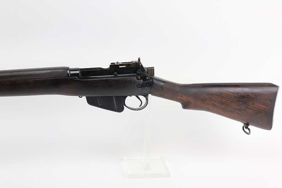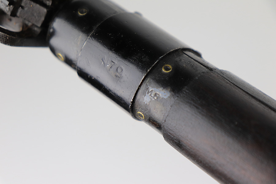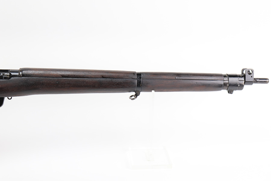 3/25/22 – This is an excellent example of an Enfield No 4 Mk 1 rifle issued to the British military in 1943. It is matching, dated 1943 on the receiver, and has the proper British proofs throughout. No visible markings on the stock. it has retained most of its black painted finish. In general, there is minor wear around the high edges and around the muzzle. There are some tiny chips in the black finish around the muzzle and front sight. Minty wood stock with a few minor scuffs. it may have been lightly sanded and a very thin layer of lacquer applied. The bore is near-mint.