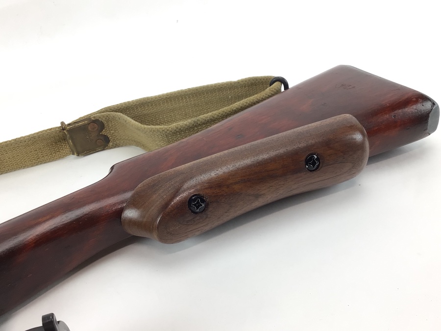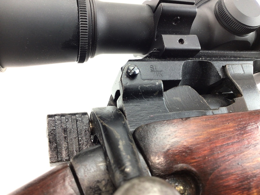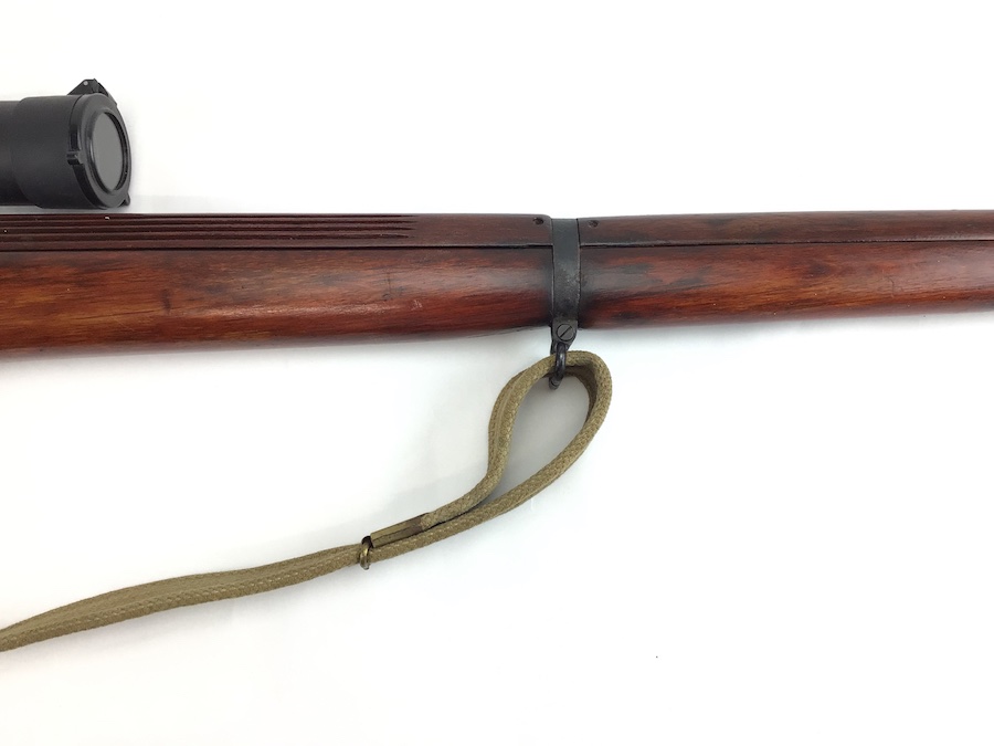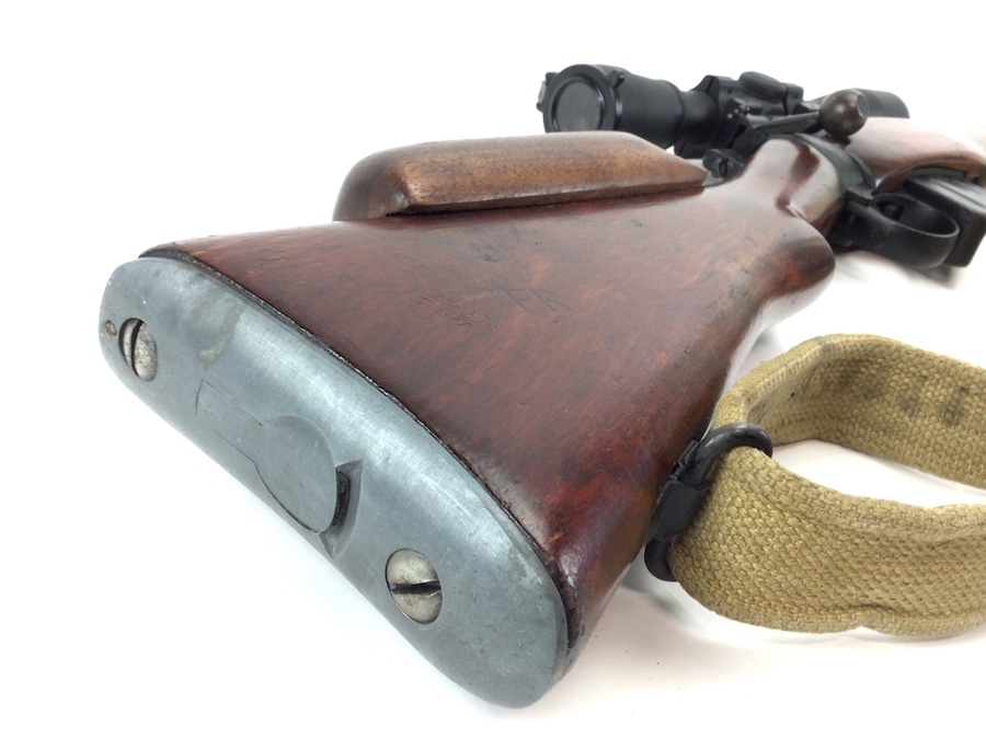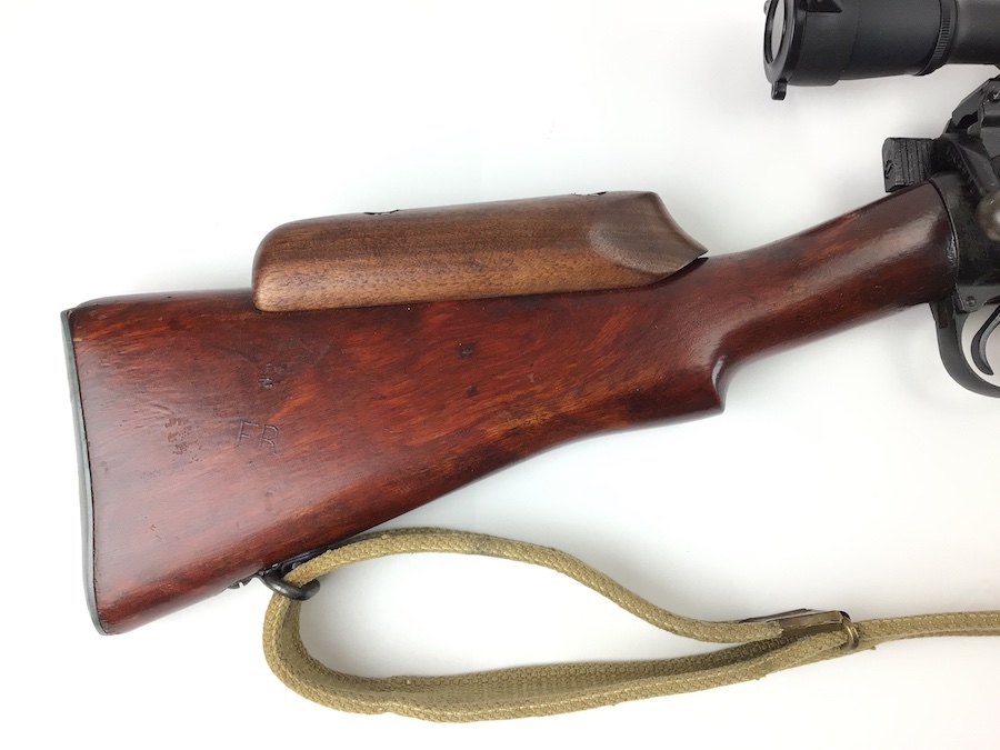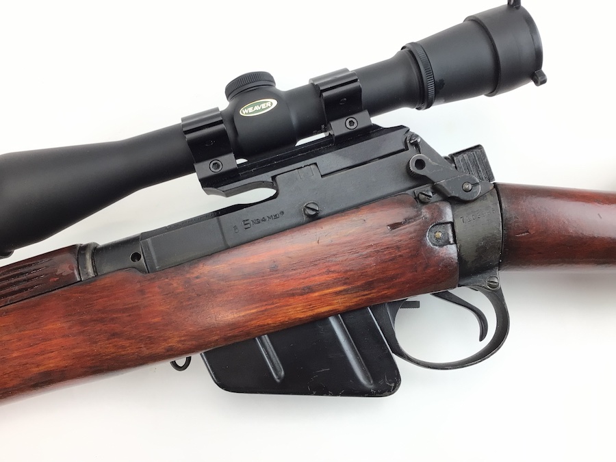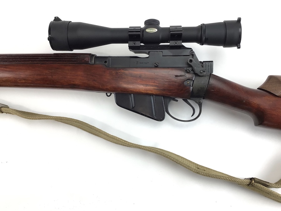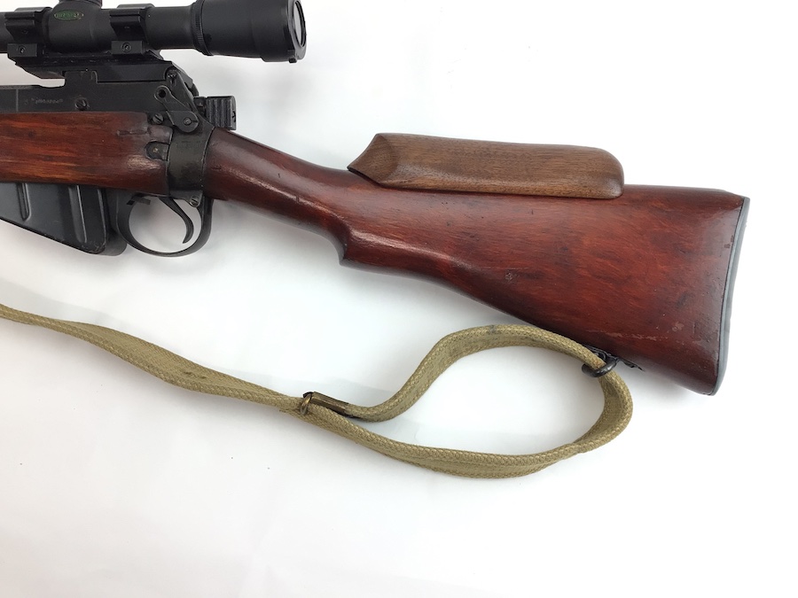 8/10/21 – British Enfield SMLE rifle. No. 4 Mark 1 chambered in .303 caliber. Made by Savage as part of the lend lease program. U.S. Property marked. No import marks. Excellent stained reddish birch wood. All matching parts and stock, as well as a matching magazine. The 2-groove bore rates about an 8 of 10 with minor wear. Stamped w/ flaming bomb (US) – square S – No. 4 Mk1. WW II canvas sling marked 1945. Includes a Weaver K-6 scope with crystal clear optics. S&K Insta Mount base and Leupold lowmount rings. Reproduction sniper stock cheek piece.