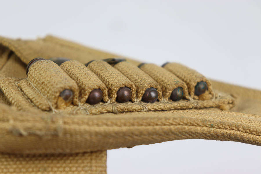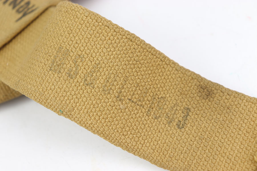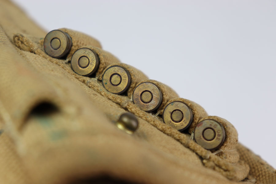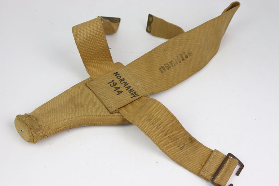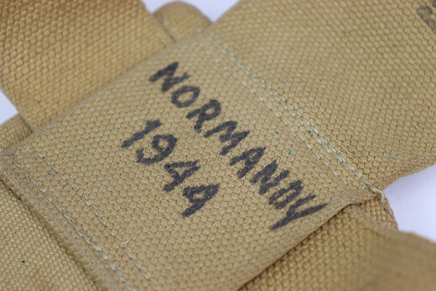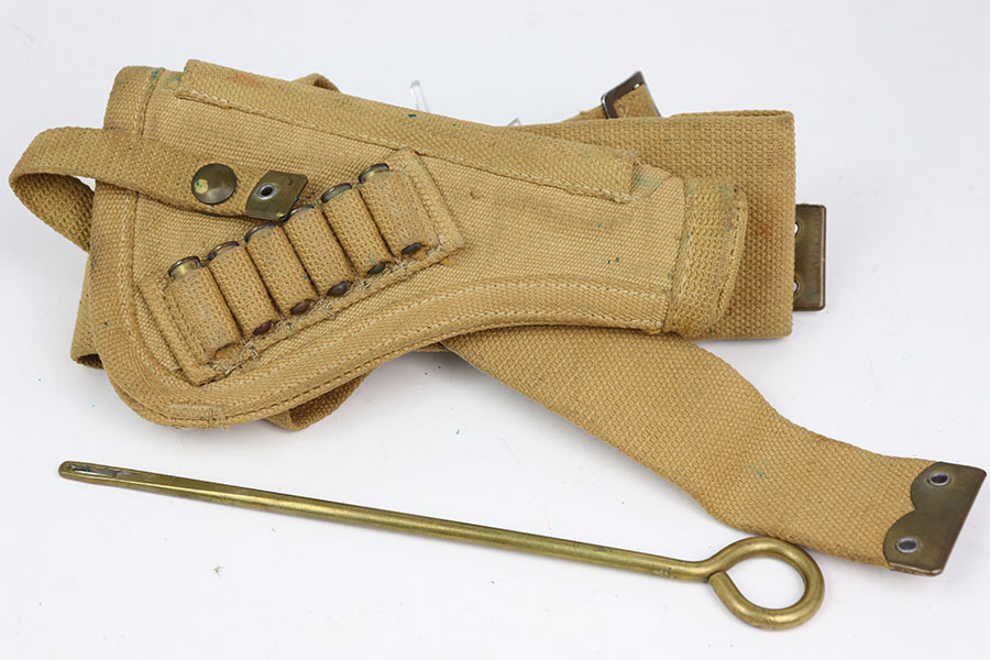 6/26/24 – This is a 1943 British tanker revolver holster & belt that comes with six 380 2Z rounds in the holster. This holster is in excellent shape with very little signs of wear just some dirt and verdigris smudges. The holster is ink stamped “Normandy 1944” on the back side as well as maker and dated 1943 along the inside of the belt. All stitching is fully intact and comes with cleaning rod. Nice original example.