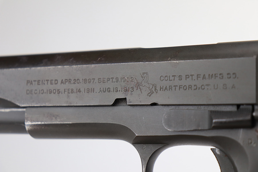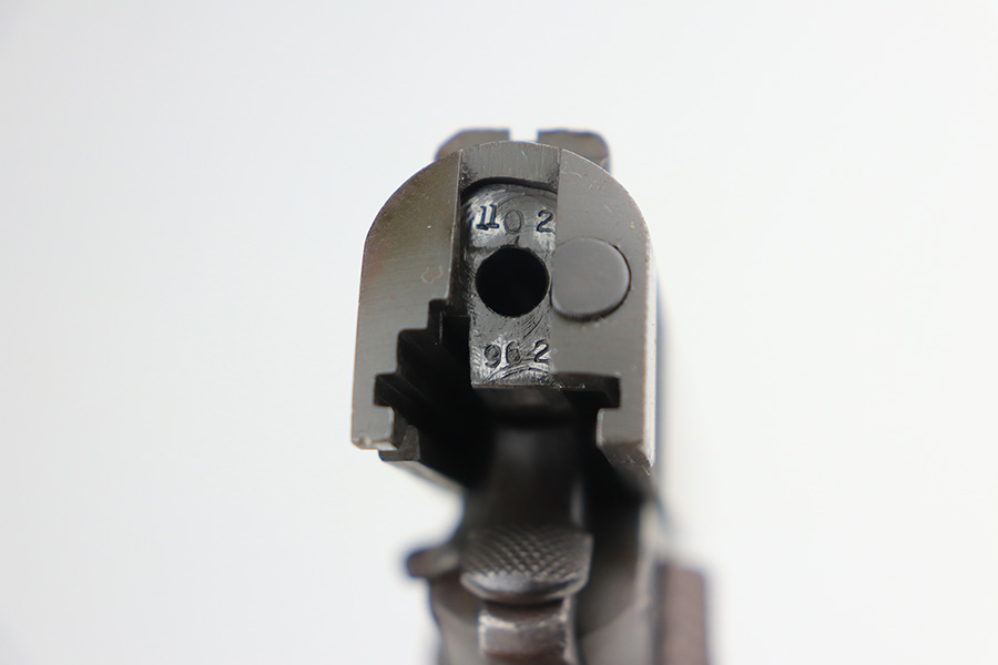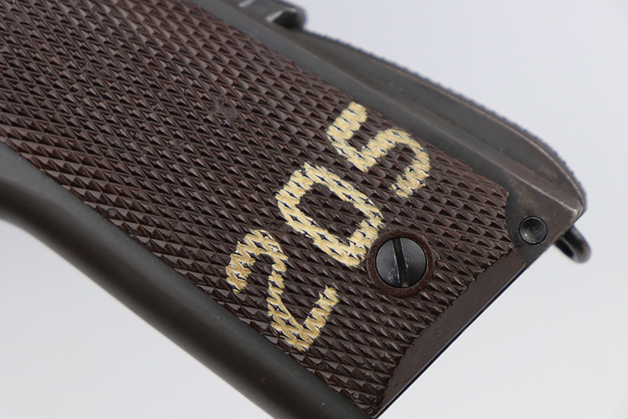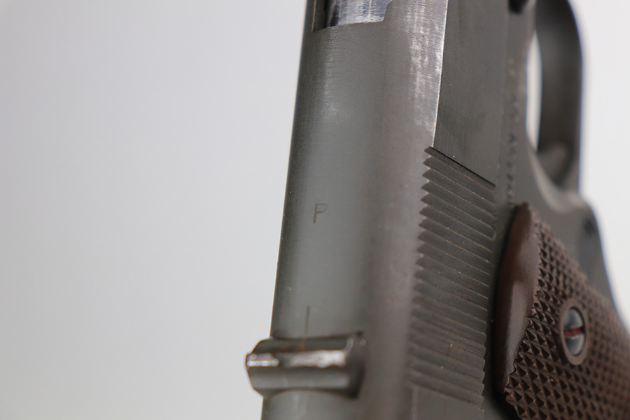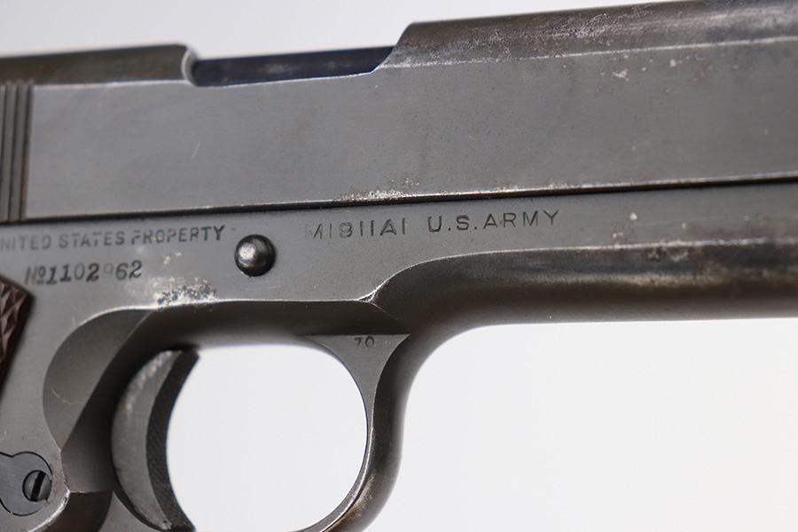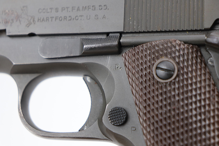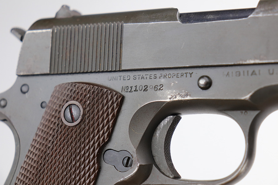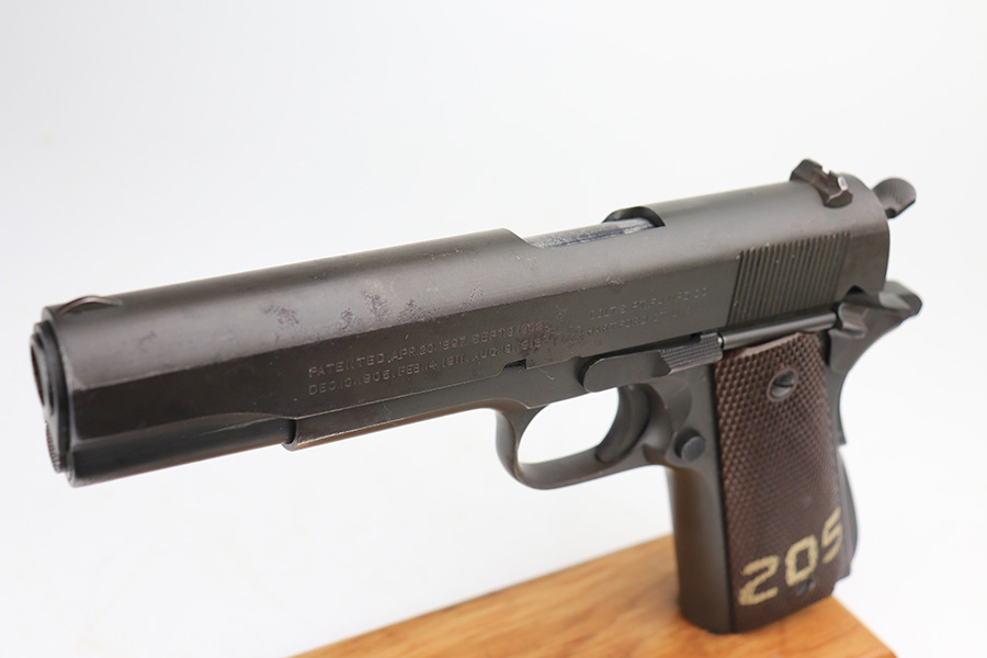 2/4/22 – This is an original Army Colt 1911A1 from 1943 with matching numbered slide. The parkerized finish is fairly nice overall but there are various areas of pitting along the top and left sides of the slide, and another patch on the right side of the frame. Original Colt barrel with small ‘F’ under lug. Strong bore with signs of use but no pitting. Nice grips with a rack number painted on the left panel. ‘S’ marked magazine.