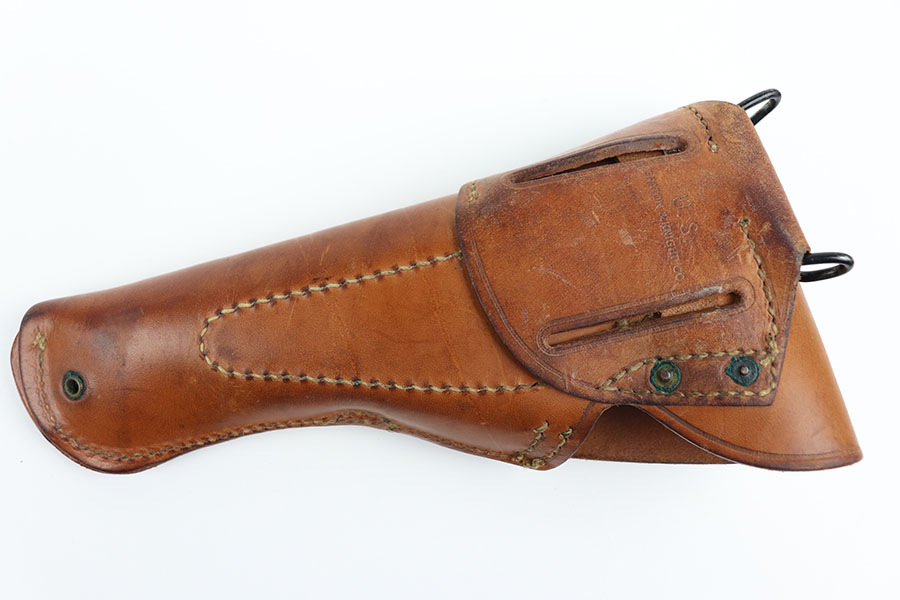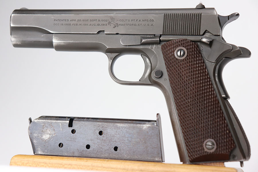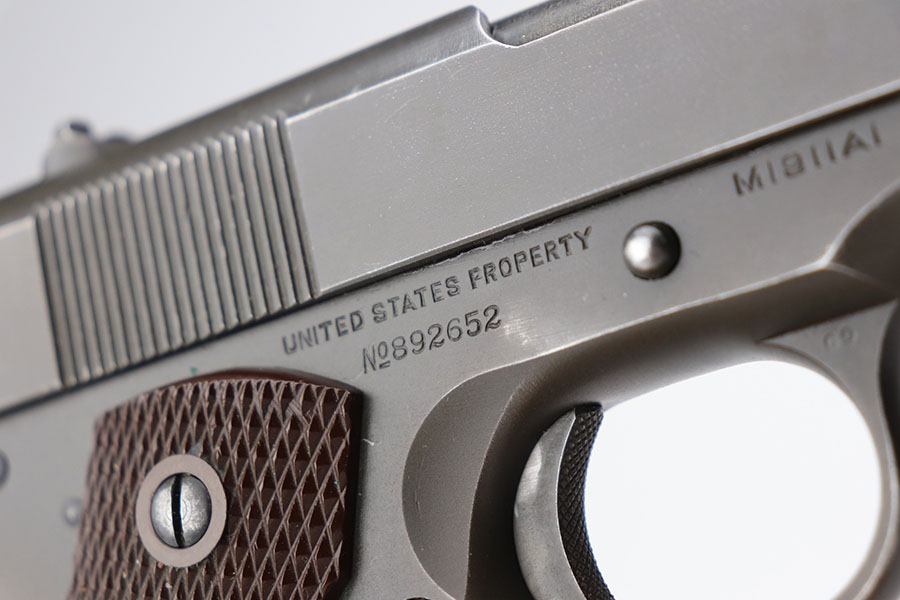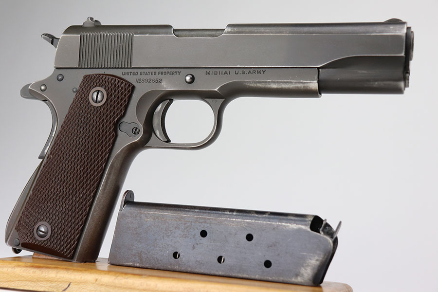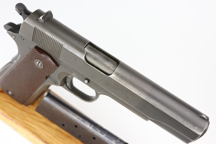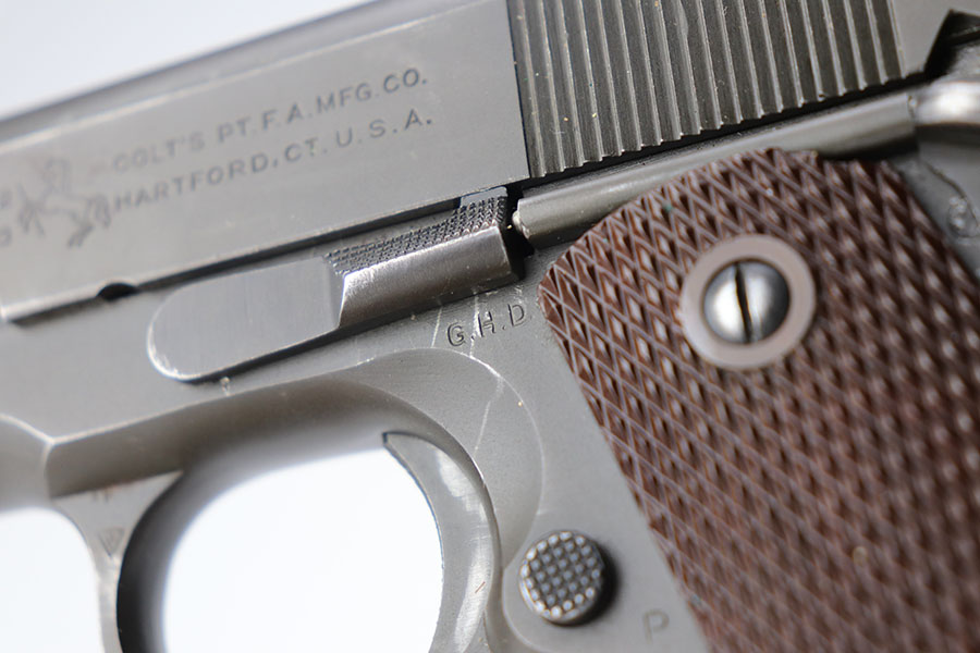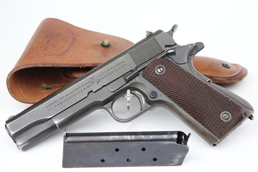 2/1/21 – This is a Colt 1911A1 from 1943 with original holster. The gun has matching serial and slide with correct inspection proofs throughout. Has an original Colt barrel with excellent bore. Most of the finish loss on the pistol is on the high edges of the profile and the front strap. Excellent grips. ‘L’ marked magazine. Original U.S. military holster with Graton & Knight maker mark.