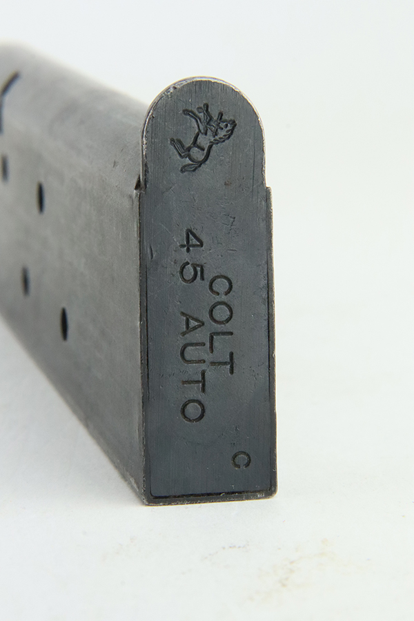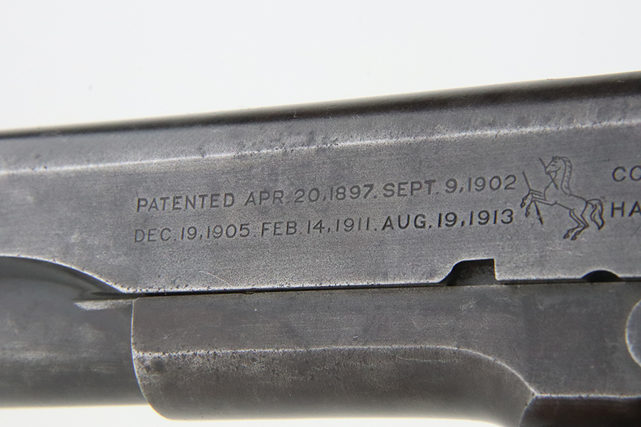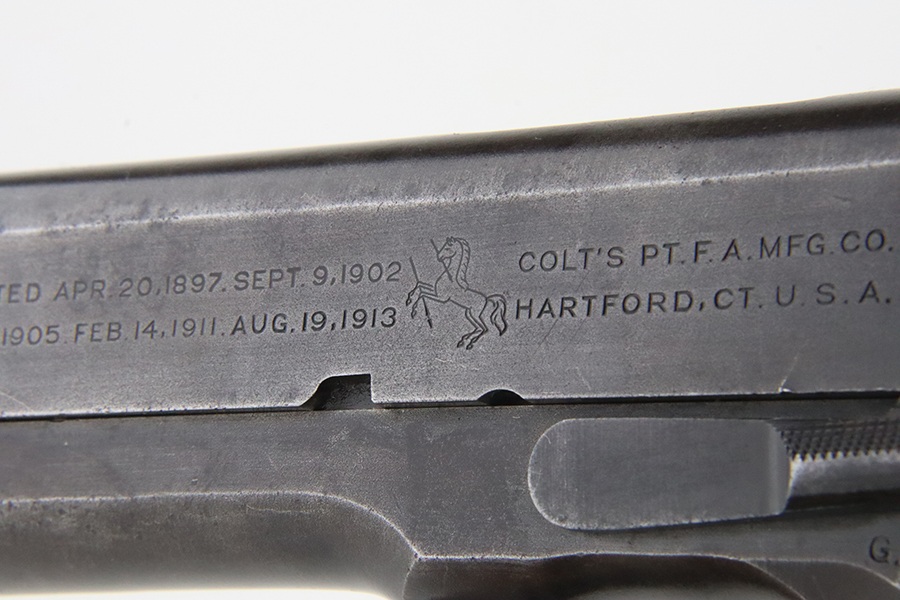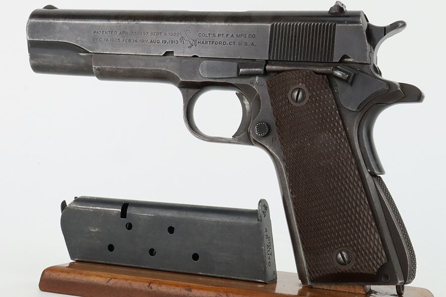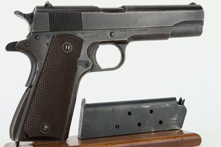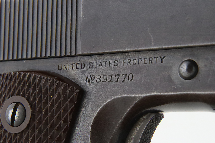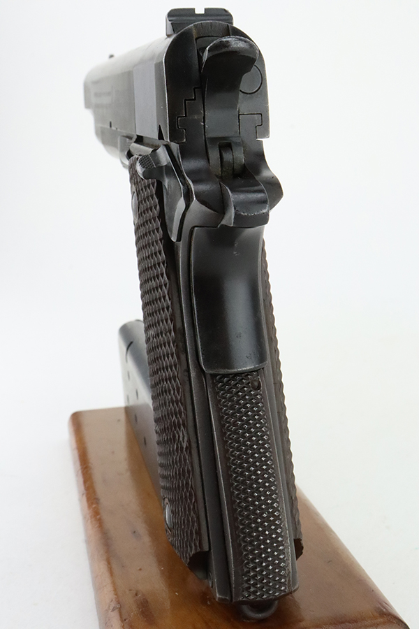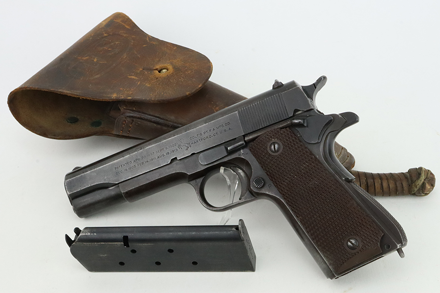 1/31/24 – This is a nice example of a Colt Model 1911A1 issued to the US military in 1943. The slide is numbered and matching. It has the proper cross-canon cartouche and “GHD” inspector initials. It comes as a rig with a post-war magazine and a WWI, 1917-dated 1911 holster. The original finish on the gun rates roughly 70% with minor thinning and spotty patina throughout. Some areas of tiny pin-pricking here and there. Fitted with period-correct reddish-brown plastic grips. The rifling in the bore is a bit worn with pin-pricking throughout.