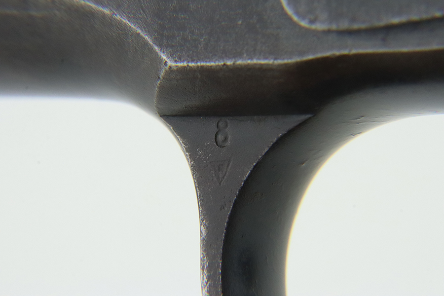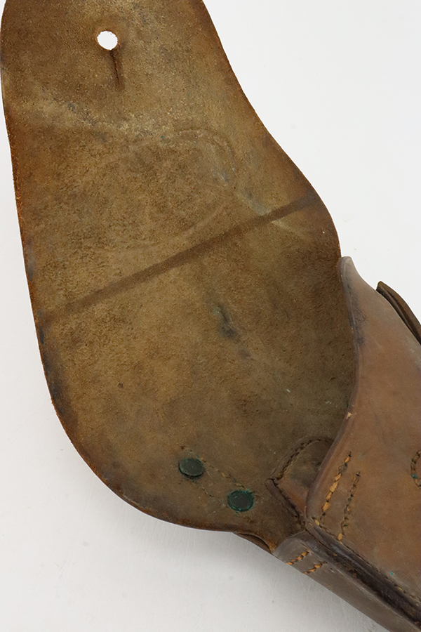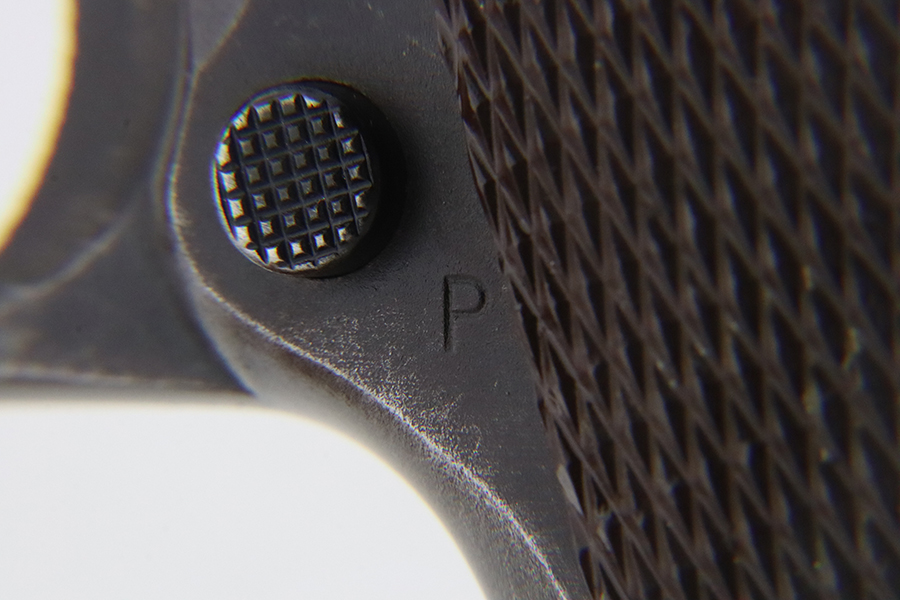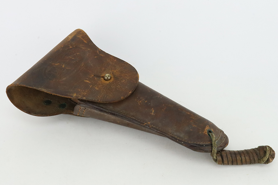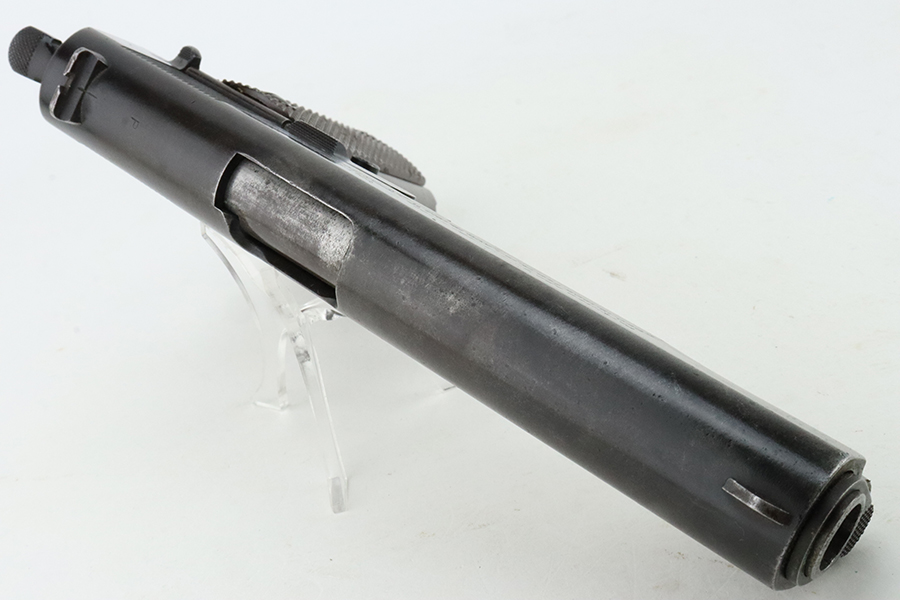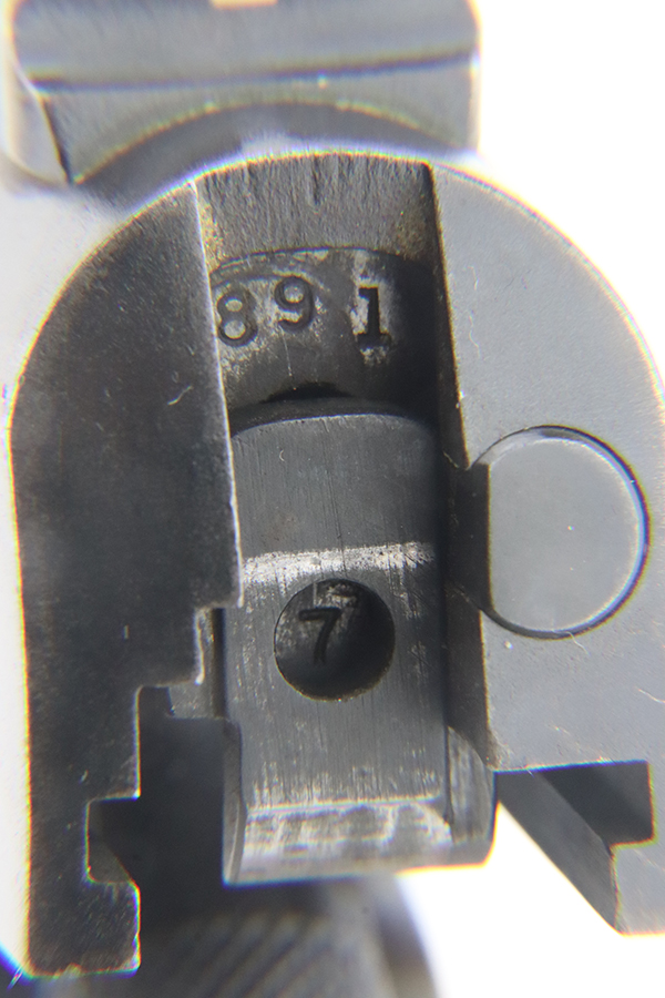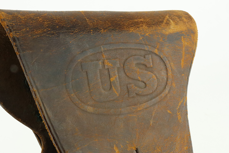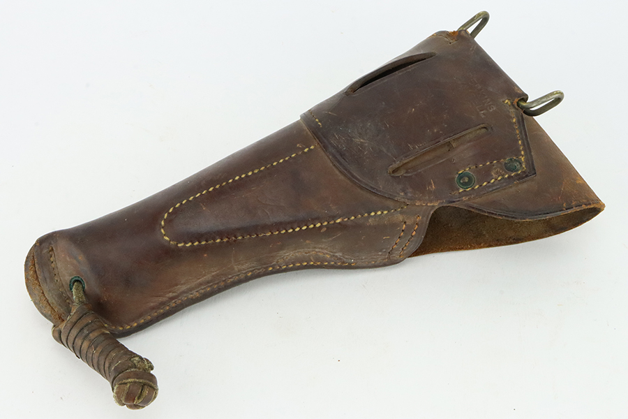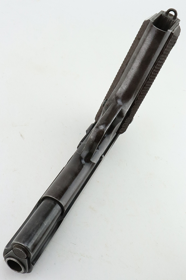 1/31/24 – This is a nice example of a Colt Model 1911A1 issued to the US military in 1943. The slide is numbered and matching. It has the proper cross-canon cartouche and “GHD” inspector initials. It comes as a rig with a post-war magazine and a WWI, 1917-dated 1911 holster. The original finish on the gun rates roughly 70% with minor thinning and spotty patina throughout. Some areas of tiny pin-pricking here and there. Fitted with period-correct reddish-brown plastic grips. The rifling in the bore is a bit worn with pin-pricking throughout.