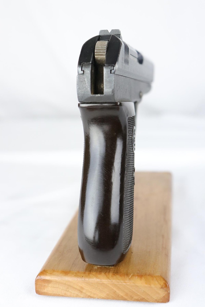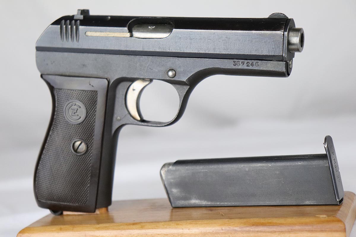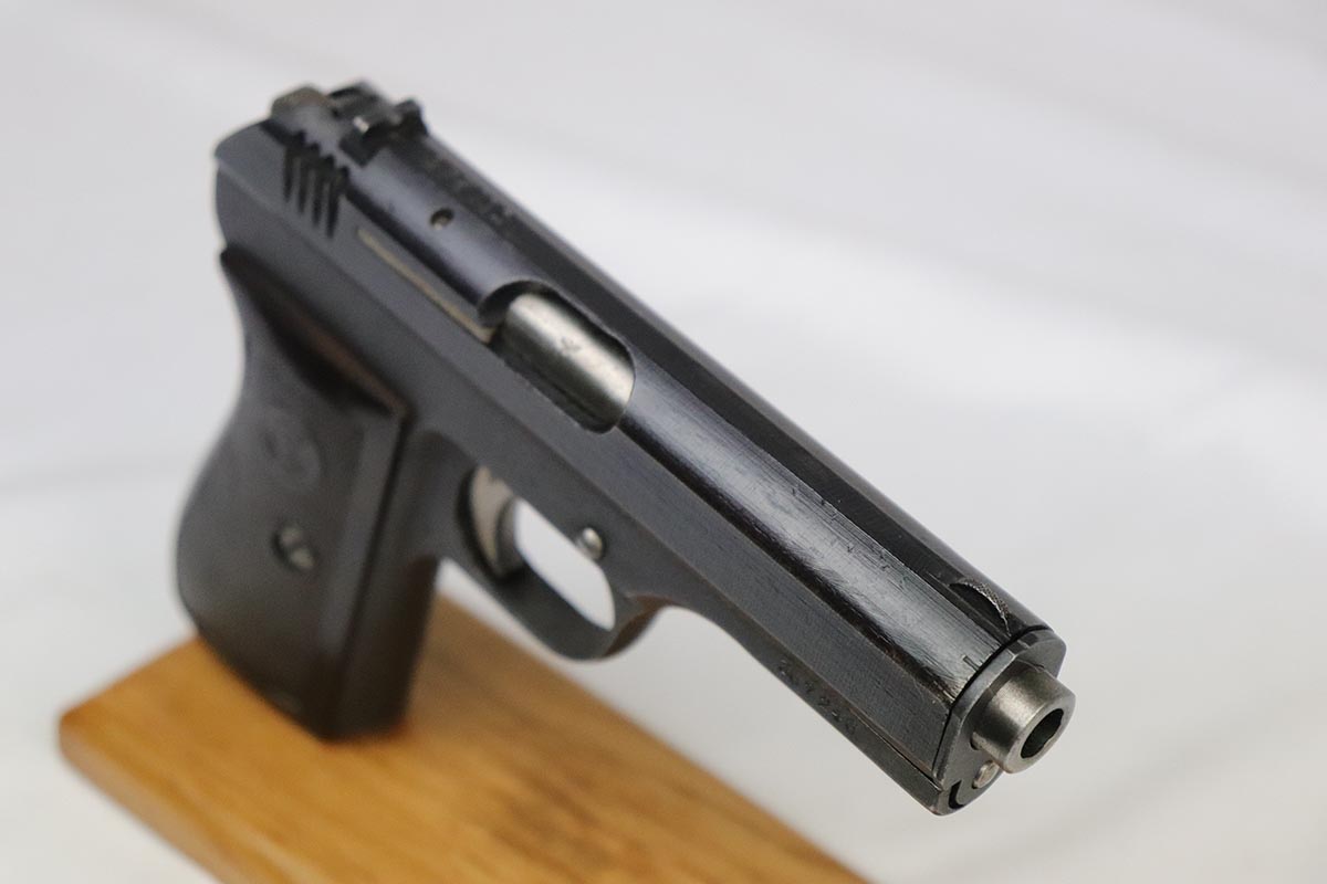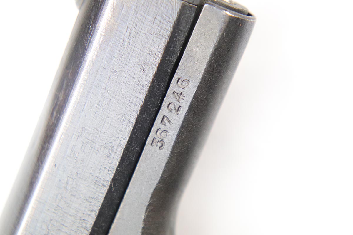 4/30/18 – This is an excellent wartime production example of a CZ model 27. The pistol is in excellent condition overall that we rate in 98%. The only wear is some straw finish loss on the trigger, and a small hairline crack on the right grip panel (top right corner – see photos). The pistol finish is excellent overall though and the ejector has nice straw finish. The bore is minty condition as well. Comes with a period correct magazine, and is guaranteed original and fully functional.